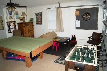 The garage of this villa has been converted into a games room that provides a pool table, a dart board and a foosball table. There’s also a small table with 4 small chairs that’s been especially designed for young children. Here children will be able to play board games or draw.