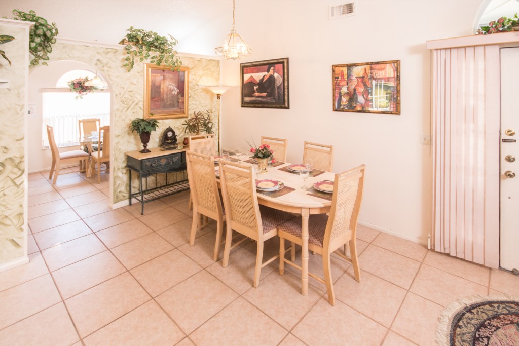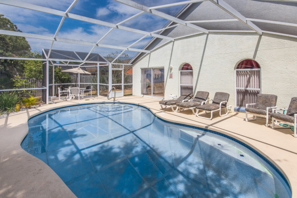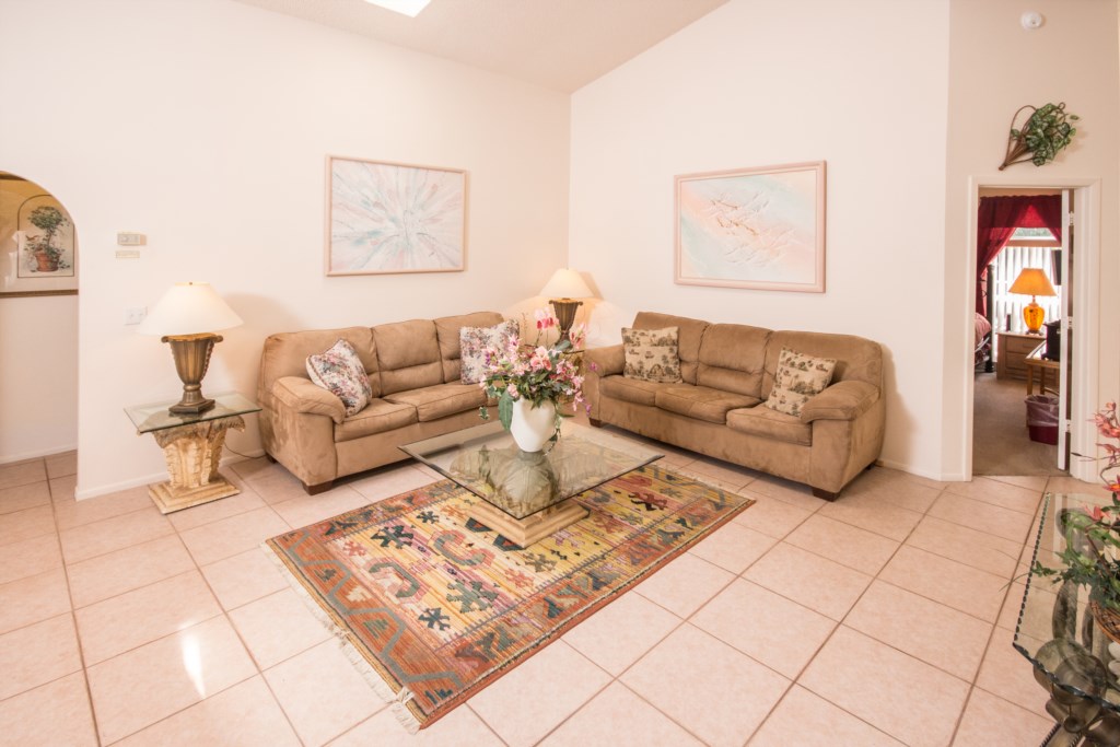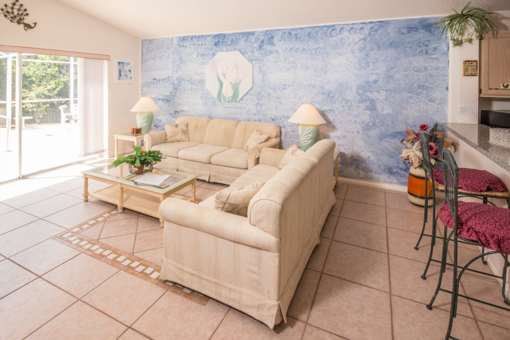 This vacation villa has an open, spacious feel to it thanks to the vaulted ceilings throughout the house. The fully-equipped kitchen has plenty of countertop space, modern appliances, a breakfast bar with two stools, and a small breakfast nook with seating for four. There is also a formal dining room that has seating for up to 6. There are two livings areas: a formal and an informal living area. The informal living area is at the front of the house and has two comfortable sofas to sit down on and have a quiet conversation with others. The formal living area ahas two sofas, a TV for your entertainment, and a patio door that leads straight to the pool deck area. The pool area is screened-in and as chairs and sun loungers dotted around the large pool.