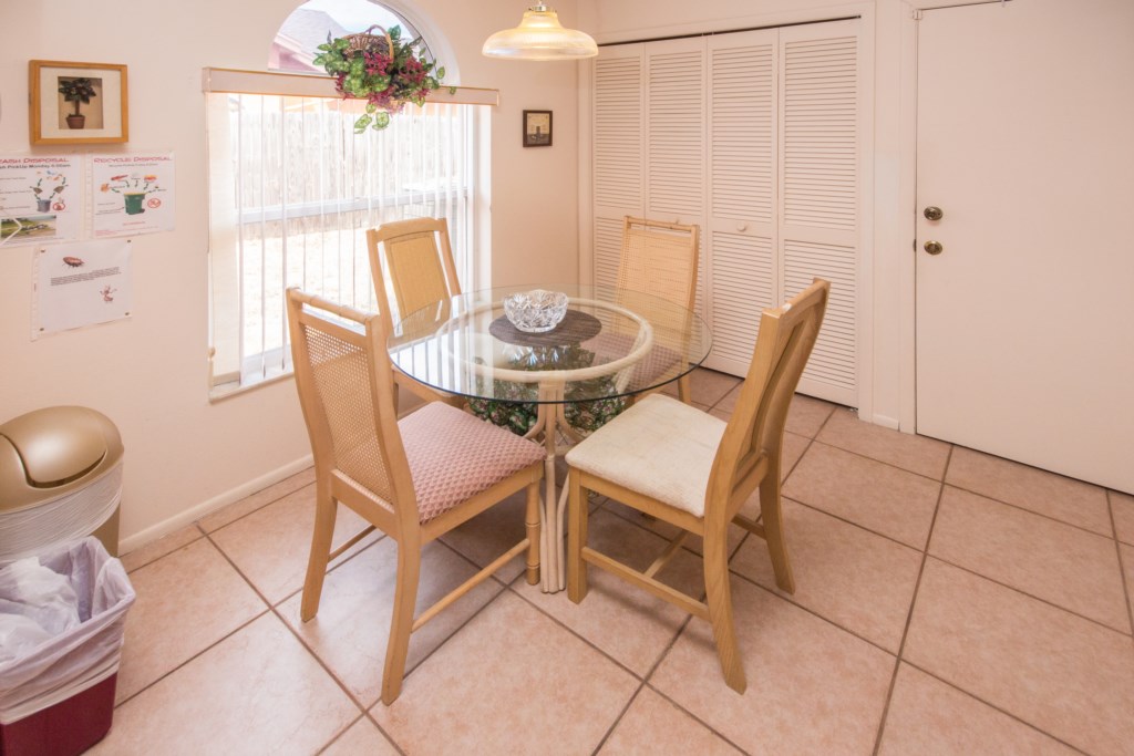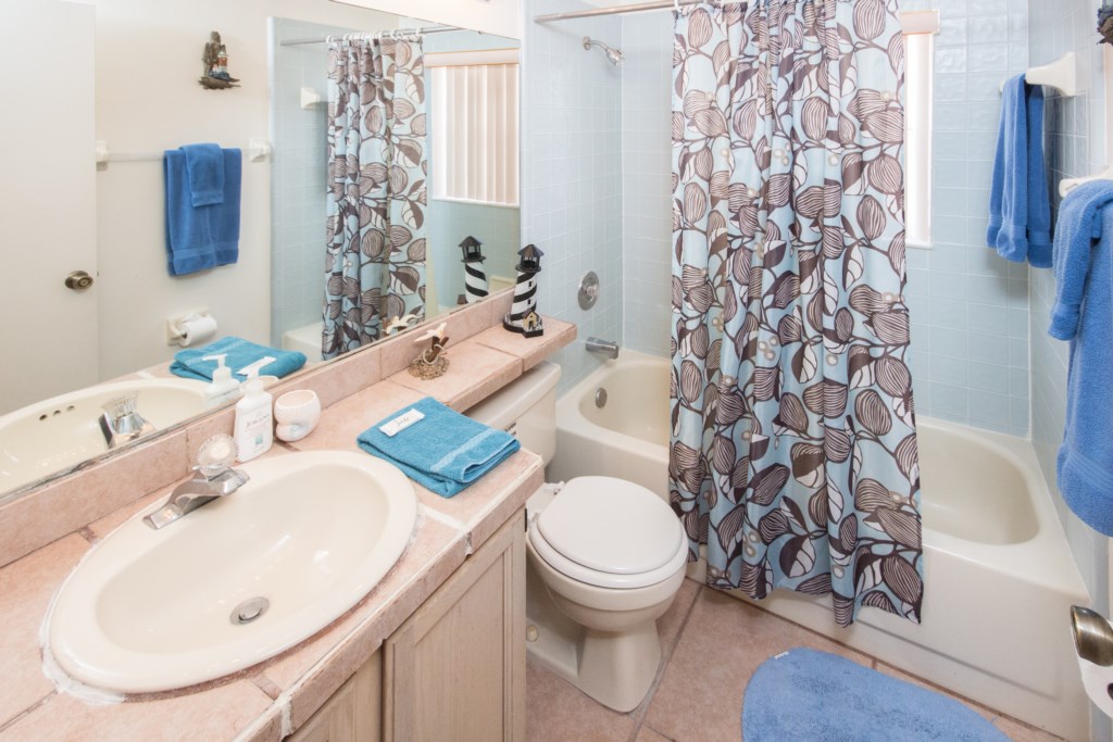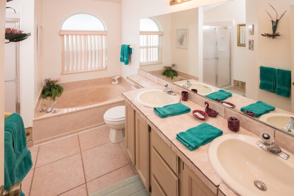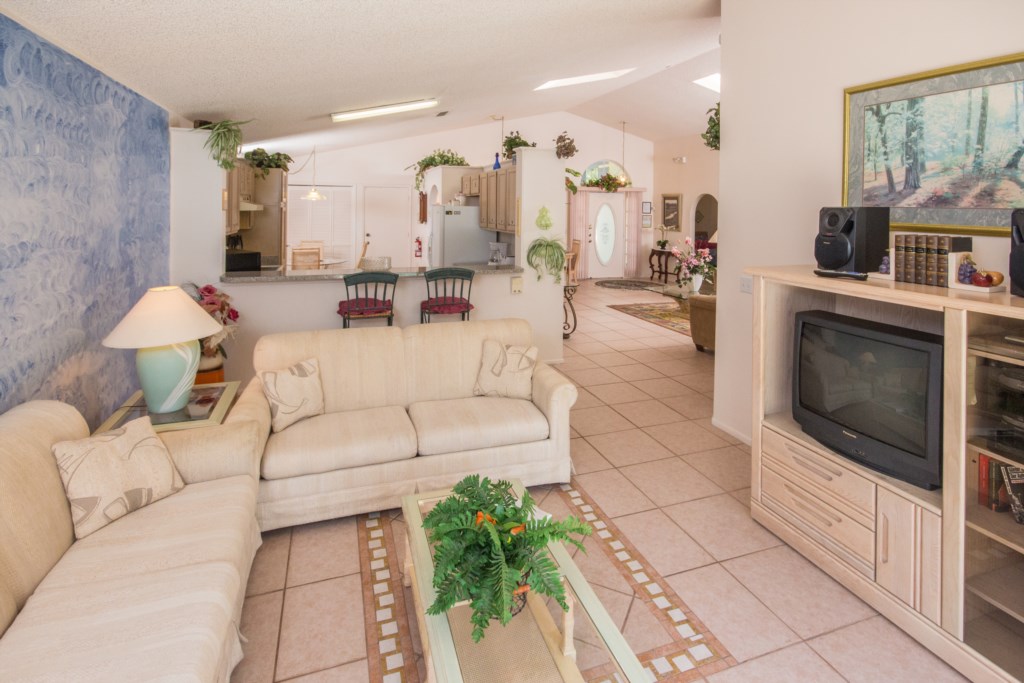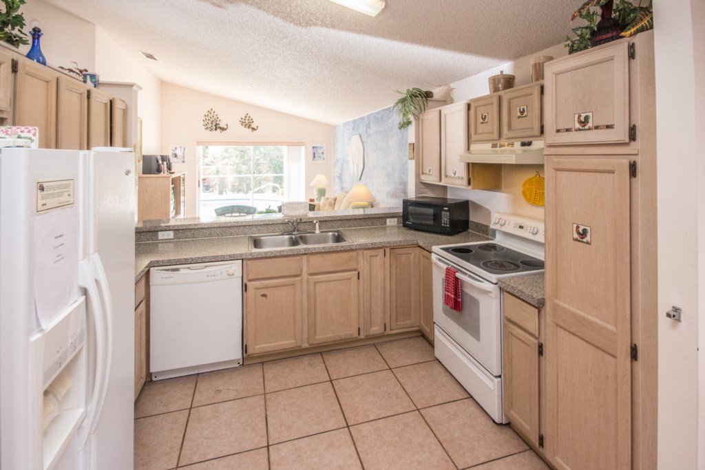 This vacation villa has an open, spacious feel to it thanks to the vaulted ceilings throughout the house. The fully-equipped kitchen has plenty of countertop space, modern appliances, a breakfast bar with two stools, and a small breakfast nook with seating for four. There is also a formal dining room that has seating for up to 6. There are two livings areas: a formal and an informal living area. The informal living area is at the front of the house and has two comfortable sofas to sit down on and have a quiet conversation with others. The formal living area ahas two sofas, a TV for your entertainment, and a patio door that leads straight to the pool deck area. The pool area is screened-in and as chairs and sun loungers dotted around the large pool.