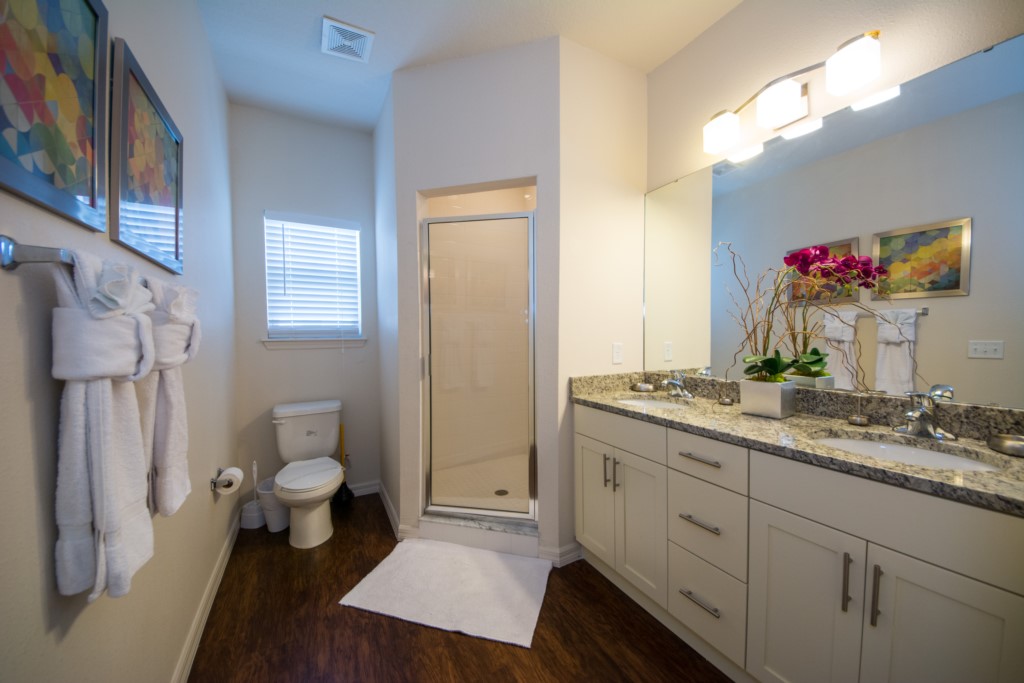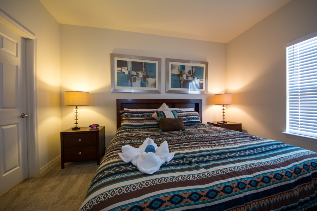 There are 4 bedrooms- On the 1st floor there is a master suite with a king sized bed and private bathroom. On 2nd floor, the 2nd master suite has a king sized bed with private bath, and the other two bedrooms each have 2 twin beds. The other bathroom is conveniently located for the other guests. 8 guests can fit comfortably in this home. All bedrooms come equipped with a flat screen television.