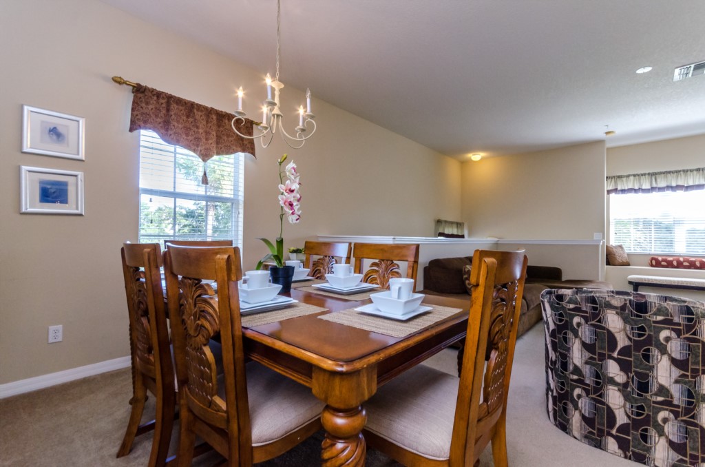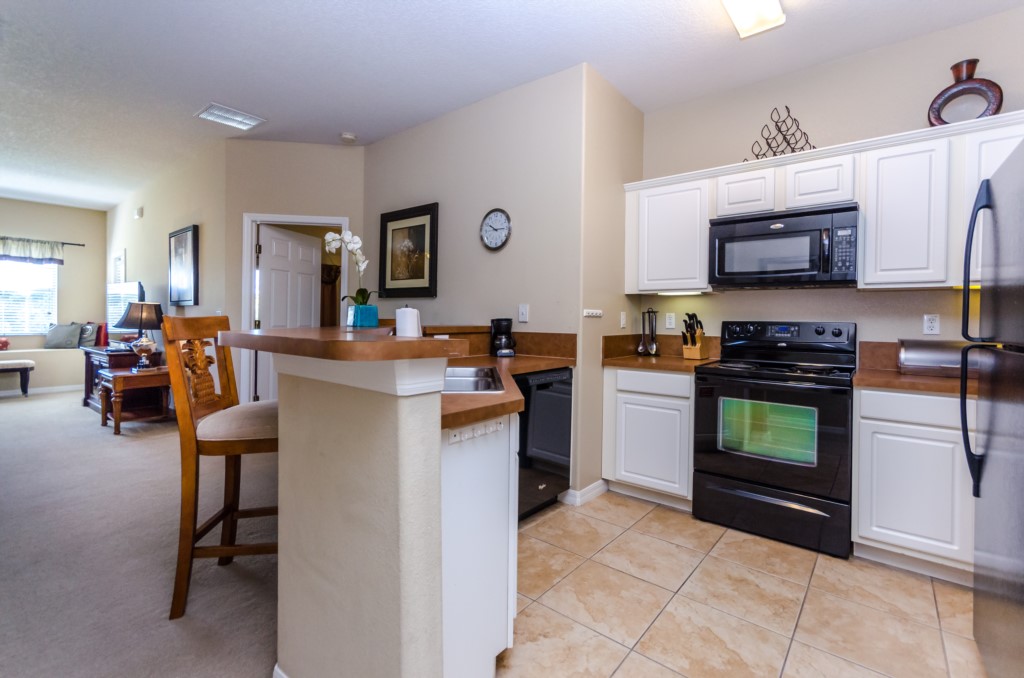 The kitchen is open to the family room and is fully equipped including all dishware, cookware and utensils. The fridge has an ice maker. In addition to the kitchen, the dining room table is set to accommodate 6.