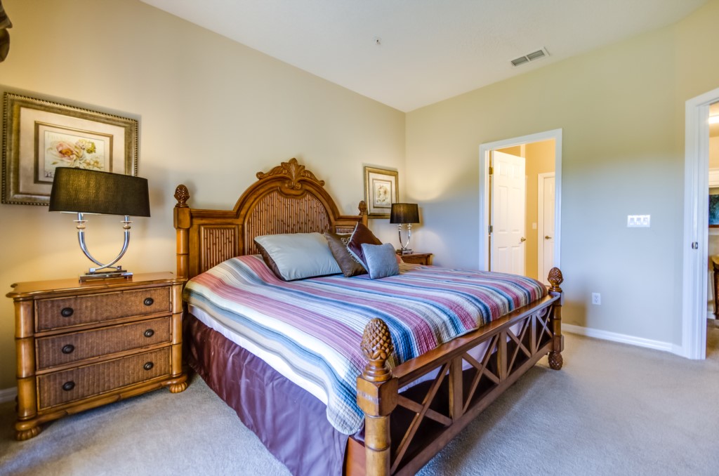 The master bedroom has a king size bed and an en-suite bathroom.