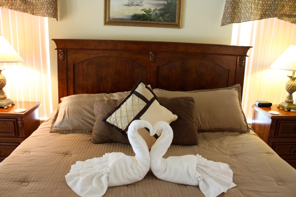 There are 4 bedrooms. Bedroom 1, the master bedroom, has a king-size bed and an en-suite bathroom with shower and garden tub. The second bedroom has a queen-size bed. The third and fourth bedrooms each have two singles beds. There is a flat screen TV and DVD player in the living room and in the master bedroom.