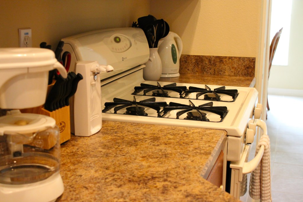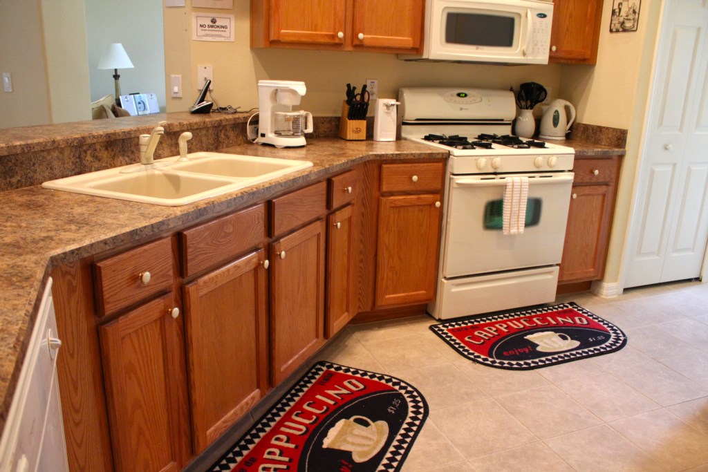 The living room is small and cozy. It has 2 comfortable sofas, an arm chair and a flat screen TV. This is perfect place to curl and watch some TV. The large, fully-equipped kitchen comes with plenty of counterspace, a breakfast bar, modern appliances, and a breakfast nook with seating for 4.