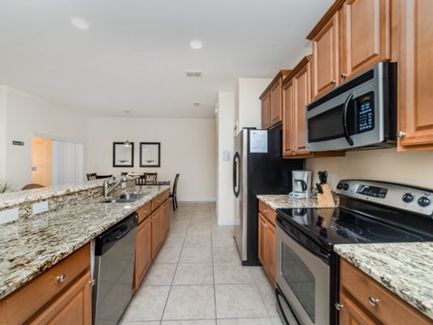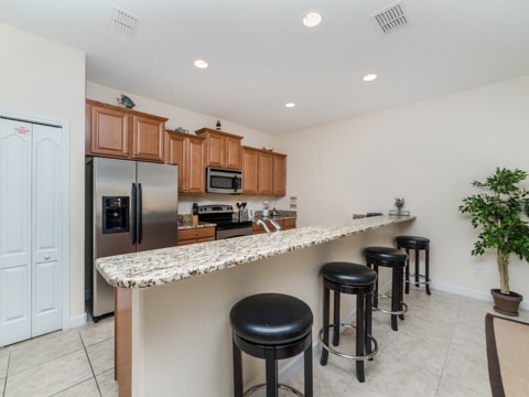 Simplicity and luxury meet at this delightful townhome located in the resort community of Paradise Palms. Four bedrooms and 3 bathrooms make up this perfect piece of paradise. Sleeping a total of 8 guests, this home brings together comfort and style. With 2 king bedrooms, 1 queen bedroom and 1 room with 2 twins, you will be sure to find your place to call home for your stay. The open concept in this townhome contributes to the large and spacious feeling. The living room features a 42” TV as well as cozy couches, perfect for any family movie night. The kitchen is in the middle of the open area, so the chefs of the family are never left out of the conversation. Gorgeous granite, plenty of cabinetry and stainless steel appliances will make you want to cook here. The 6 person dining room and 4 person breakfast bar are the perfect places to enjoy these gourmet meals. If you so choose, dine out on the back patio where the pool is located. This townhome is south facing which also means gorgeous sun all day. Staying in Paradise Palms means having access to the huge clubhouse too! This community is the perfect place to stay on your vacation. We can’t wait to see you here. REMOVED BBQ 10/25/2017- NB