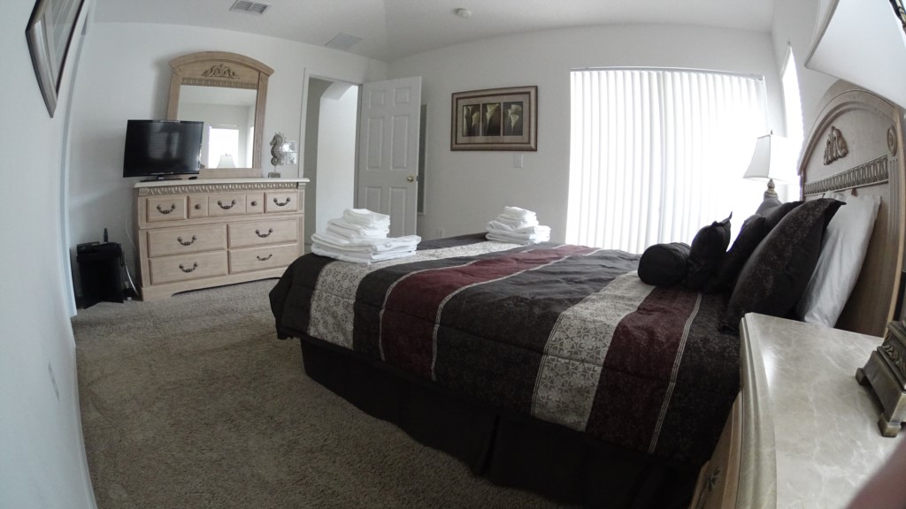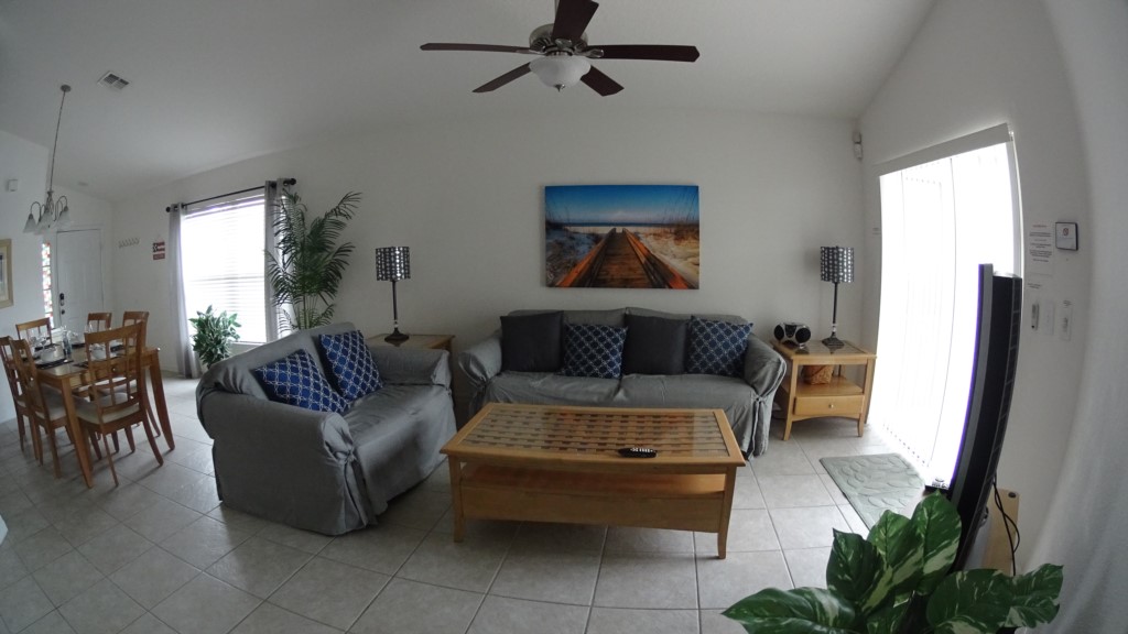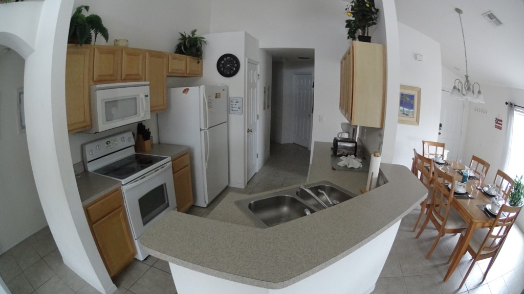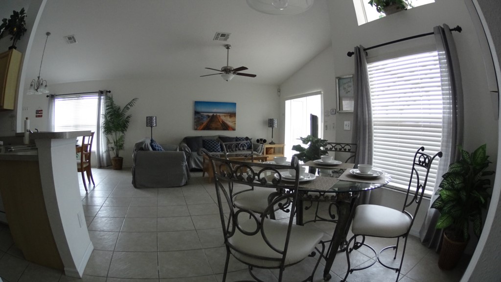 It features 4 bedrooms and 3 bathrooms; very spacious and assures everyone’s comfort. This home offers 2 Master bedrooms with Queens each and 2 other bedrooms featuring 2 Twin beds each. When you first walk in you will be greeted by an open floor plan which includes the Living room and the Dining room with seating for six. The kitchen is fully equipped with small appliances and kitchenware. The corner breakfast nook is perfect for breakfast time with a view of the pool.
