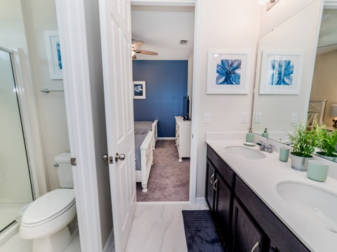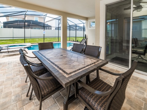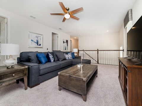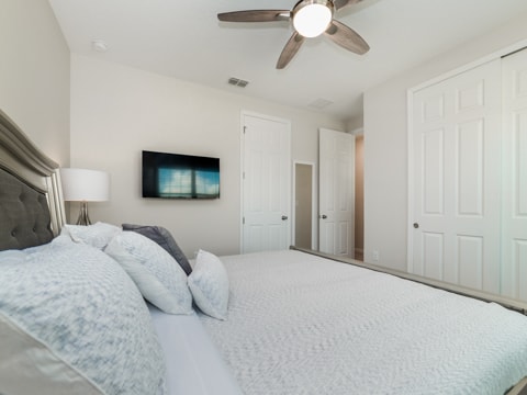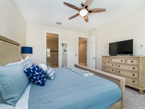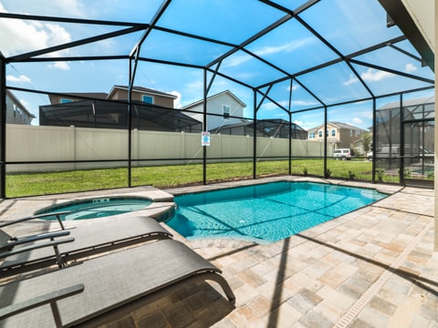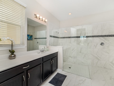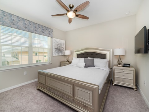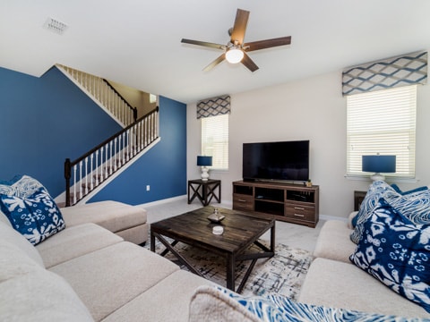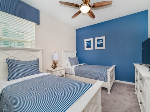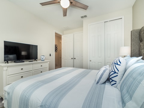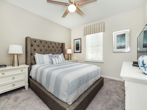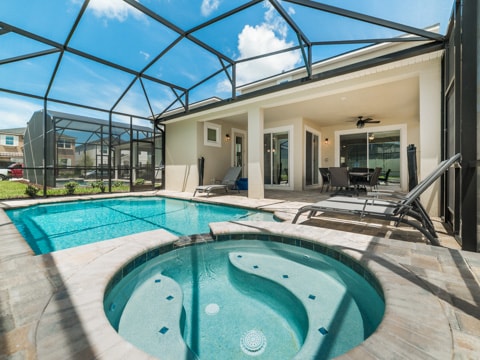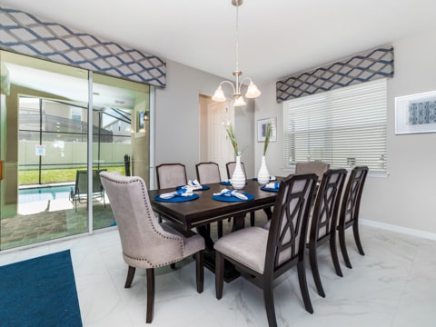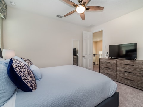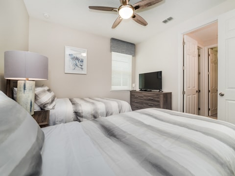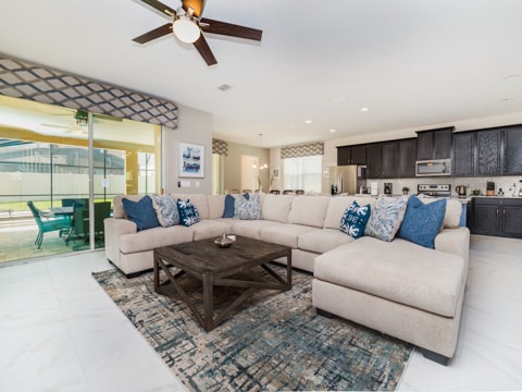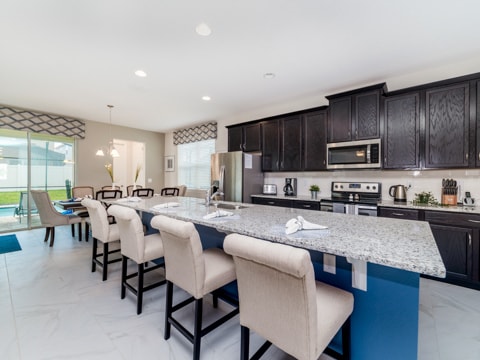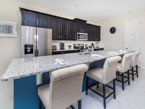 No matter where you go in this vacation home, luxury awaits you. This Solara located home, with 6 bedrooms and 4.5 bathrooms, is the perfect getaway for you and your guests. Beginning with the 5 bedrooms, each is meticulously decorated for your comfort. In each bedroom, neutral colors are used to create your perfect nights sleep. Two rooms with king beds and 2 rooms with queen beds are perfect for privacy and relaxation. Another 2 rooms, both with a twin and double, are great for having your own space as well. Whatever room you decide to call home for your vacation, you are sure to have the beauty rest you deserve! This home has 2 living areas, perfect for when the family can’t agree on a movie for movie nights. The main living room, downstairs, has a gorgeous wraparound couch, huge TV and views of the pool area. The upstairs loft has another 60” TV as well as cozy seating. Back downstairs, the open concept between the living and kitchen area is perfect for big families. The kitchen is nothing short of a chef’s dream with granite countertops, stainless steel appliances and so much more. Cooking for a party is a breeze here with plenty of storage and counter space. The dining room is another great spot to enjoy all of your hard work while you chat about stories and memories from your vacation. Last but certainly not least, be sure to enjoy your very own private pool and spa. A south facing pool means sun all day long which is exactly what you will love here in Florida. Book your stay today and let the memories begin in this gorgeous Solara home!