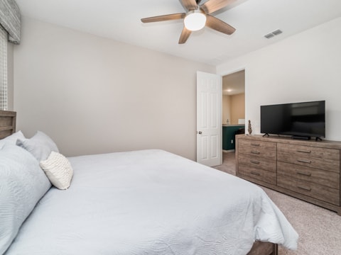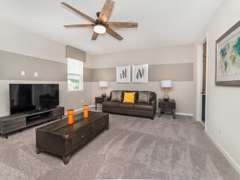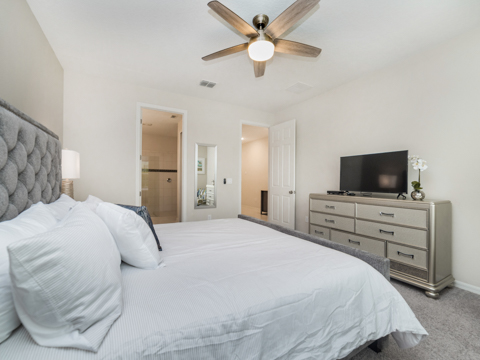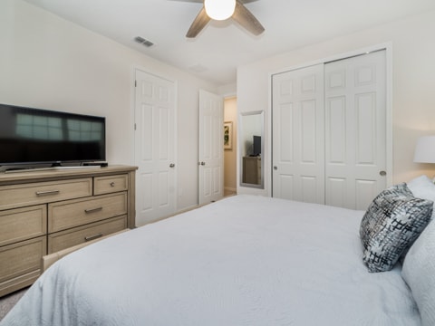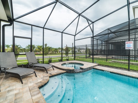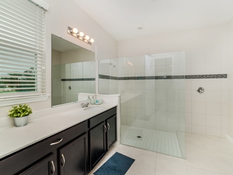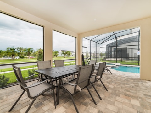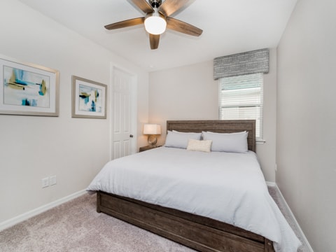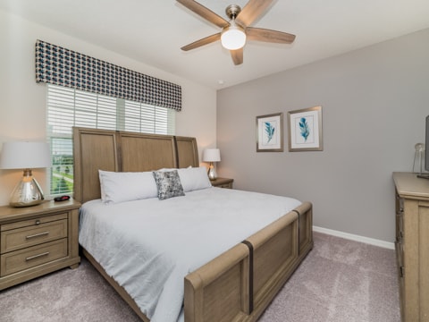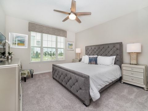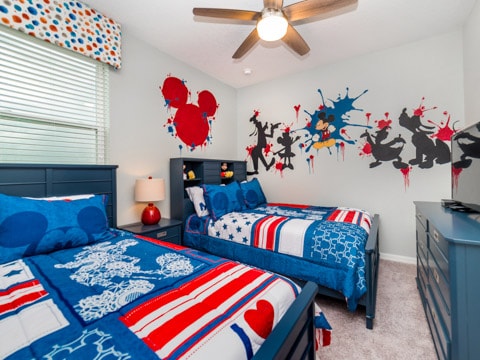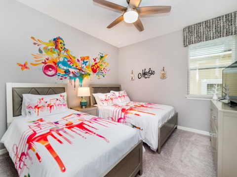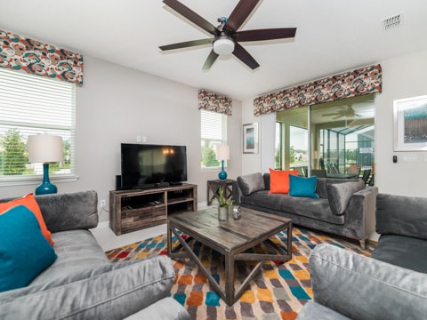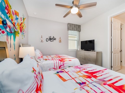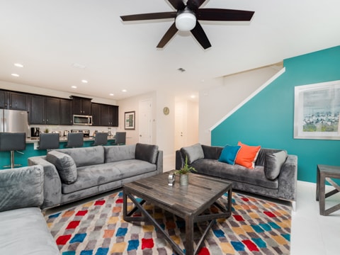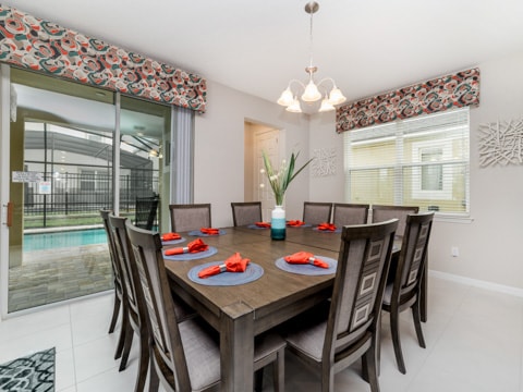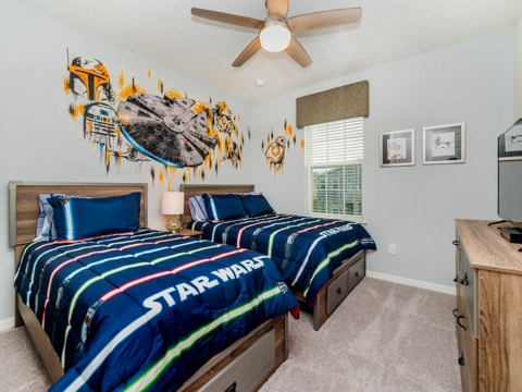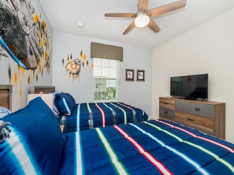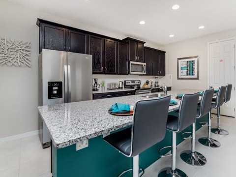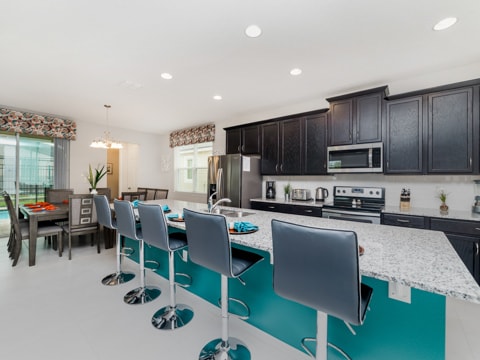 Tucked away in the heart of Solara lies this gorgeous 6 bedroom, 4.5 bathroom home. Pops of color, an open concept, and relaxation await you in this home away from home. The living room is filled with cozy couches for movie nights and hanging out. With views of the pool and a 55” TV, you’ll always be entertained. The living room overlooks the kitchen which has all the comforts of home plus a little more. A luxury kitchen, with granite countertops, stainless steel appliances, and wood cabinetry make for the perfect spot to cook homemade meals or happy hour snacks. Whatever you choose to make, you’ll be ready to do all your cooking here. Enjoy the fruits of your labor in the 10-person dining room or the 4 person breakfast bar, both of which look over the pool. The 6 bedrooms in this home sleep a total of 17 guests perfectly. Three bedrooms have king beds, while the other 3 have both a twin and full bed. Each room here is meticulously designed just for your stay. The 3 king bedrooms have warm neutral colors, perfect for relaxation while the other 3 have a Star Wars, Disney and music theme. No matter which room you choose, there is no doubt you’ll get the perfect night's rest. This home also has a washer and dryer as well as free WiFi for you to use at your convenience. The best part of this home is the private pool in the back. The pool and spa are the perfect places to spend your days and nights while you’re in Florida. With a south facing pool, you have sun all day for the best pool weather. Not only that but you have access to the Solara clubhouse which has a huge pool, fitness center, and so much more. Book your stay today!