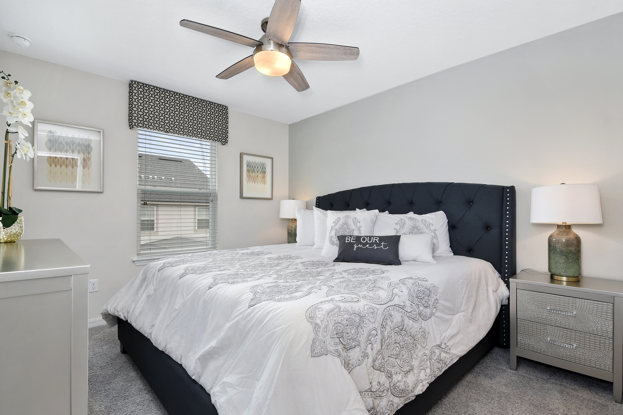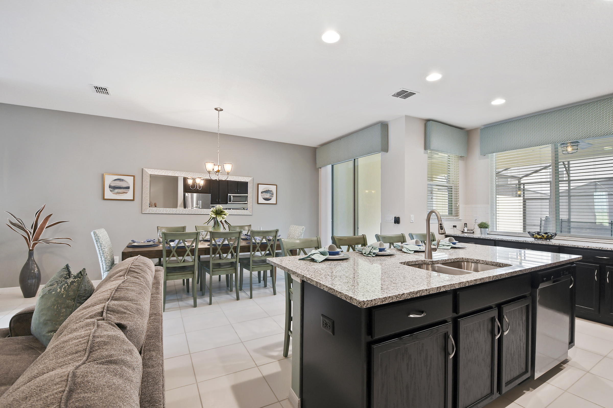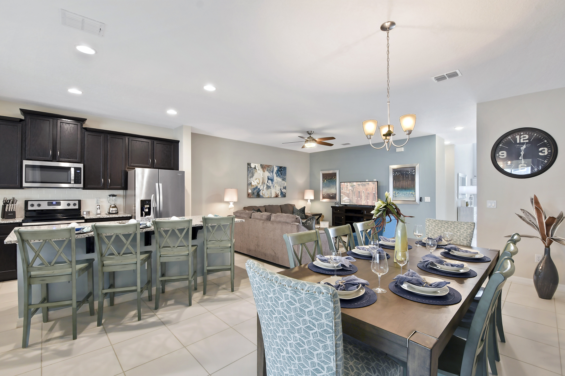 "Be Our Guest" in this beautiful 4 bedroom, 4-1/2 bath townhome newly built in 2018. Professionally decorated by one of Orlando's best interior decorators with all the comforts of home and more. The spacious home includes a modern kitchen with new stainless steel appliances and granite counter tops to cook your home-made meals. Enjoy family meals together, dining table seats 8 with additional seating for 4 at the breakfast bar; we also include a high chair for your little one to dine! All cookware and utensils are provided for your convenience.