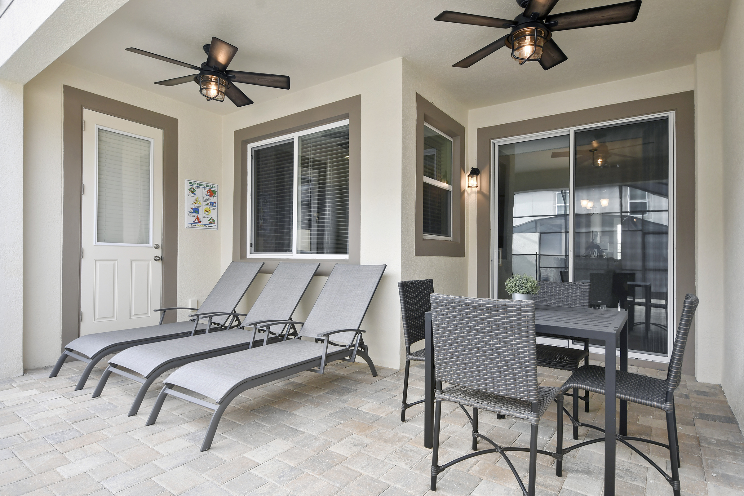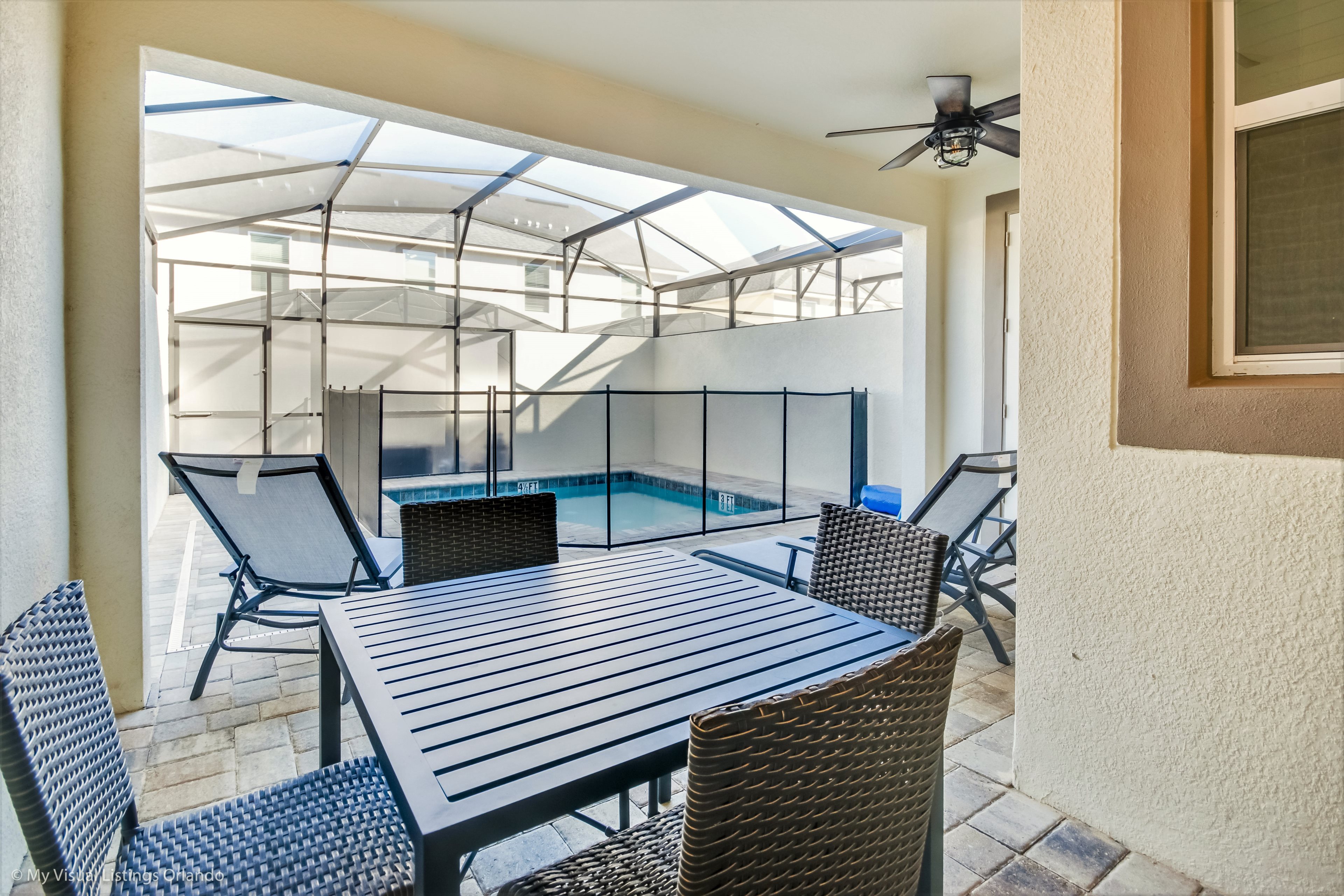 Private screened-in patio with Splash Pool and outdoor dining table and sun loungers. BBQ rental is available.