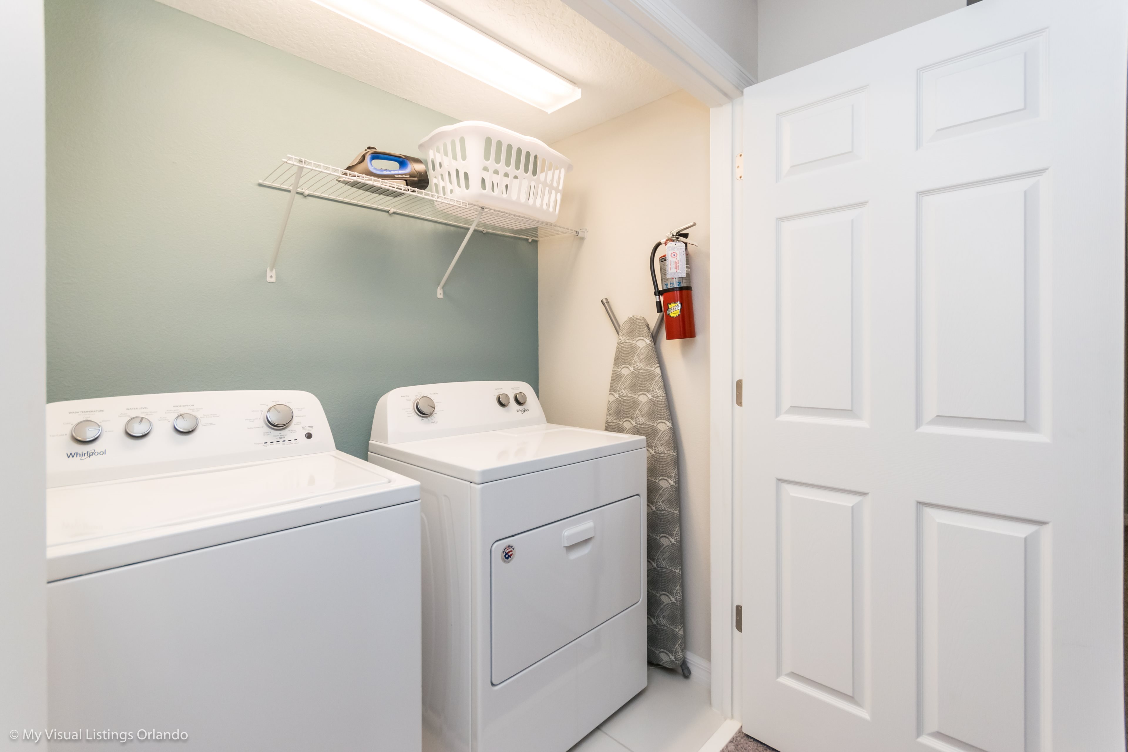 Full-size Washer/Dryer with ironing board and iron.