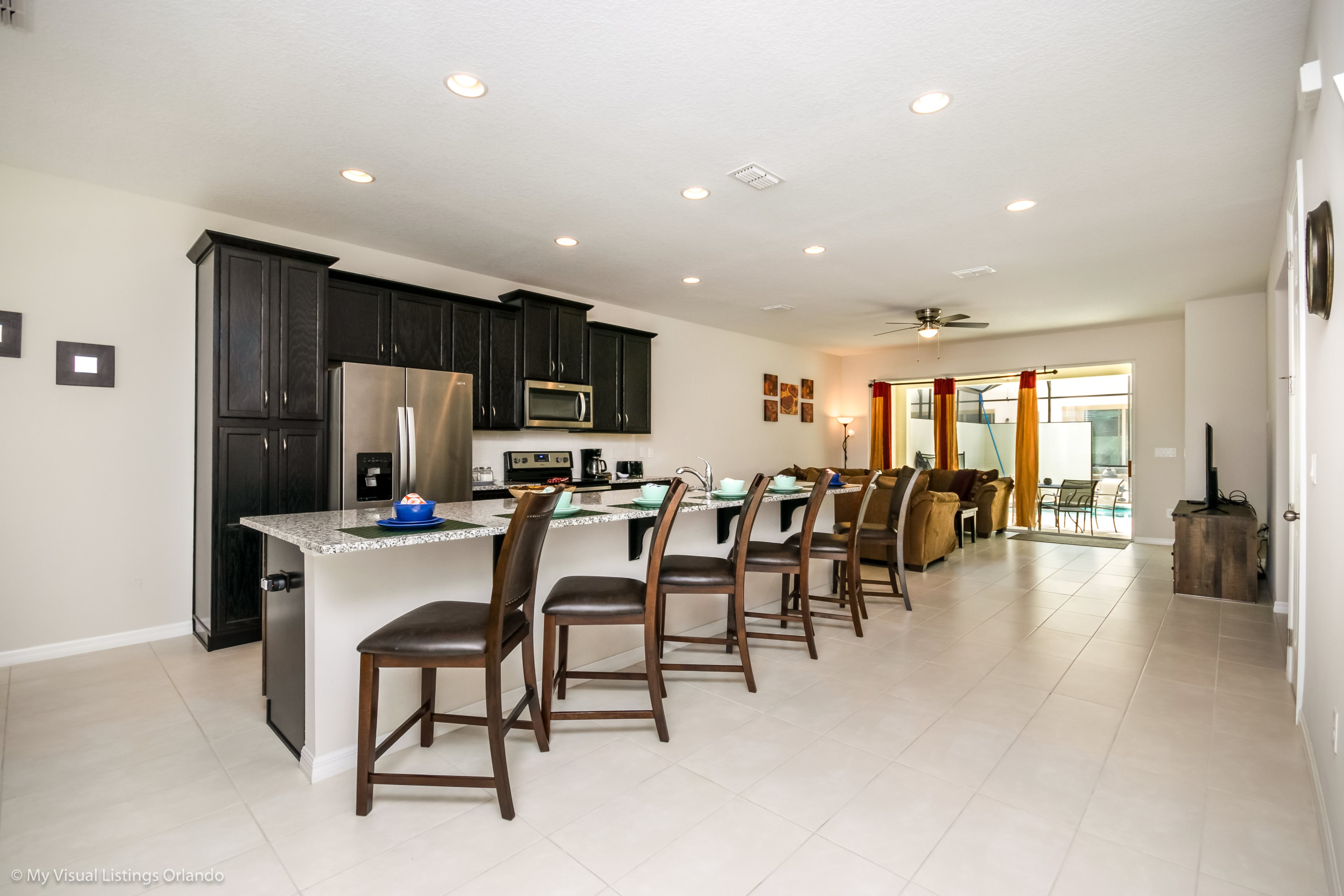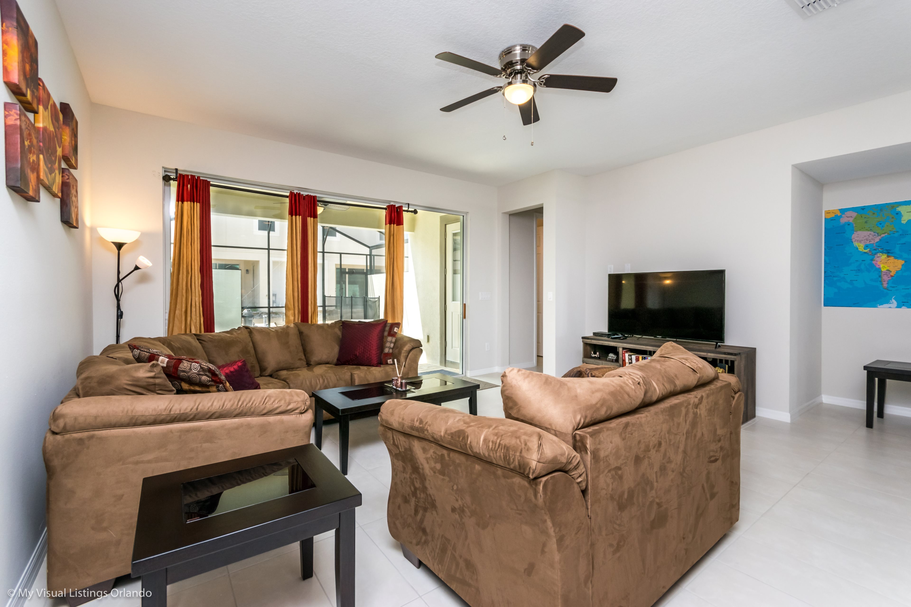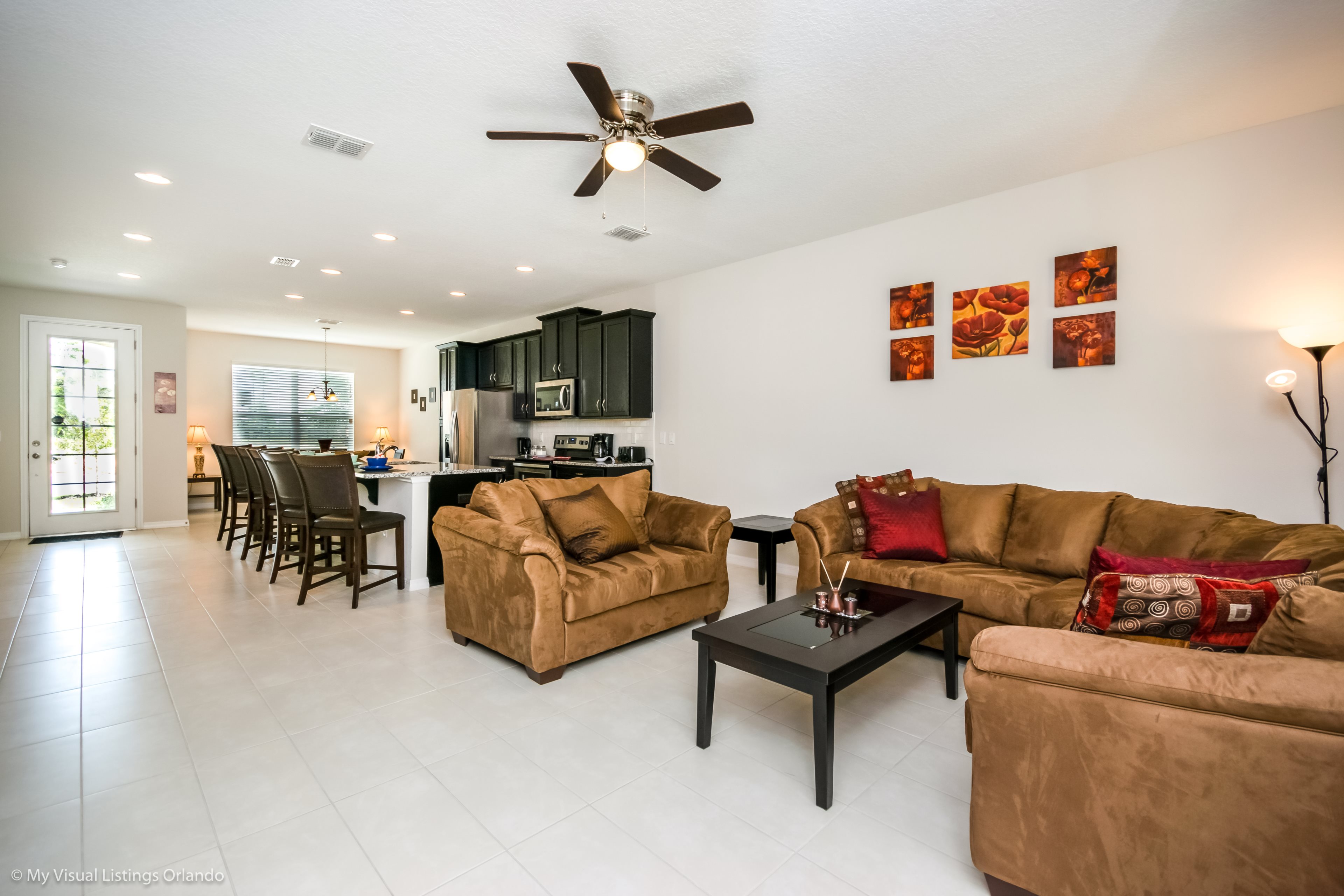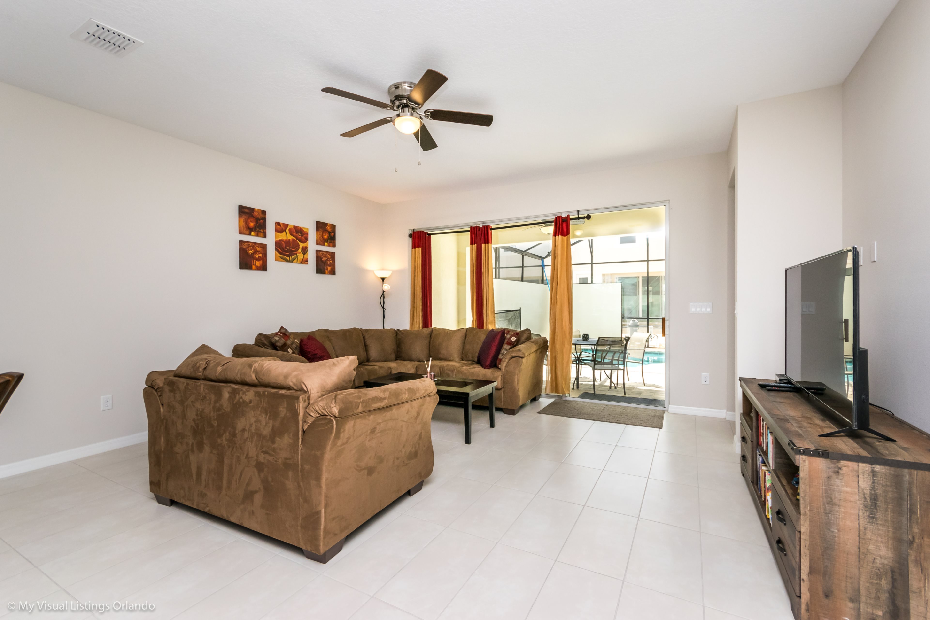 Lounge around after a long day at the parks in the open floor plan gathering room featuring 2 sofas and a large 50-inch flat screen TVr. Step outside onto the patio to enjoy your very own private Splash Pool with screened enclosure that also has a 1/2 bath.