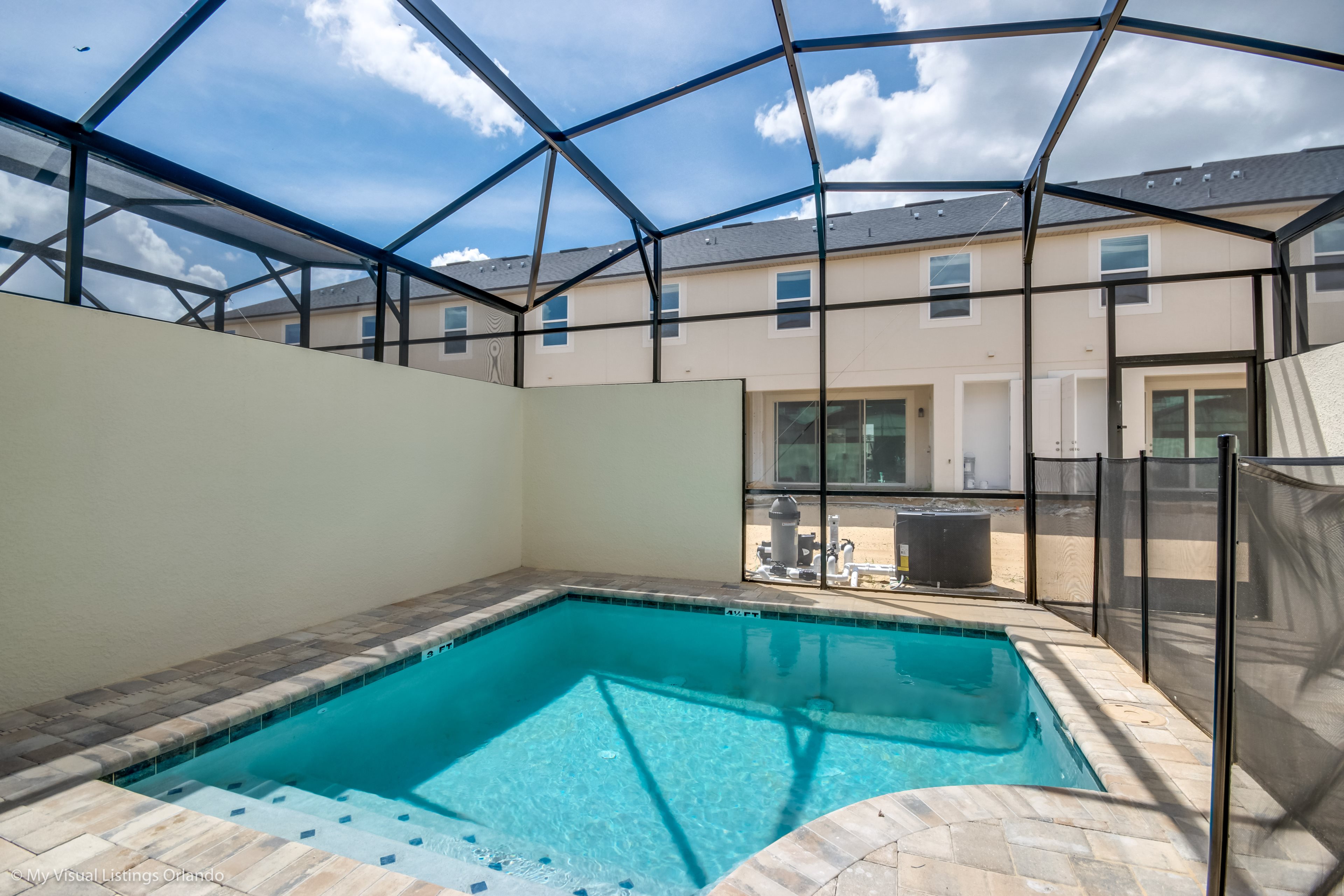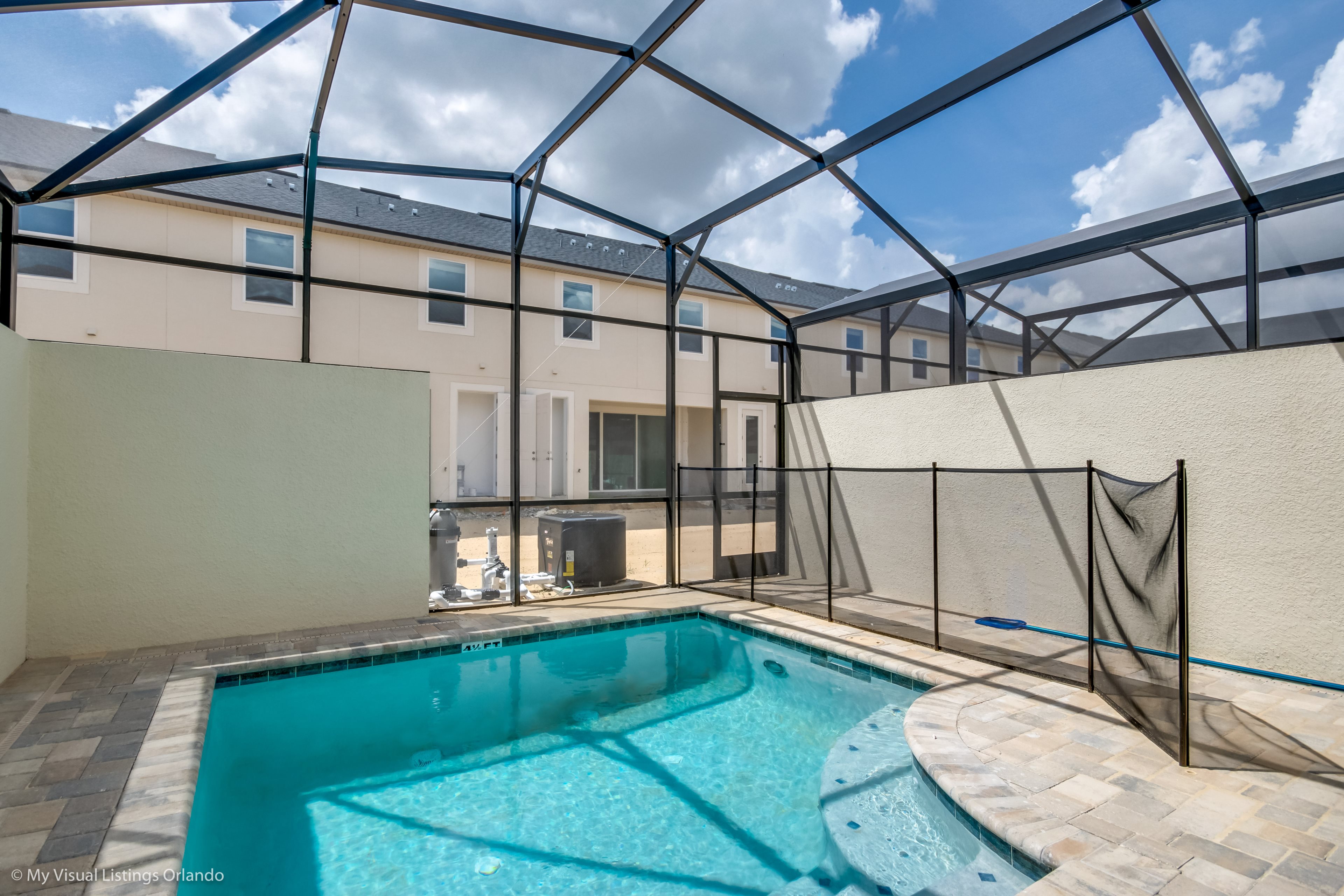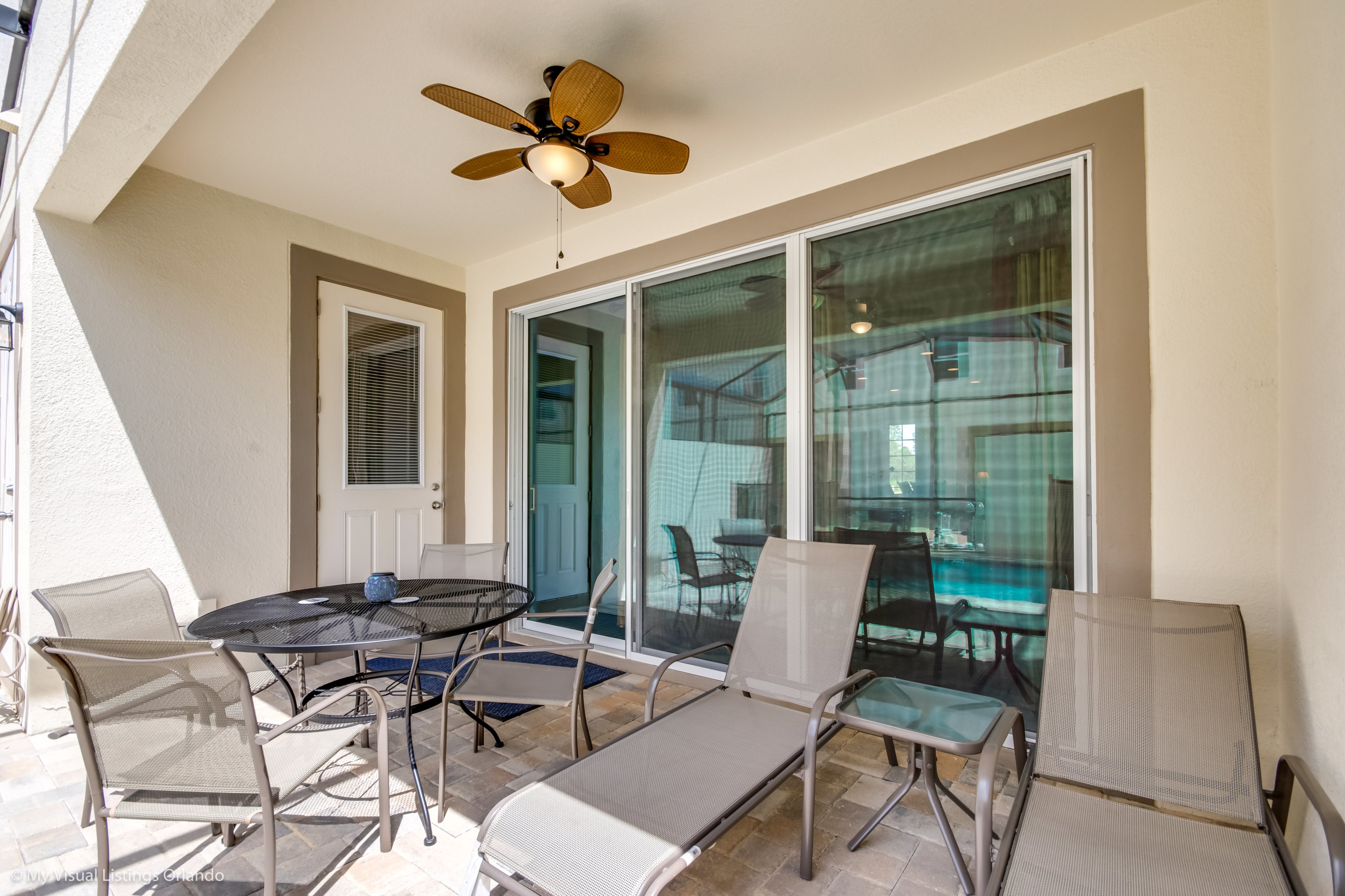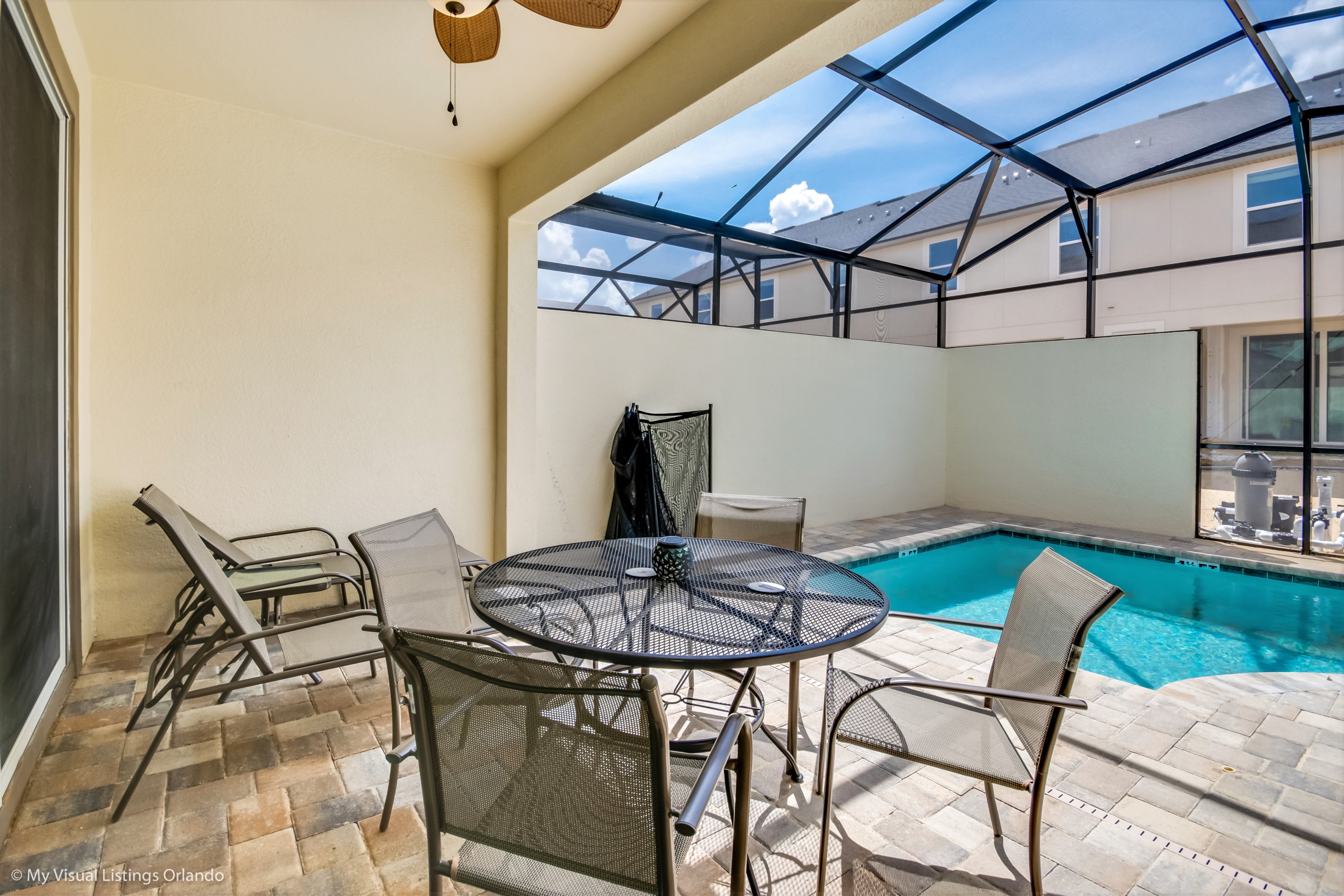 Private screened-in patio with Splash Pool and outdoor furniture. BBQ rental is available.