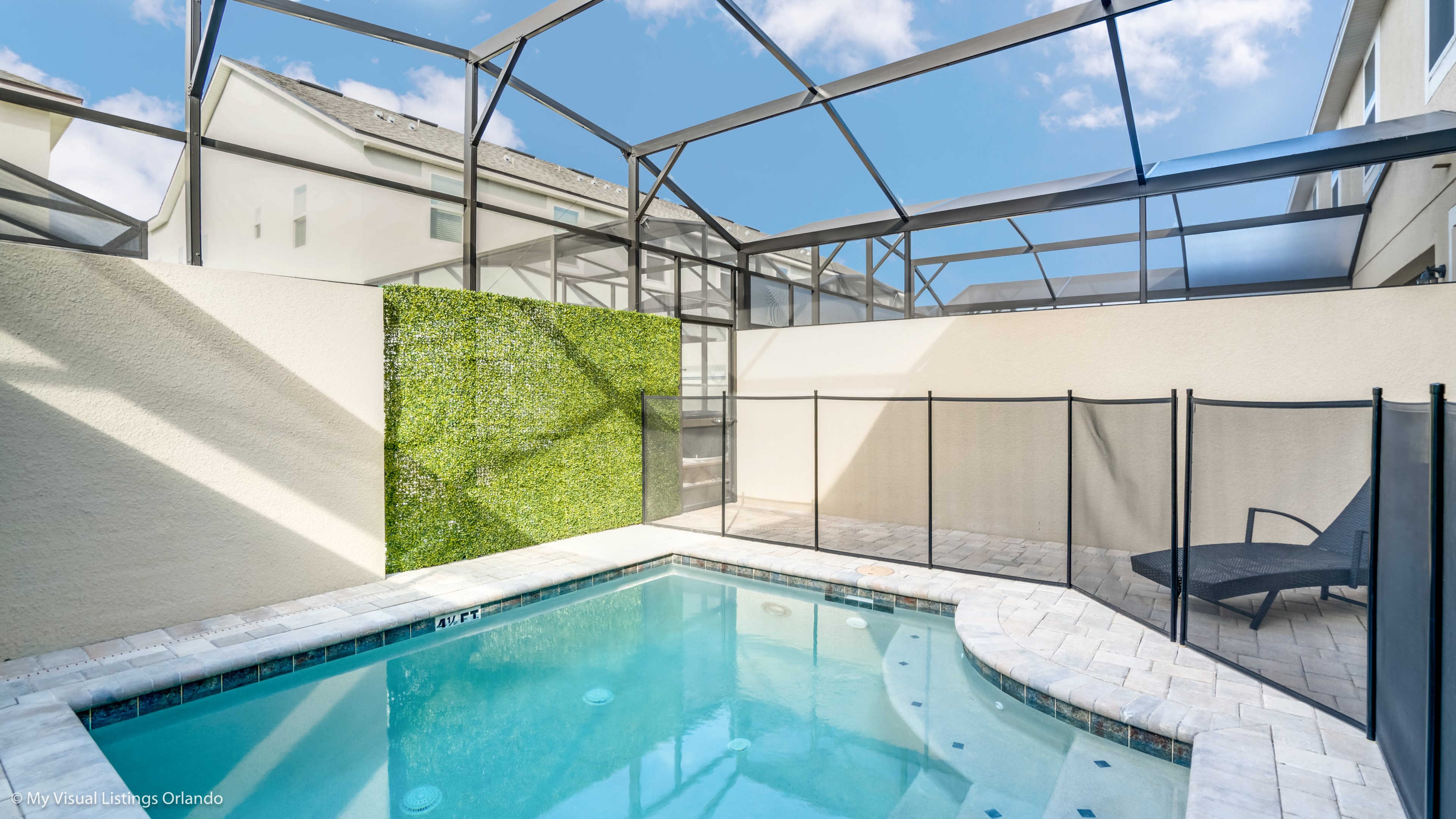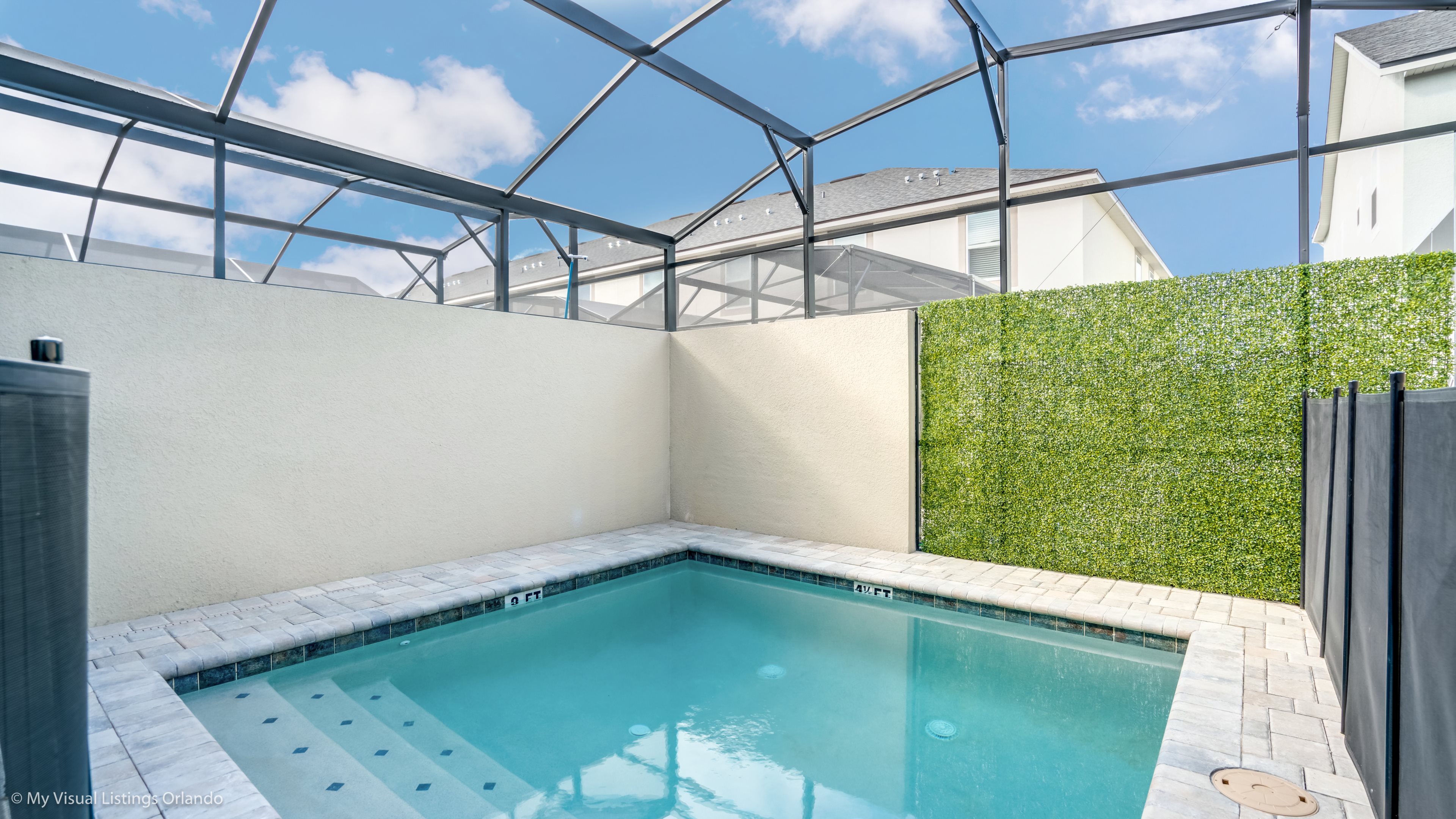 Private screened-in patio with Splash Pool and outdoor furniture. BBQ rental is available.