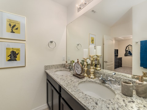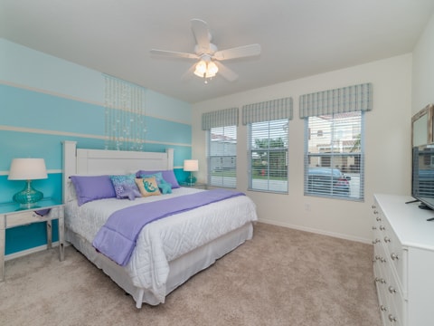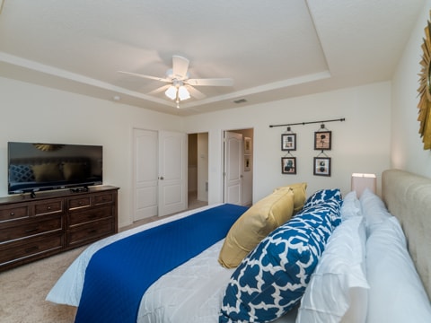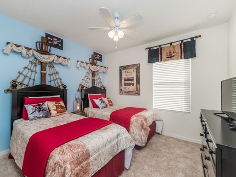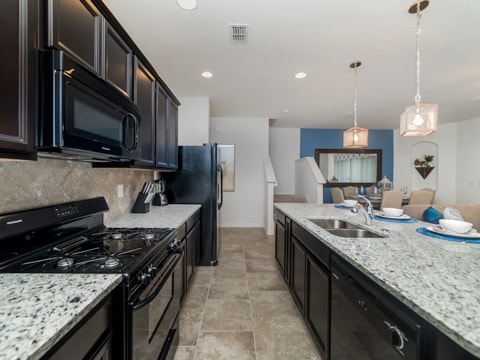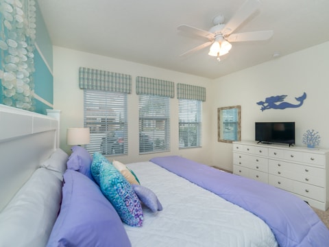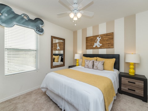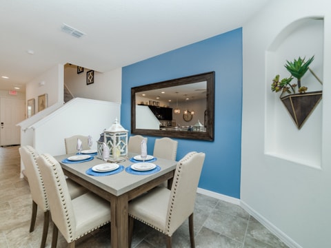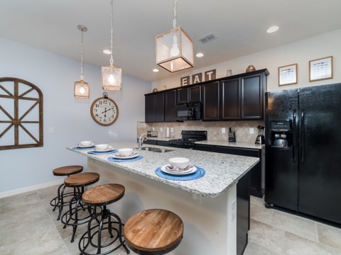 Pack your suitcase and get ready for your dream vacation- stay in this beautiful Solterra townhome today. A Disney theme is decorated throughout, which is exciting for adults and kids alike. As you enter, you are greeted by a “Be Our Guest” sign that brings you into the magic of Florida. The open concept of the kitchen and living room allow you and your guests to always be together. The living room is decorated in cozy furniture and relaxing blues. The 50” flat screen will be the perfect place to gather around to catch up on your favorite movies and TV shows. The kitchen, which overlooks the living room, will bring out your inner chef. Top of the line appliances, granite countertops and dark wood cabinetry will inspire you to cook up gourmet meals. The dining room table also provides the perfect place to share those home cooked meals together. The 4 bedrooms and 3.5 bathrooms in this home allows you and your guests to have their own space on vacation. This home has 2 king bedrooms, 1 queen bedroom and 1 room with 2 twins which sleeps a total of 8 guests. The bedrooms have a Disney theme that you and your guests will be able to find. This home is also jam packed with entertainment and this comes in the form of a private splash pool. This back patio is a vacationers dream with an outdoor dining set, lounge chairs and more. This home is the perfect place for you and your guests to escape to in central Florida. Book your stay today!