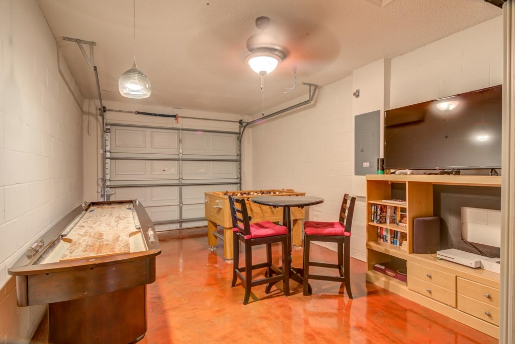 The garage has been converted into a games room, for added entertainment. It has a large flat screen TV, video game console with games, foosball table and a shuffleboard table. You and your family are sure to have a hours of fun.