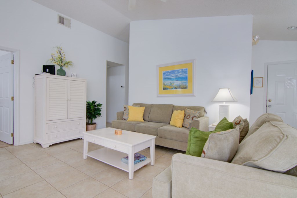 This gorgeous 3 bedroom property is located in the exclusive Southern Dunes Golf and Country Club Resort. This property is unique as it backs onto the golf course and has its own games room. This property has 3 bedrooms, 2 bathrooms and sleeps 6 people comfortably. As you walk through the front door you are greated by the living room which leads out to the pool area. The living room has gorgeous tiled flooring and a flat screen TV. You will also find TVs throughout the property with cable TV along with free wifi access.