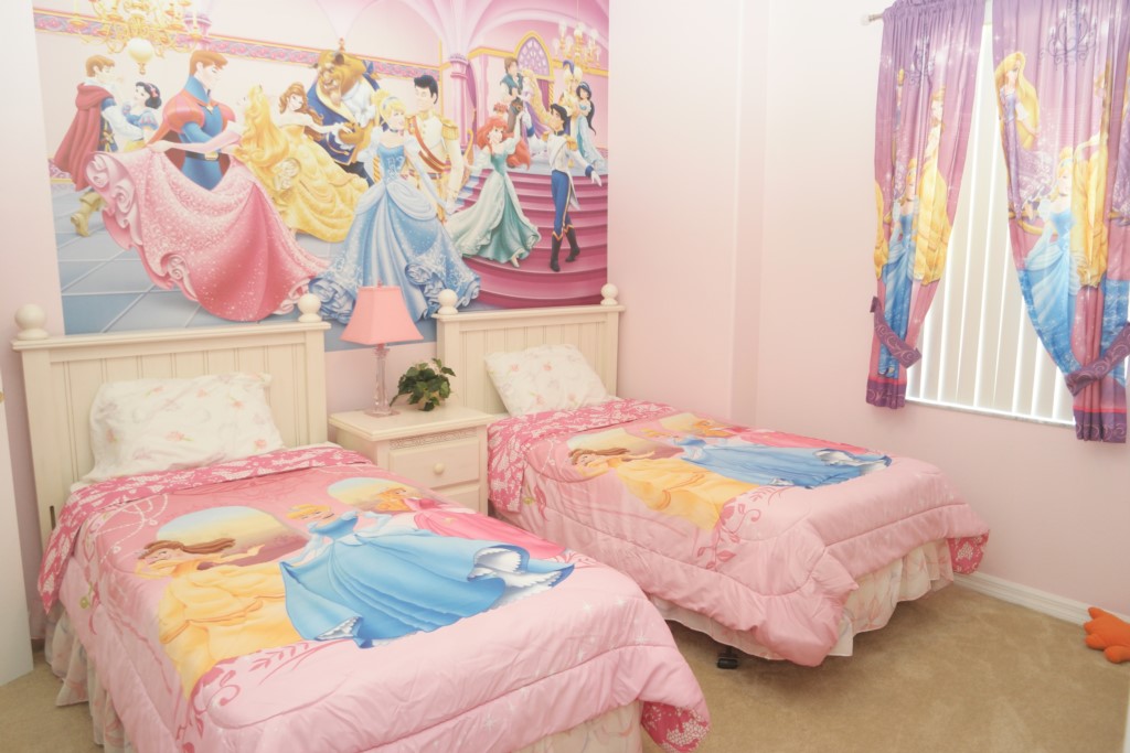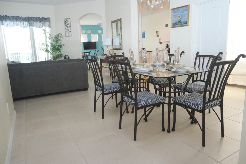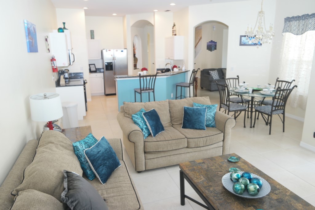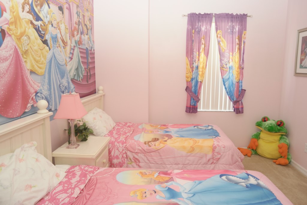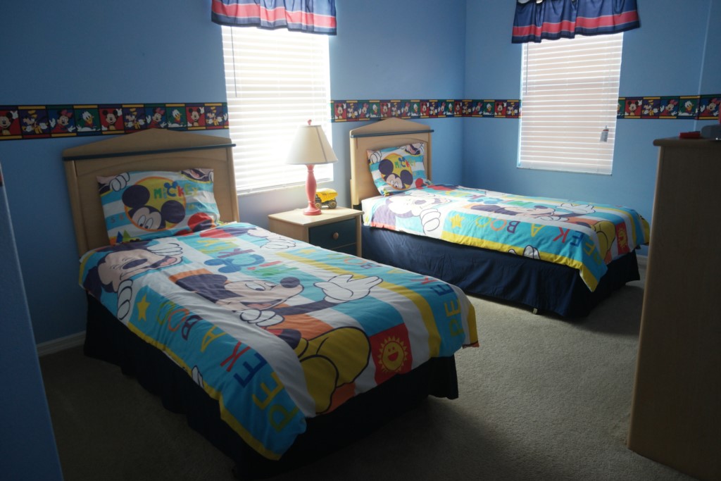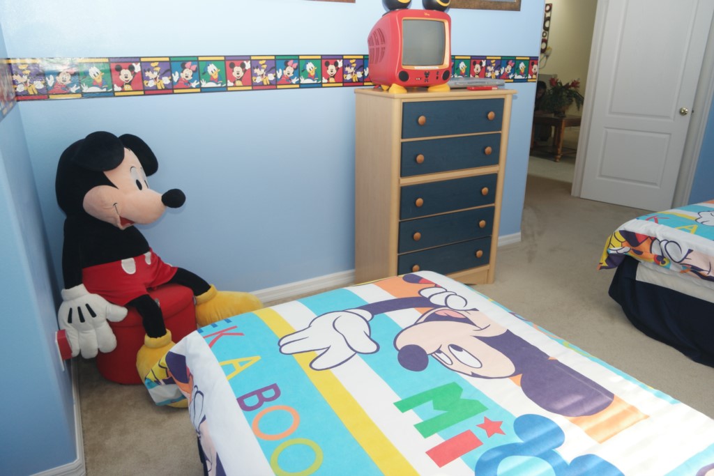The fully fitted kitchen has 2 bar stools and a nook with a table that seats 4, the formal dining seats 6 and it is open to the living room area and family room. Both dining areas feature elegant Crystal chandeliers. The main floor also features the Master suite offering a Jacuzzi tub and separate shower, guest bedroom and guest bathroom. The second floor has a den perfect to relax with a good book, a Princess room with 2 twin beds, a Mickey room with 2 twin beds, a 3rd bedroom with 2 twin beds, a bathroom and a 2nd master suite with a queen bed.