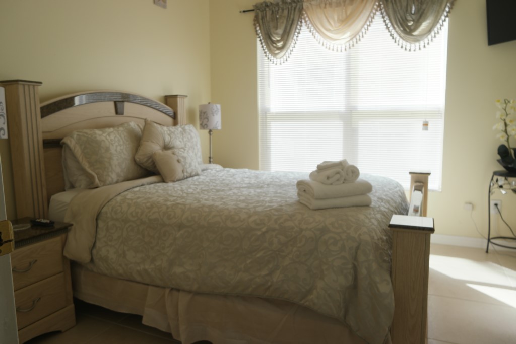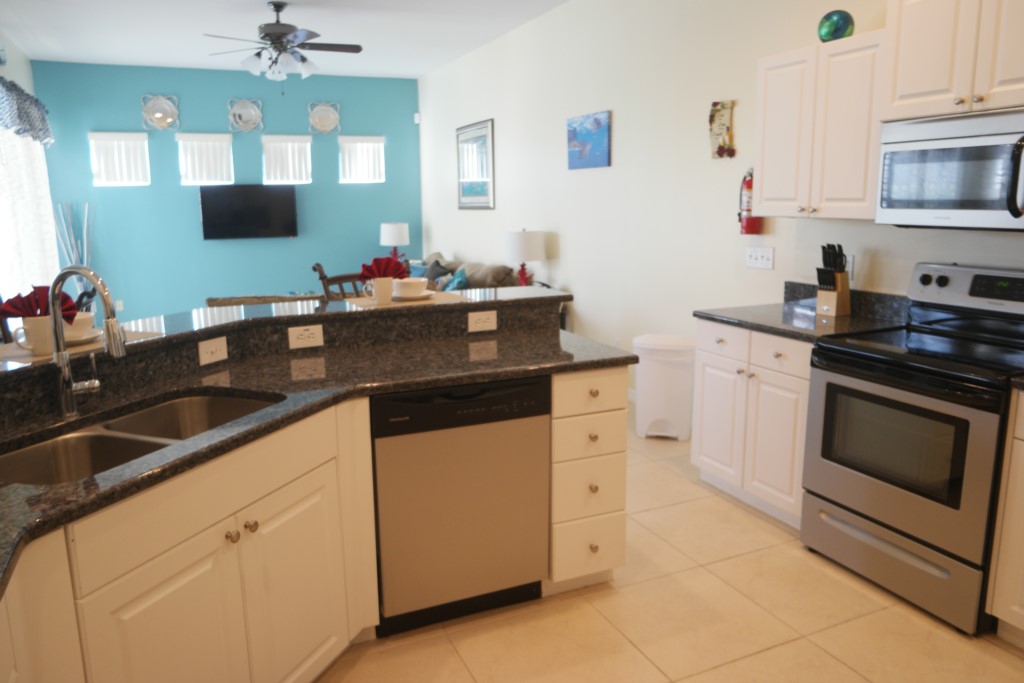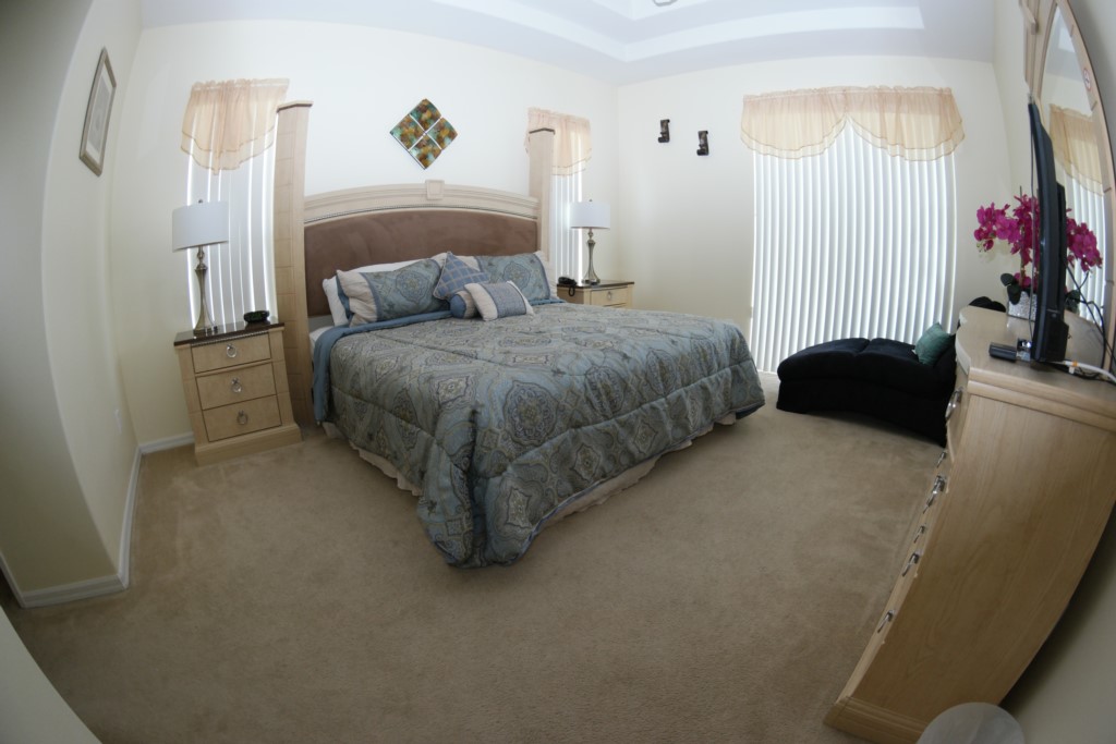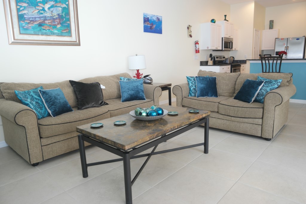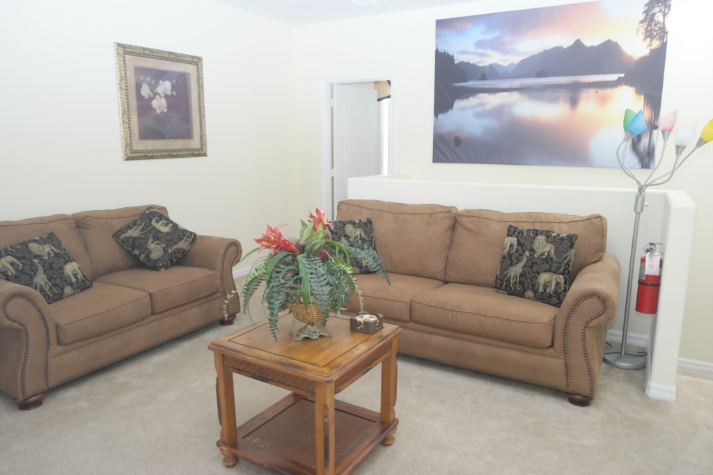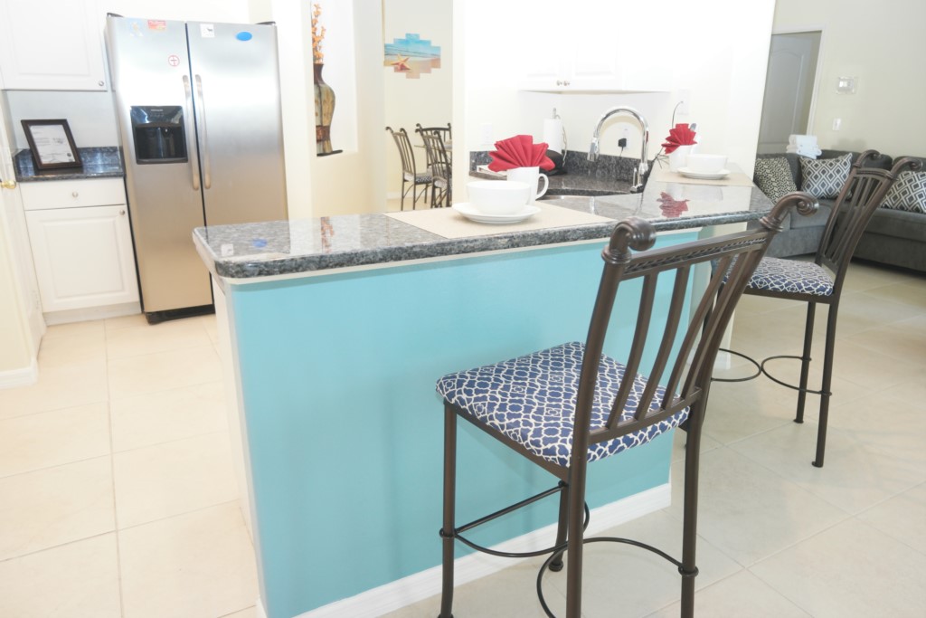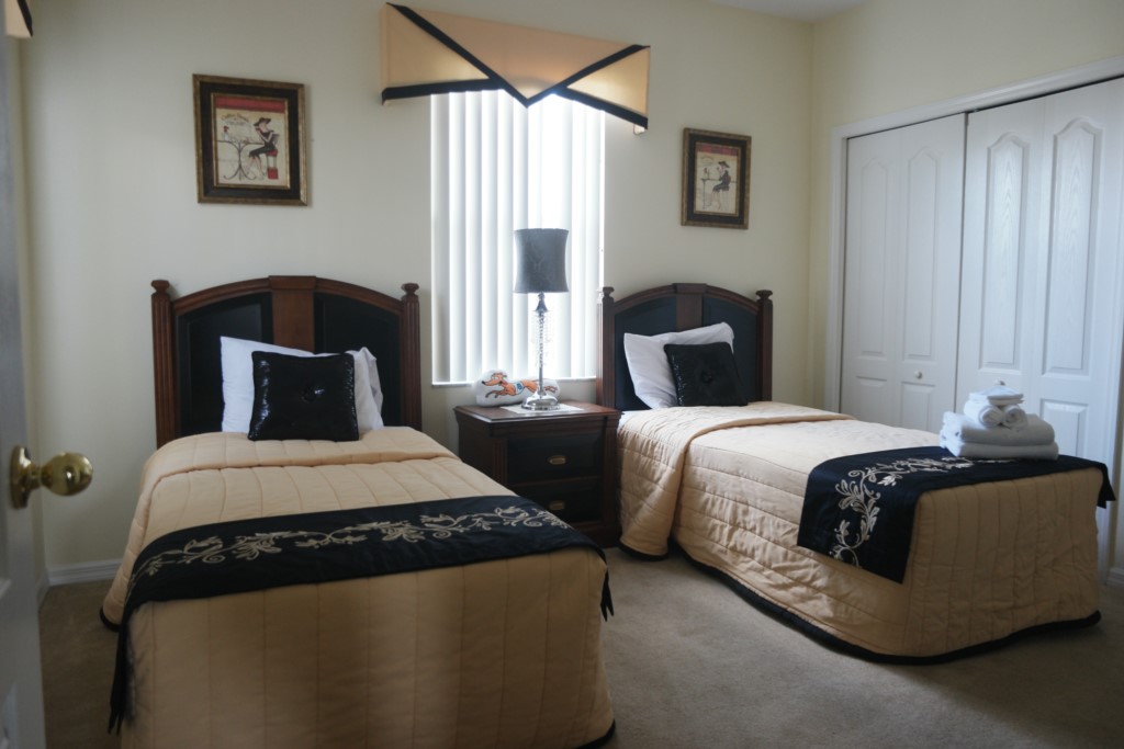 The fully fitted kitchen has 2 bar stools and a nook with a table that seats 4, the formal dining seats 6 and it is open to the living room area and family room. Both dining areas feature elegant Crystal chandeliers. The main floor also features the Master suite offering a Jacuzzi tub and separate shower, guest bedroom and guest bathroom. The second floor has a den perfect to relax with a good book, a Princess room with 2 twin beds, a Mickey room with 2 twin beds, a 3rd bedroom with 2 twin beds, a bathroom and a 2nd master suite with a queen bed.