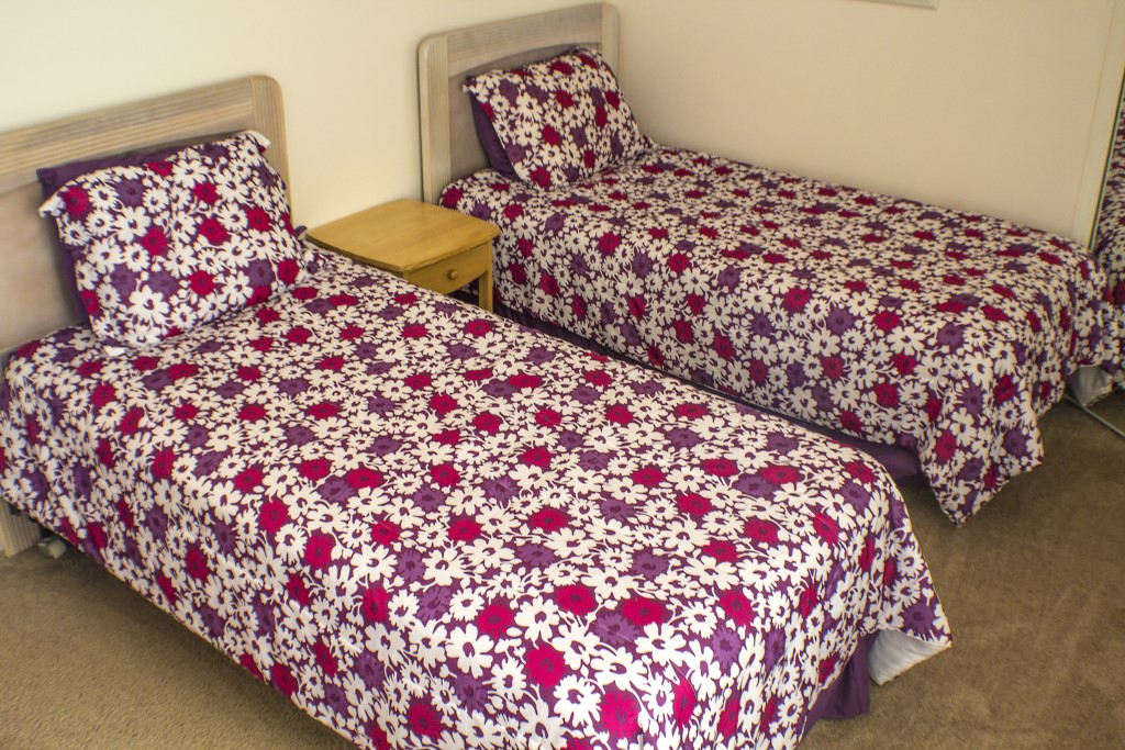 The master bedroom is sunny and bright with a floral theme. Boasting a comfortable king sized bed withwhite matching furniture you’ll feel immediately at home here. It also has a private bathroom with a single vanity and basin, a toilet, and a shower and bath together. The second bedroom is large with 2 twin beds. It has modern décor and a large sliding door, allowing a lot of natural light to enter the room. Additionally, it also has an armchair that you can relax in. The other room also has 2 single beds and is decorated beautifully.