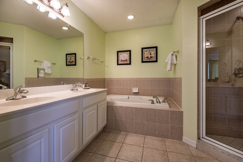 The upper floor master has a king-sized bed and a spacious en-suite bathroom with two sinks, shower room, tub, toilet room, plus a huge walk-in closet.