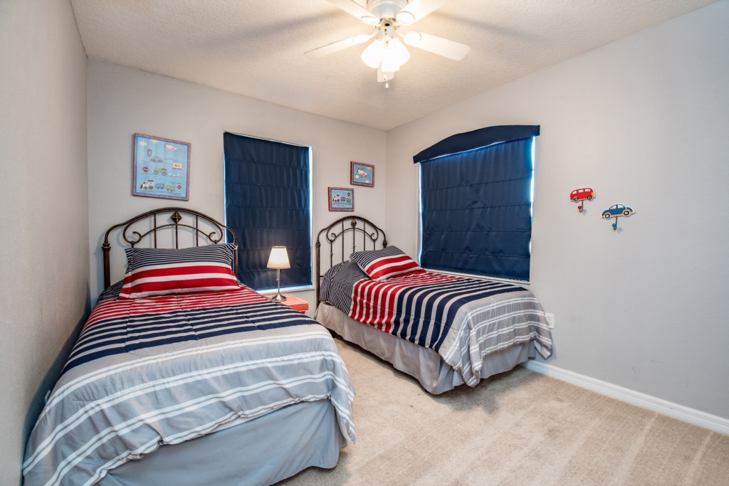 These two bedrooms share a bathroom with tub/shower, toilet and sink.