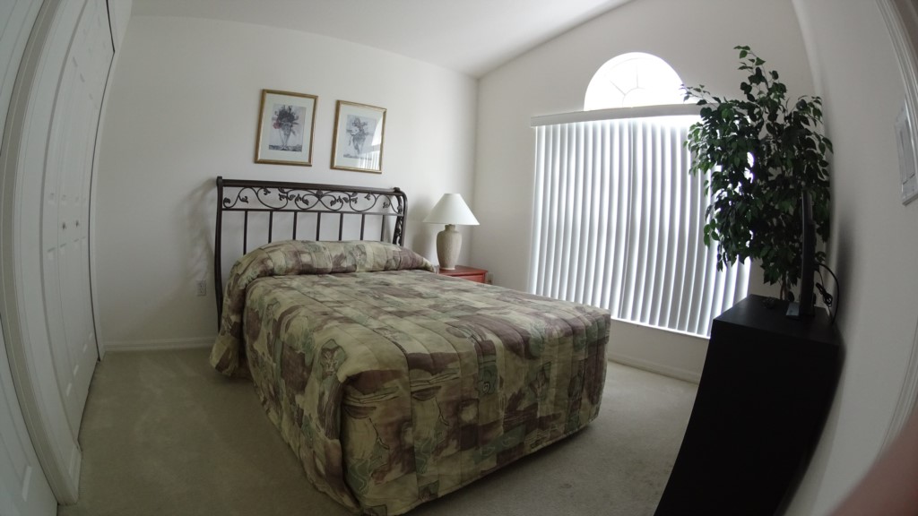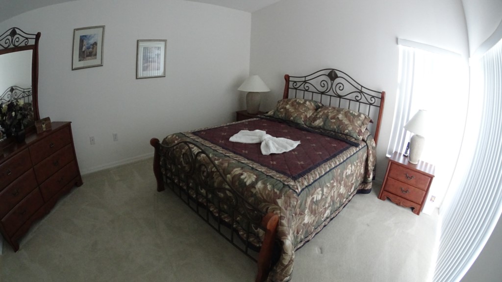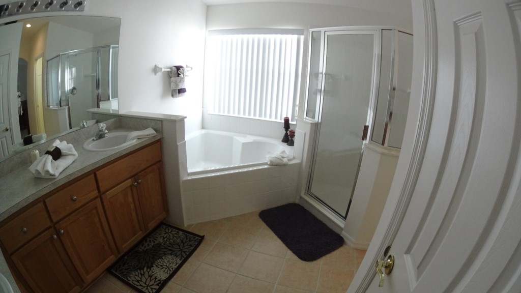 As you proceed to the rest of the home, to your left you will find the laundry room with full size washer & dryer, a bedroom with full size bed and 32” HDTV and a separate full bath. The master is located at the back of the house offering a queen bed, 32” HDTV, “his & hers” walk-in closets, private bathroom with garden tub, double sinks and stand up shower. All of the bedrooms come complete with towels and extra linen.