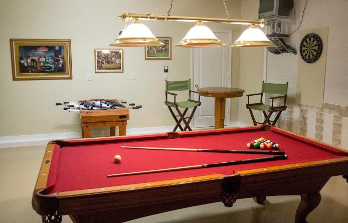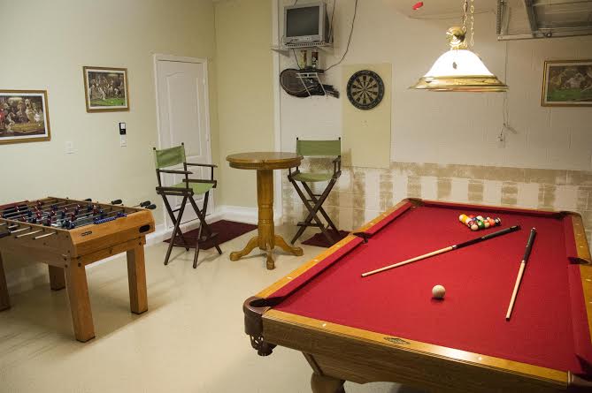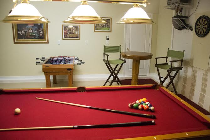 If you’re looking for a bit more entertainment, there’s also the home’s games room which has a full-size pool table with overhanging professional pool lights, a foosball table, and a darts board. Here you’ll also find a bar high top table with a couple of barstools.