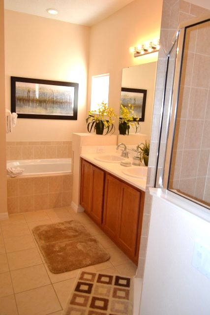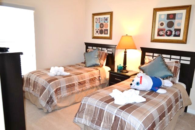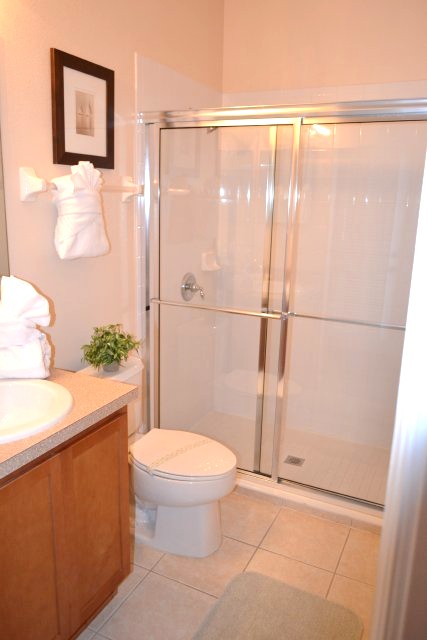 The king-size master bedroom is plush with its own ceiling fan to maintain the cool air during the hotsummer months. It’s beautifully furnished and includes its own en-suite bathroom that has his and her vanities, a large bathtub, and a separate walk in shower. You’ll also be privy to your own 21” inch TV, which is 1 of 5 in the house. For extra entertainment, you’ll also have a DVD player, allowing you to get away from it all if need be. The second largest room in the home is a queen size room that has also been beautifully furnished. Again, it has its own flat screen TV and ceiling fan. The 2 remaining bedrooms are twin bedrooms that have carefully been furnished. These share a communal bathroom, which is easily accessible. All bedroom windows have been specially treated, preventing any mildew or mold buildup in the home. Additionally, there’s also an extra shower room, which has direct access to the deck and pool area, making it easy to grab a quick shower after a day of swimming and sun.