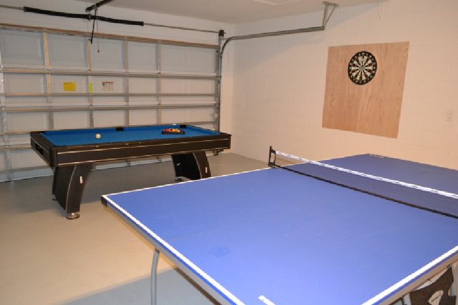 The long outdoor pool is screened for your privacy and sun protection. You’ll have the option of relaxing on 1 of the 2 padded sun loungers or alternatively relaxing under the covered lanai area where there’san outdoor dining area. Attached to the pool is a Jacuzzi, which is the perfect place to relax and enjoy a glass of wine under the stars in the evening. Guests love the converted games room located in the garage where there’s a full-size pool table, a ping pong table, and a darts board – this is one home you’ll never grow bored in!