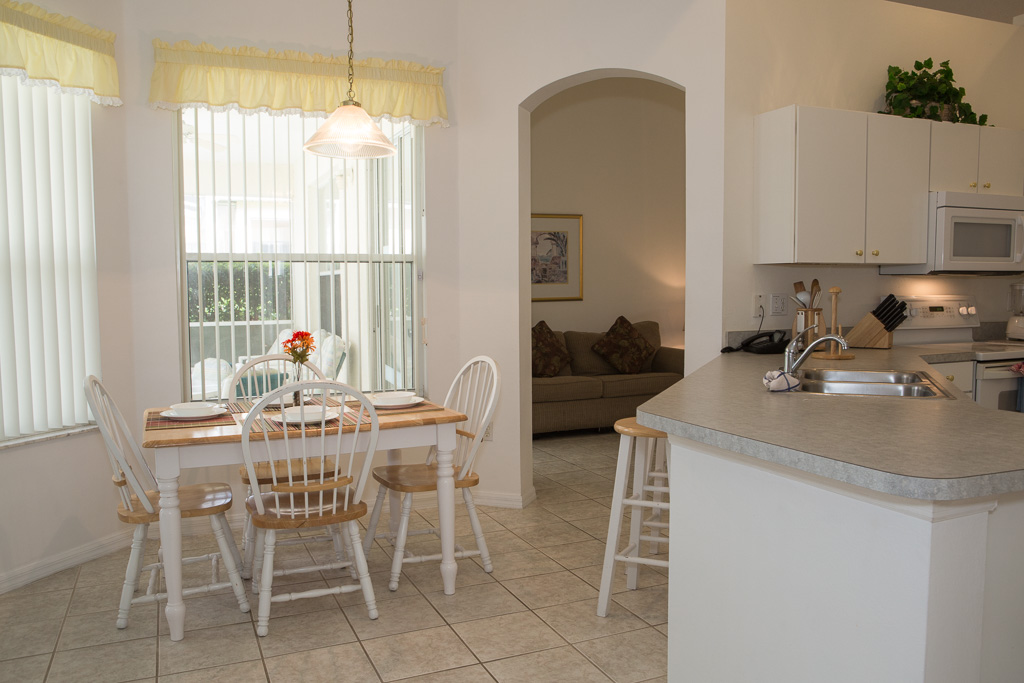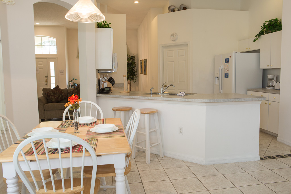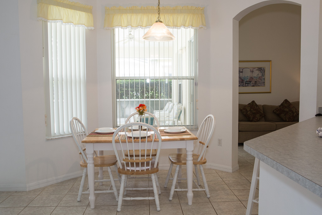 The villa has 2 dining areas. The main dining room has a 6 seat table while the smaller dining area in the kitchen has an oblong 4 seat table.
