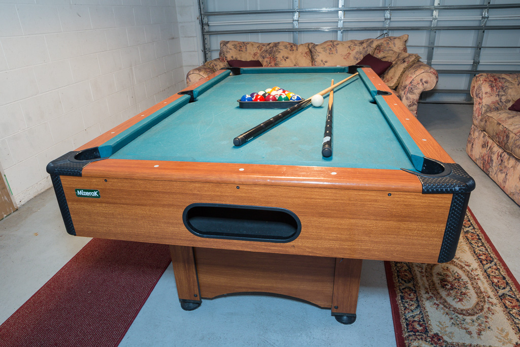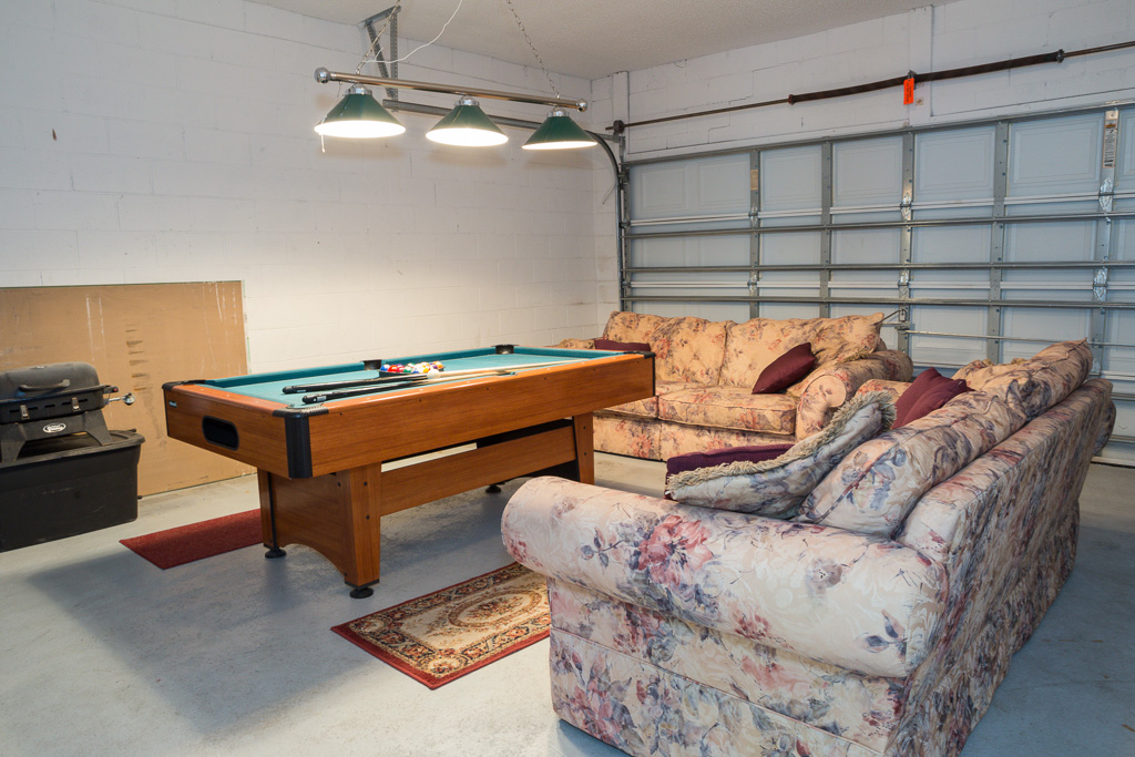 The kitchen is spacious and boasts a dishwasher, oven, stove, microwave and fridge. There’s a lot of storage space and an additional large pantry. The garage has also been converted into a games room to keep the kids entertained. Here you’ll find a multi-game and foosball table.