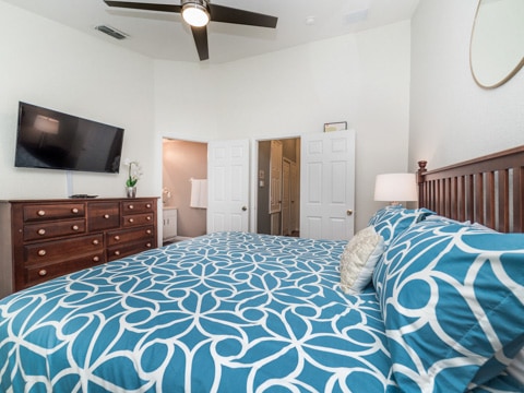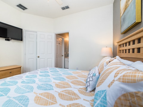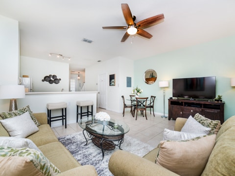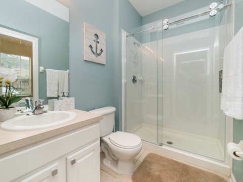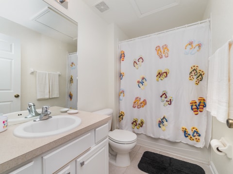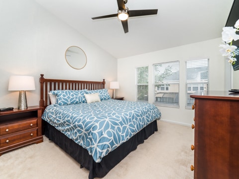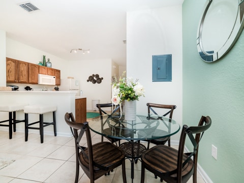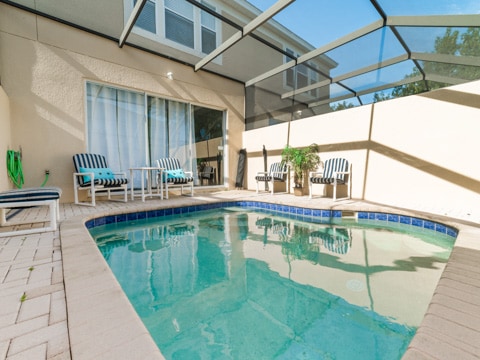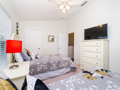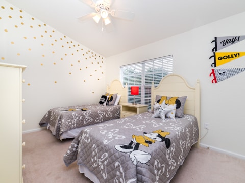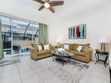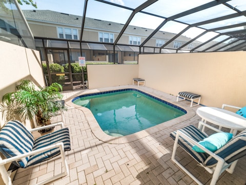The perfect retreat tucked away in the middle of Windsor Hills is waiting for you! A 3 bedroom, 3 bathroom townhouse makes the best home for a vacation to Orlando. The first floor is filled with natural light and an open concept. The first of 3 bedrooms is located here outfitted with a queen size bed and cozy furnishings. The kitchen has all of the essentials to whip up amazing meals. Perfect for midnight snacks or holiday celebrations, this kitchen is ideal for vacation. The living room is furnished with couches as well as a huge 55” flat screen TV. The living room also opens up to the gorgeous patio which has a private pool, always ready for you to splash and play in. Heading upstairs, there are 2 more bedrooms. The master has a king bed as well as an ensuite bathroom. The second upstairs room has 2 twin beds, an ensuite bathroom as well as a Disney theme! Do not forget the washer and dryer and free Wifi which are the perfect additions to any vacation. Be sure to also visit the Windsor Hills clubhouse which has a huge pool, slide, movie theatre and so much more. Book your stay today!