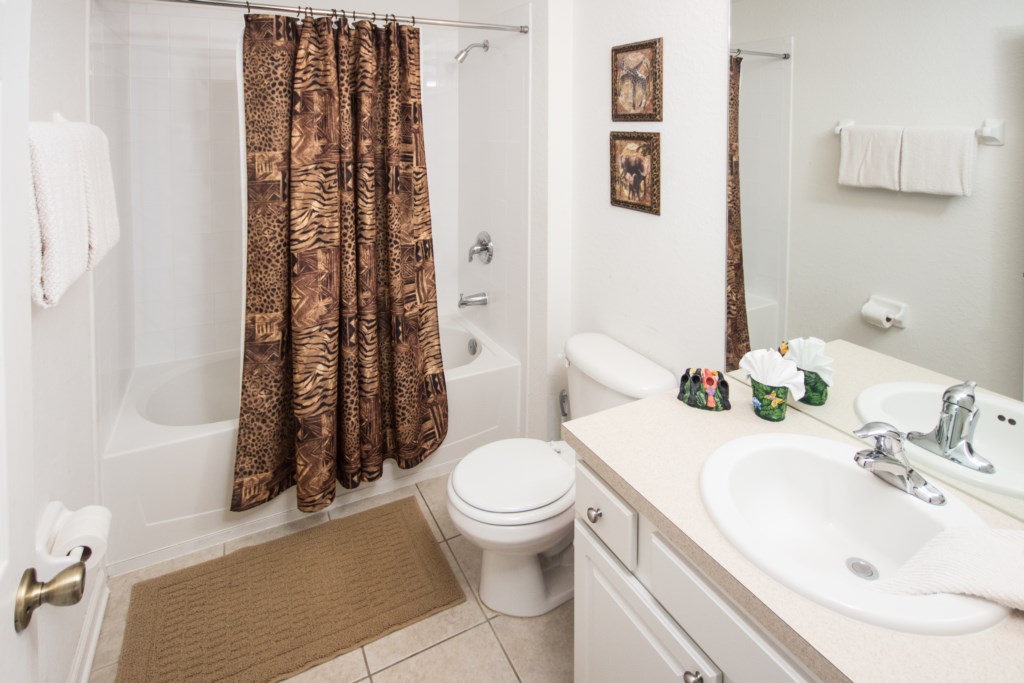 One bedroom and bath is downstairs, featuring a large closet and TV with a DVD player. Upstairs are a luxurious master suite with a pillow top mattress and a jungle-theme room with twin beds. Each has its own private bath and walk-in closet. The master suite has a TV and DVD player and the Twin bedroom has a TV and Play Station.