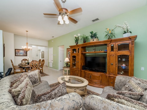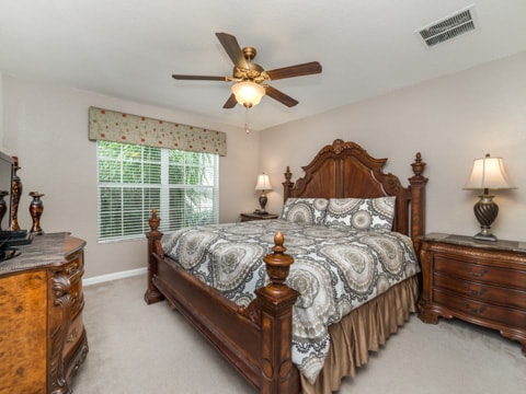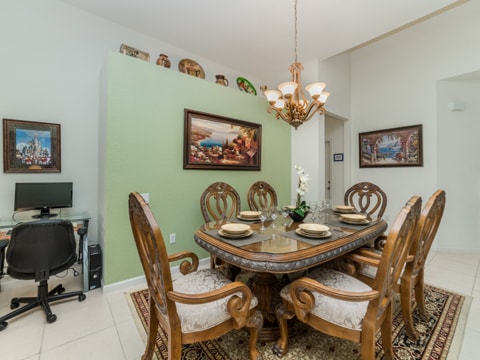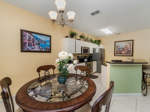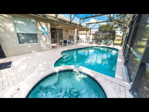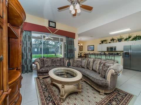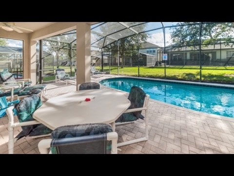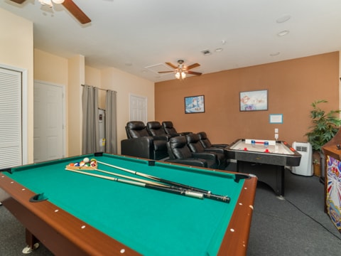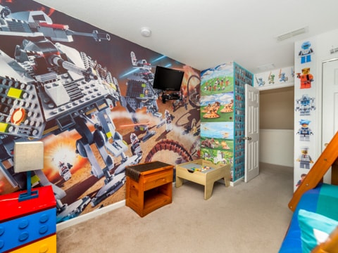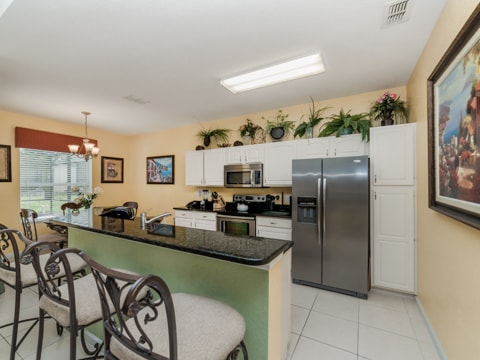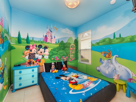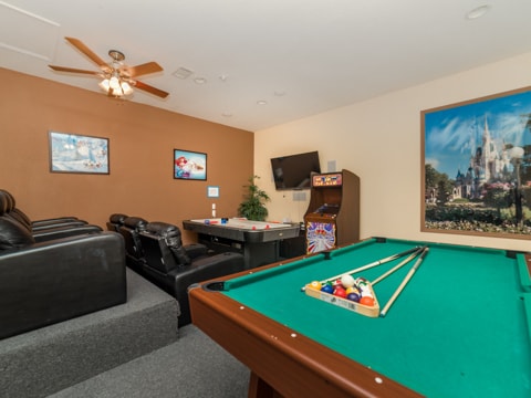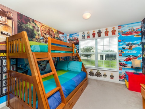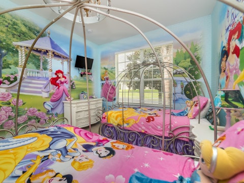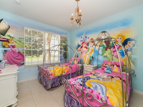 Get ready for a whole new way to vacation by staying in this alluring 5 bedroom 5 bathroom home located in the resort community of Windsor Hills. This open concept home is perfect for your vacation and designed expertly as a part of the grand collection. With surprises around each corner, everyone on your vacation will be happy! First, the living room is situated perfectly to overlook the pool area and designed around the 50” flat screen TV. The sliding glass doors easily convert this space into an indoor-outdoor living room. The kitchen overlooks the living room and features granite, stainless steel appliances and new cabinetry. The dining room table, breakfast nook and breakfast bar seat a total of 13- plenty for big family meals. The rooms in this house are where the magic comes alive. The master bedroom and guest have 2 king beds. Another has 2 twins and a Princess decorated room. Fall asleep to the voices of your favorite princesses in this room. Another room, with one twin is all about Mickey and Minnie. Sleep next to the famous duo here! Lastly, another room features a twin over full bunk bed and is themed with Legos in mind. Any of your little ones will have the best stay here! There is much more for entertainment. The home theater boasts a 55” TV and the gameroom has games like billiards and air hockey. After family game night, go out back for a swim in the private pool and spa. This home also comes with access to the Windsor Hills clubhouse. Book your stay today and change how you vacation!