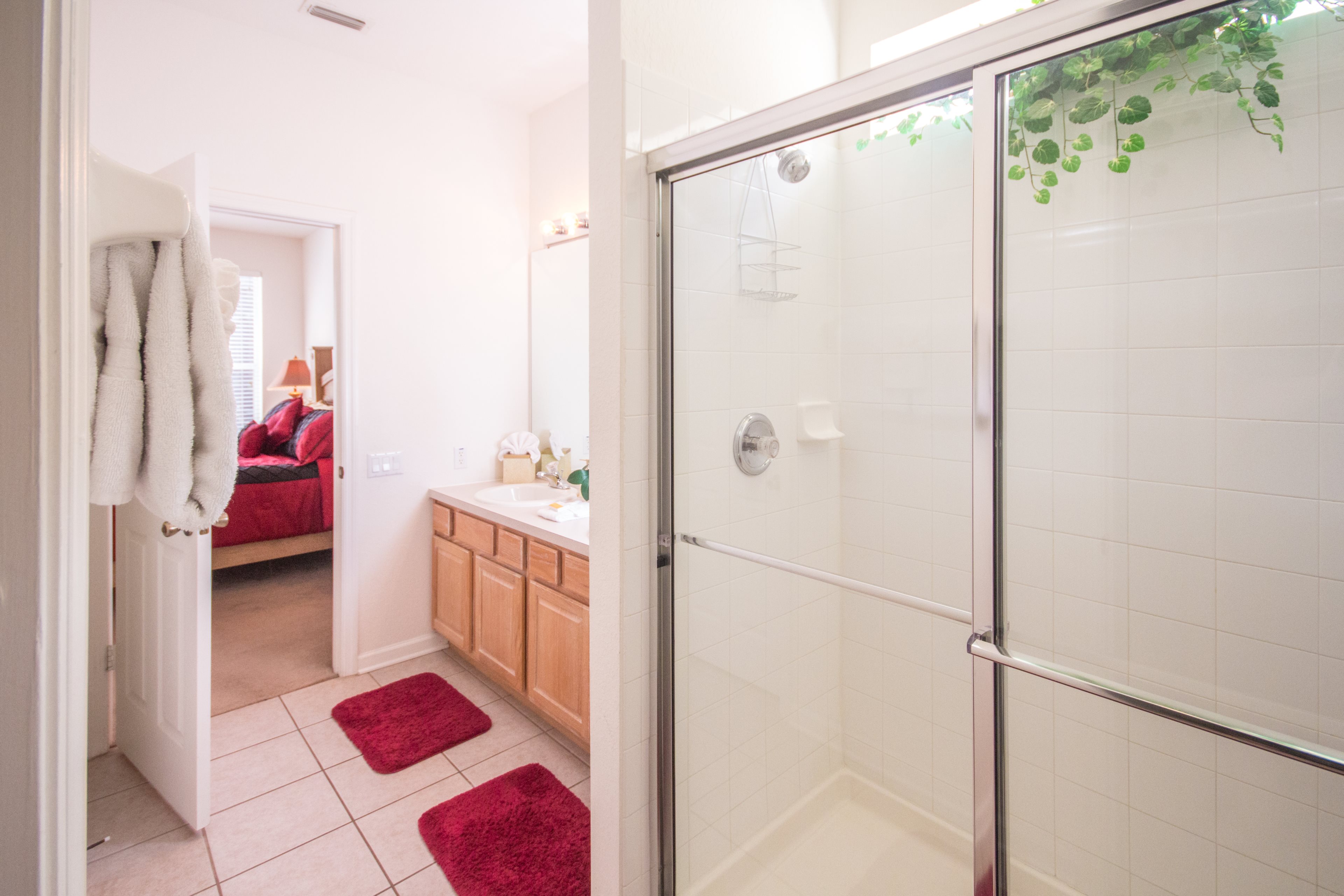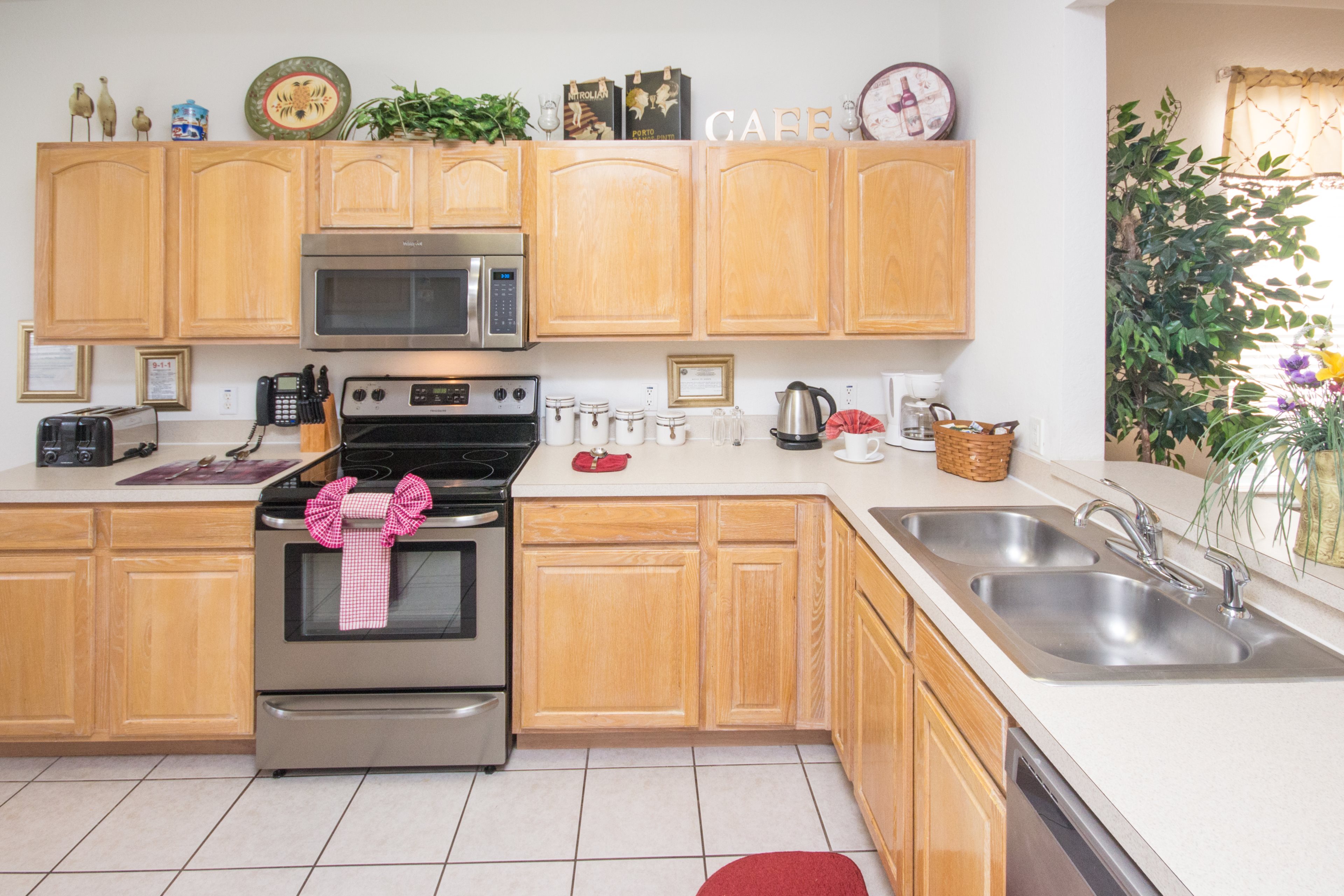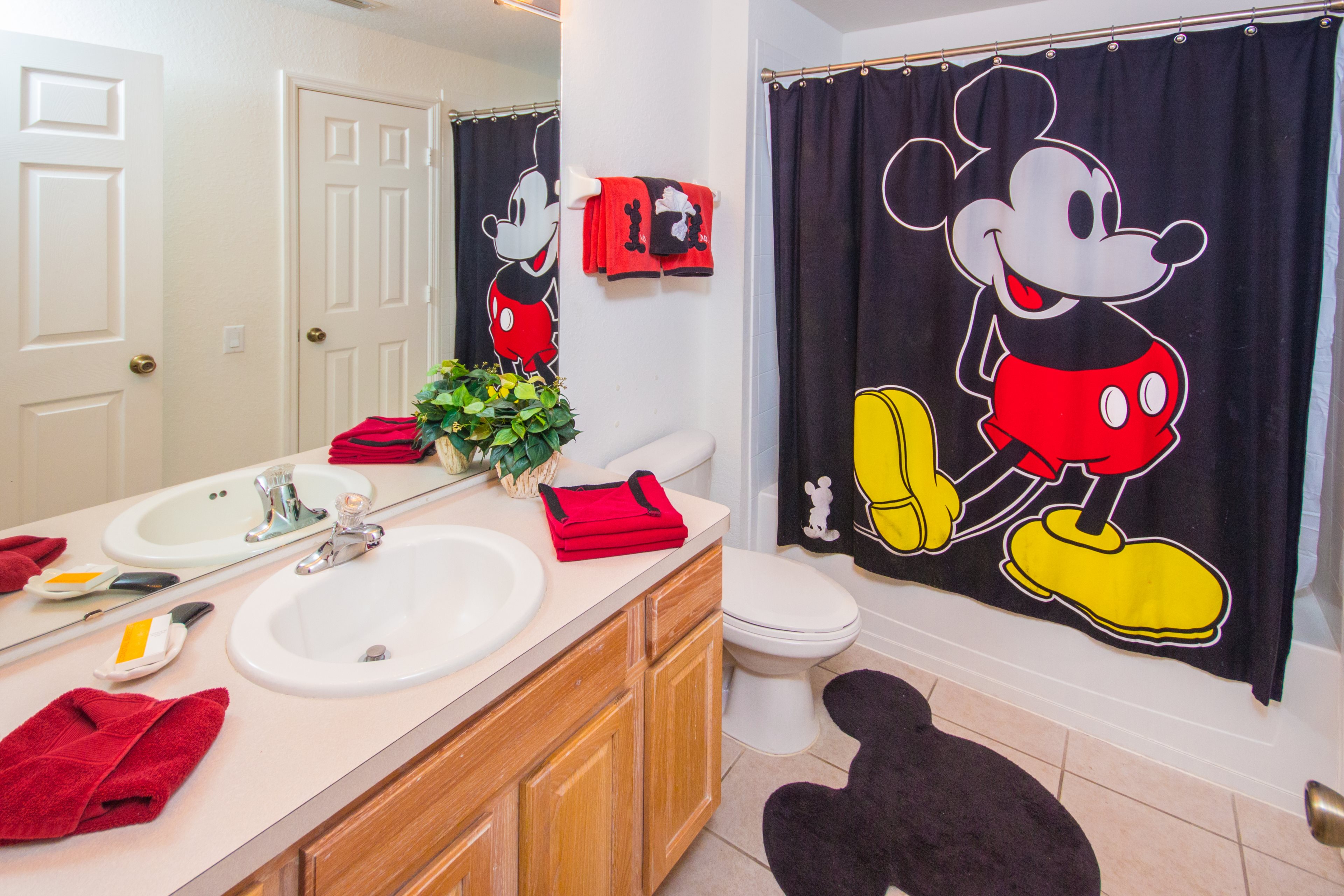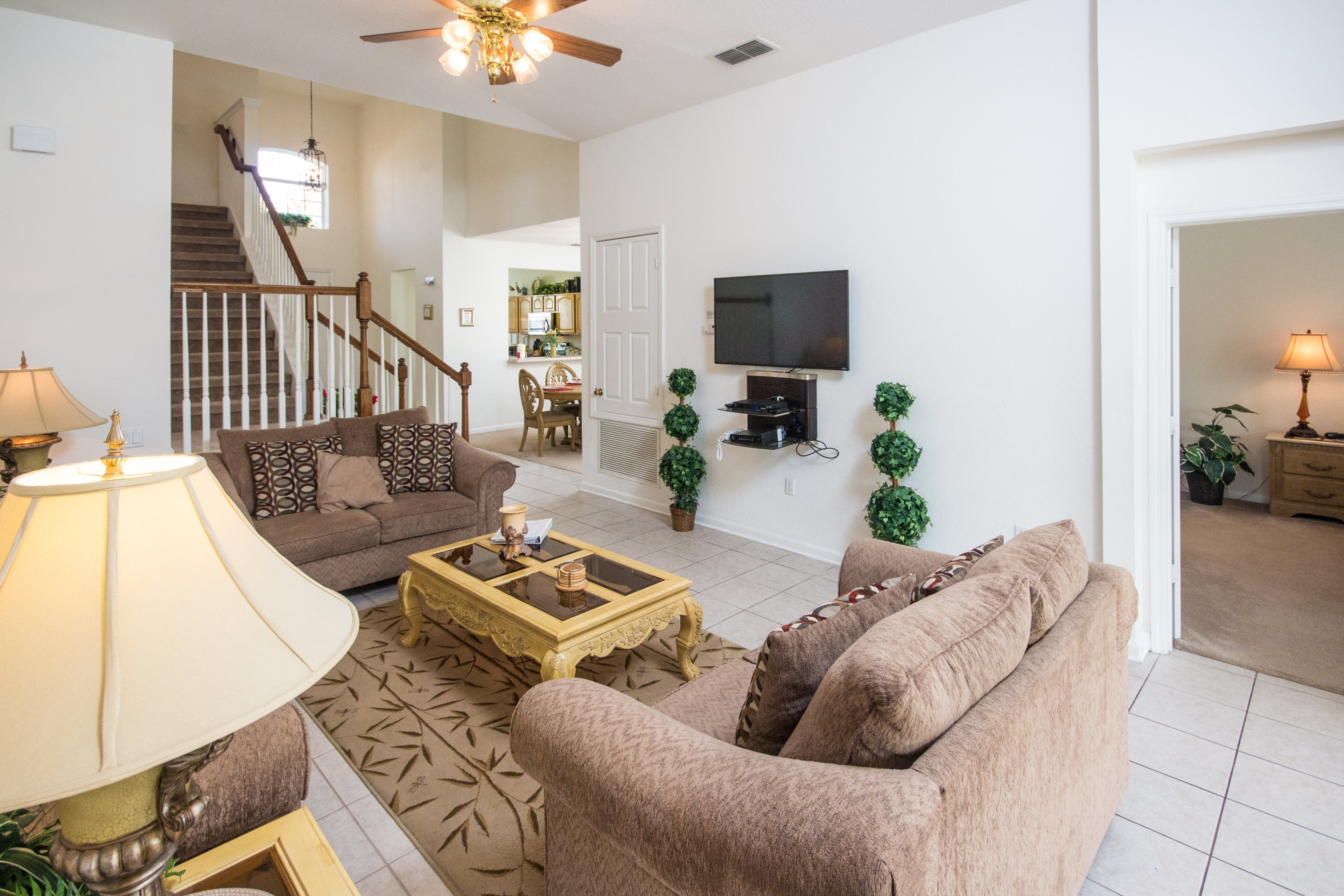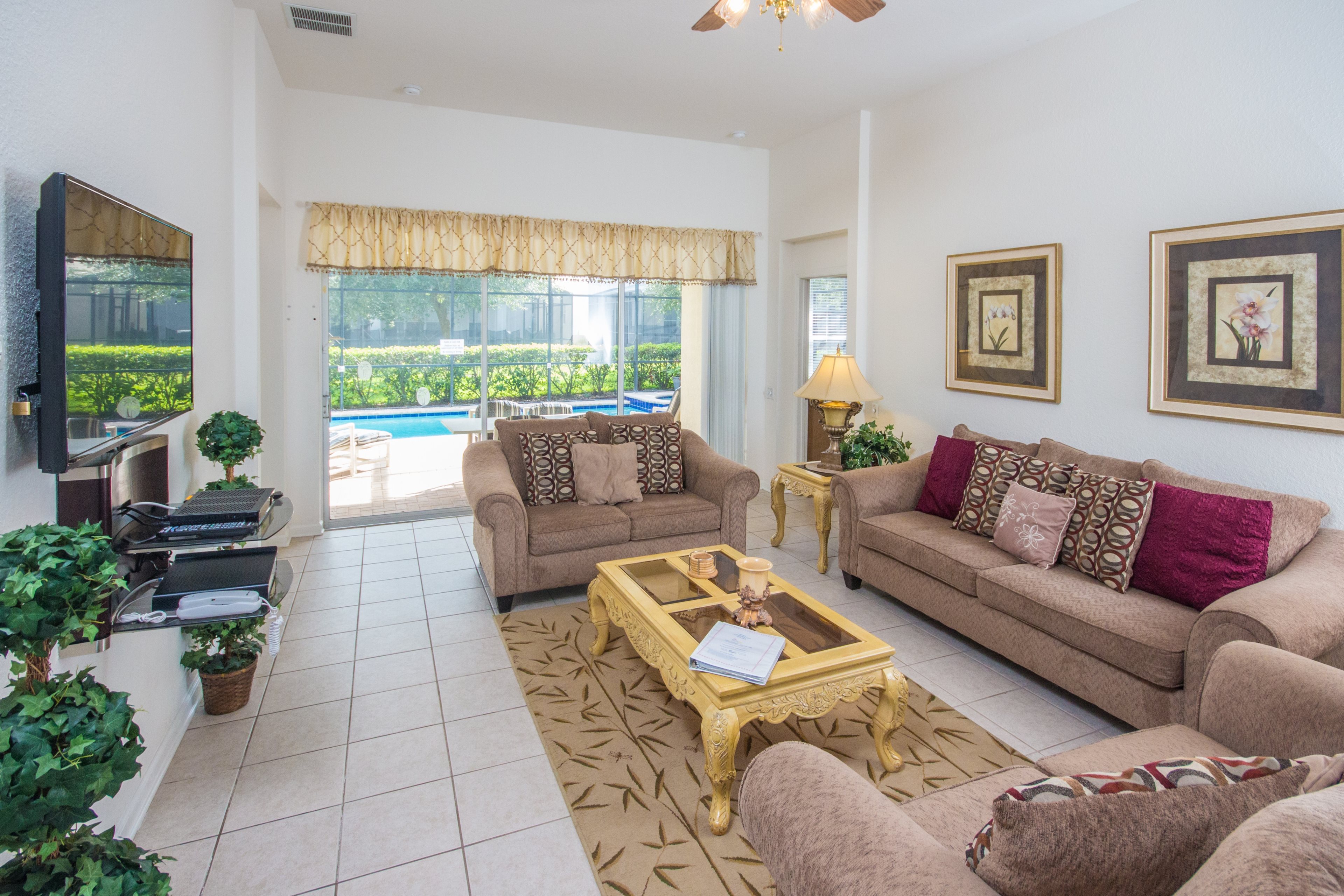 The exterior of this yellow villa is grand impressive. As you enter through the front door, you’ll notice two things immediately: the tall ceilings and the large tiled floors. These two works together to give the impression of grandness and openness. As you continue, you’ll pass the formal dining room on your left side. This room has an ornate, wooden dining suite with seating for up to six people. If you want to eat a meal with everyone at the table, this is the best place to do it. Overlooking the dining room is the L-shaped kitchen that come fully equipped with everything you’d need to whip up something good to eat. Just off the kitchen is the small breakfast nook with seating for up to four. Now, onto the living room. This large, open room has two comfortable sofas, an arm chair, and a large flat screen TV mounted to the wall. This is the place to come and enjoy a movie after an exhausting day at the parks.