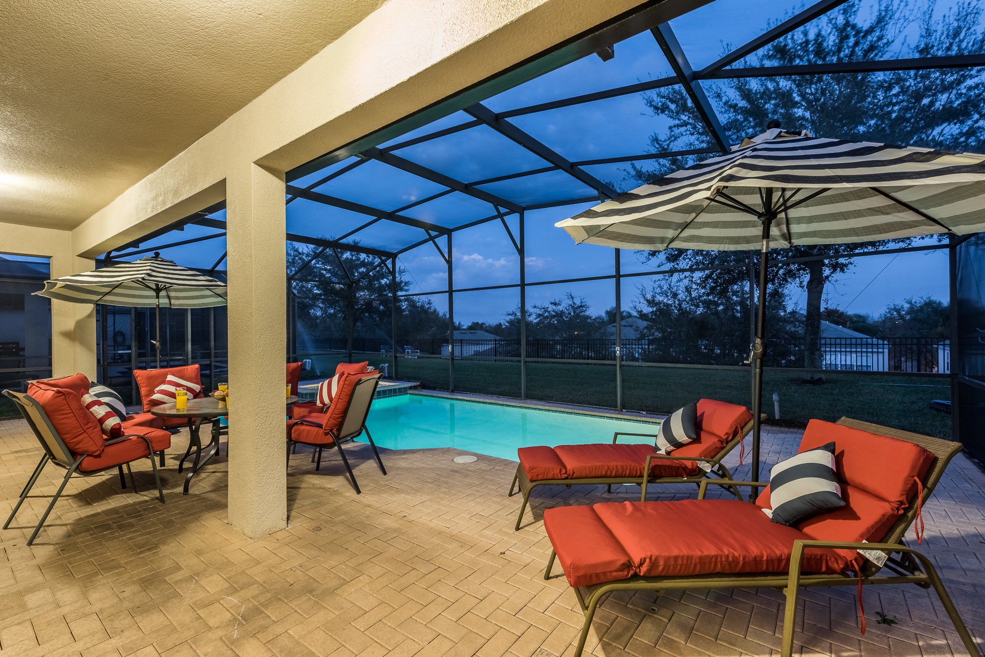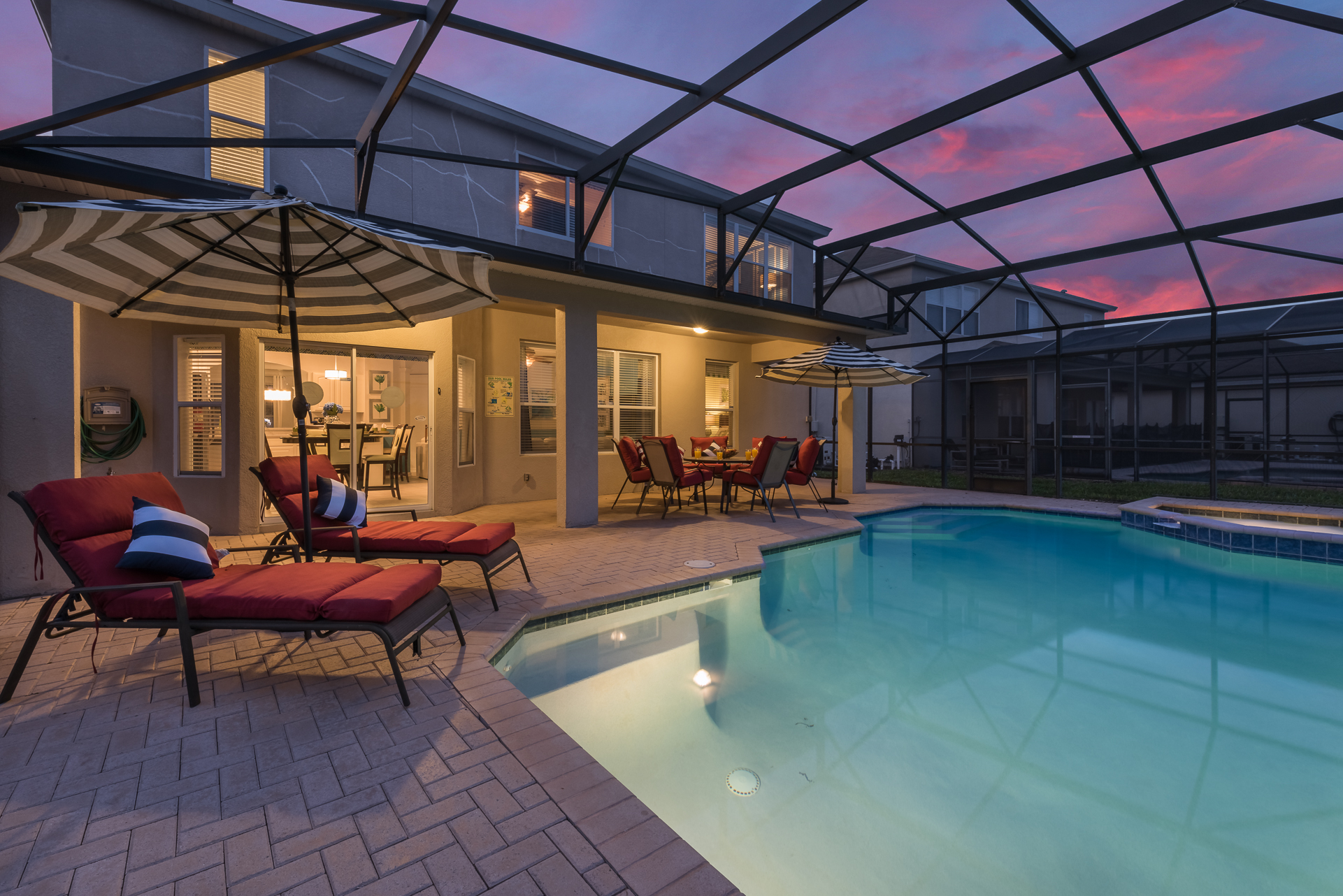 The screened in private swimming pool is the perfect way to enjoy the warm Florida weather and have a relaxing day in the sunshine after long days at the theme parks.