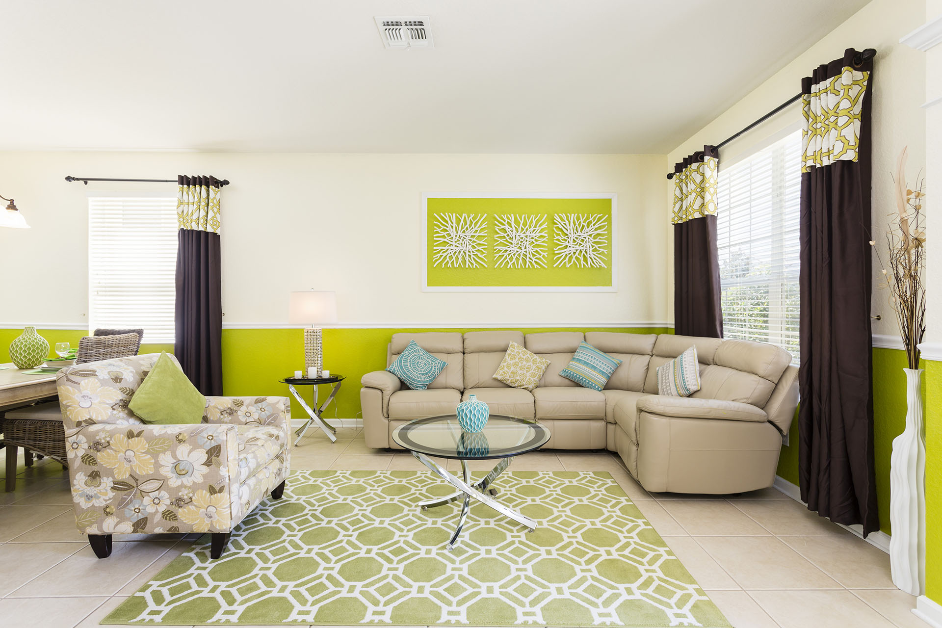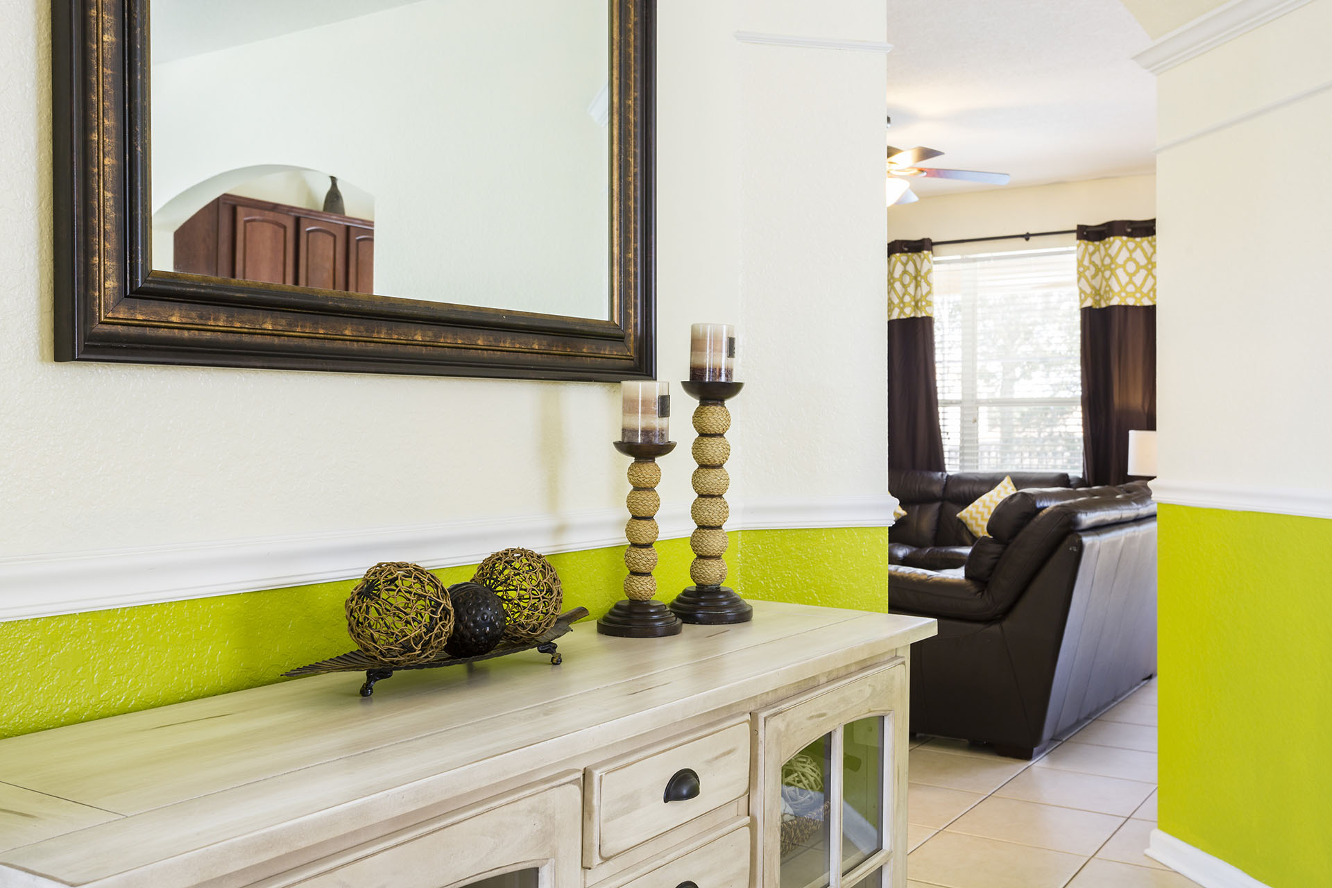 Foyer has a leather sectional and an accent chair
