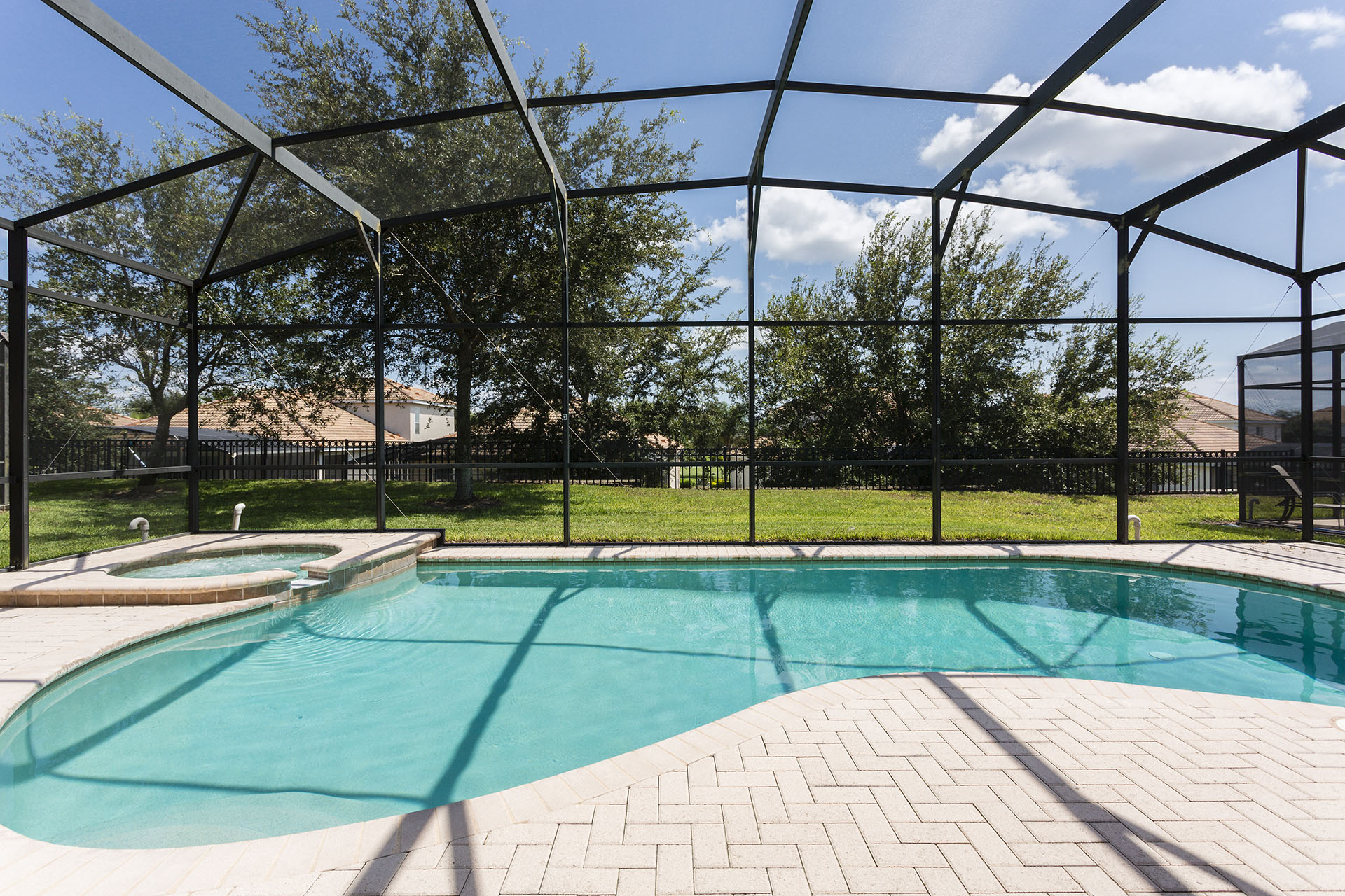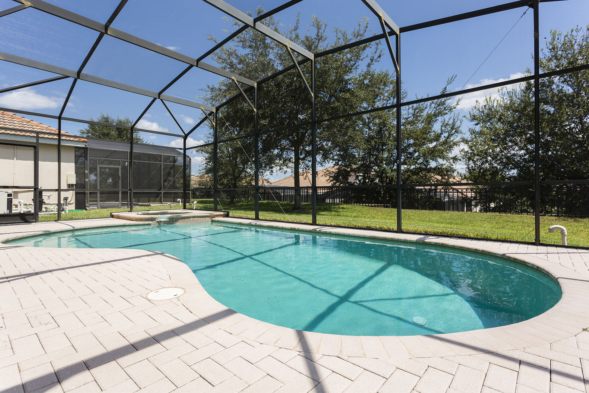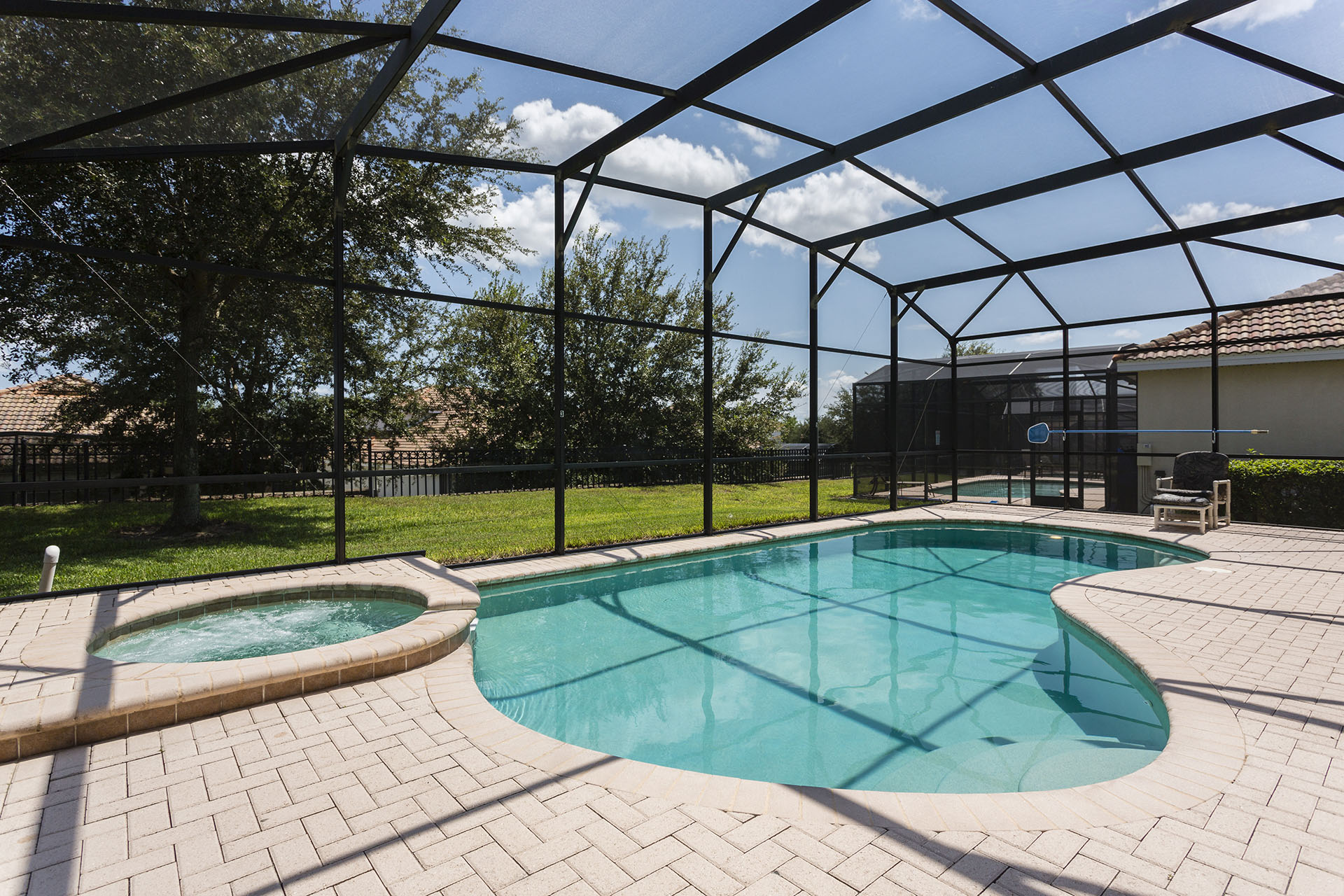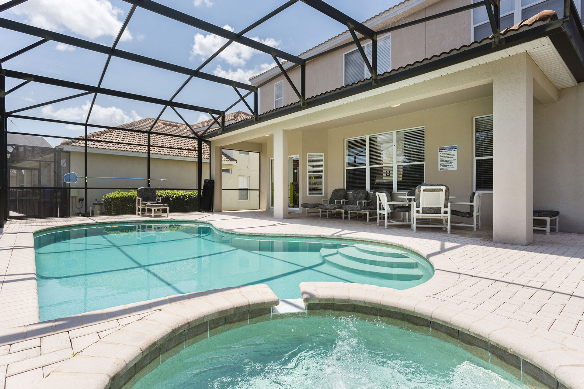 Screened in private swimming pool and spillover spa (optional heating)