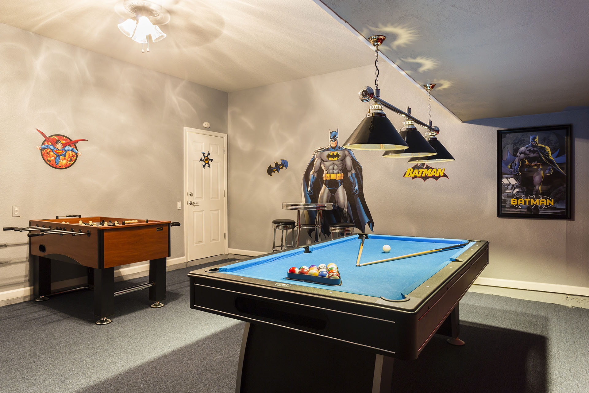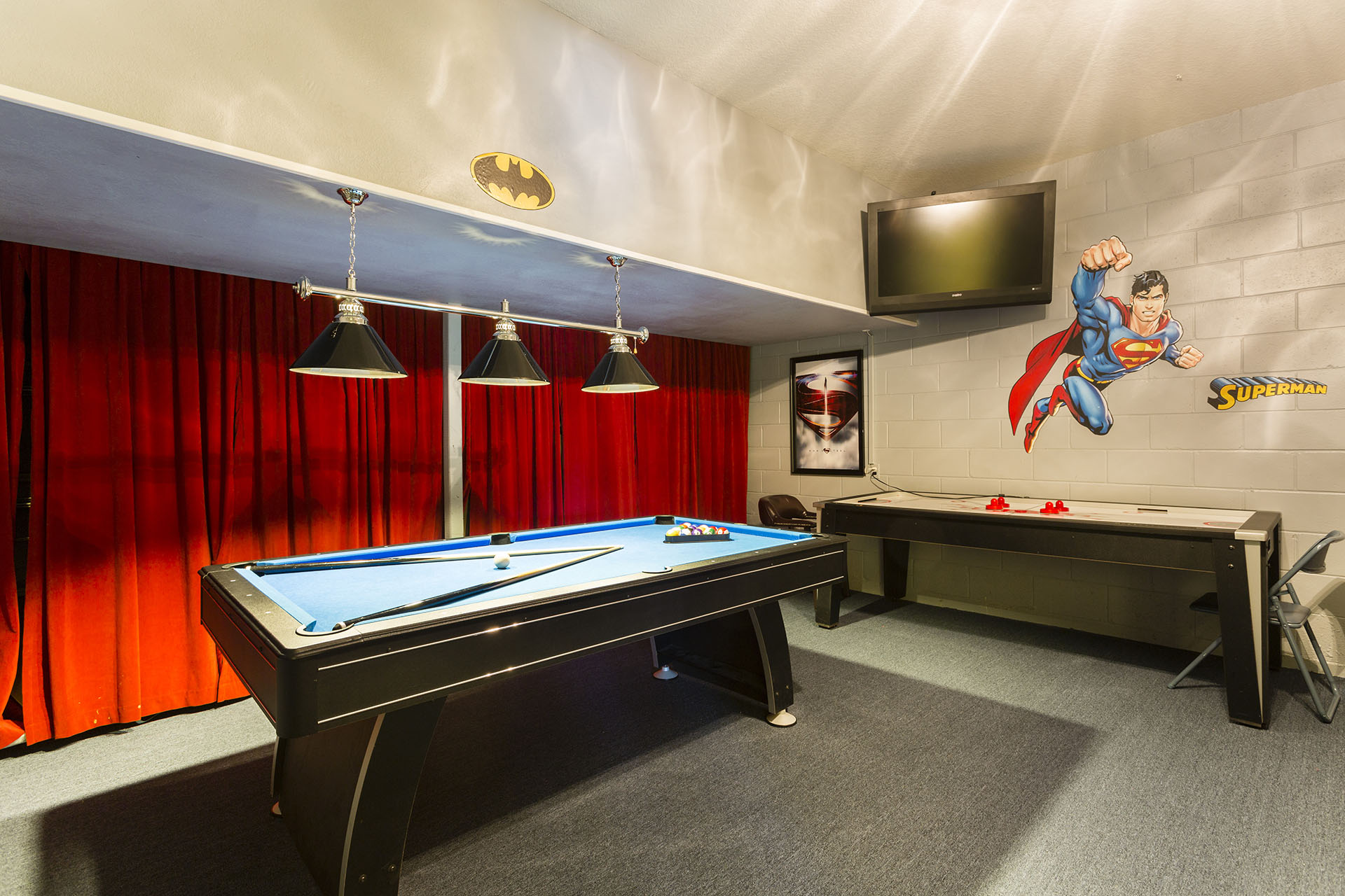 Games room has an air hockey, foosball, and pool table, flat screen TV, 2 seat high top table