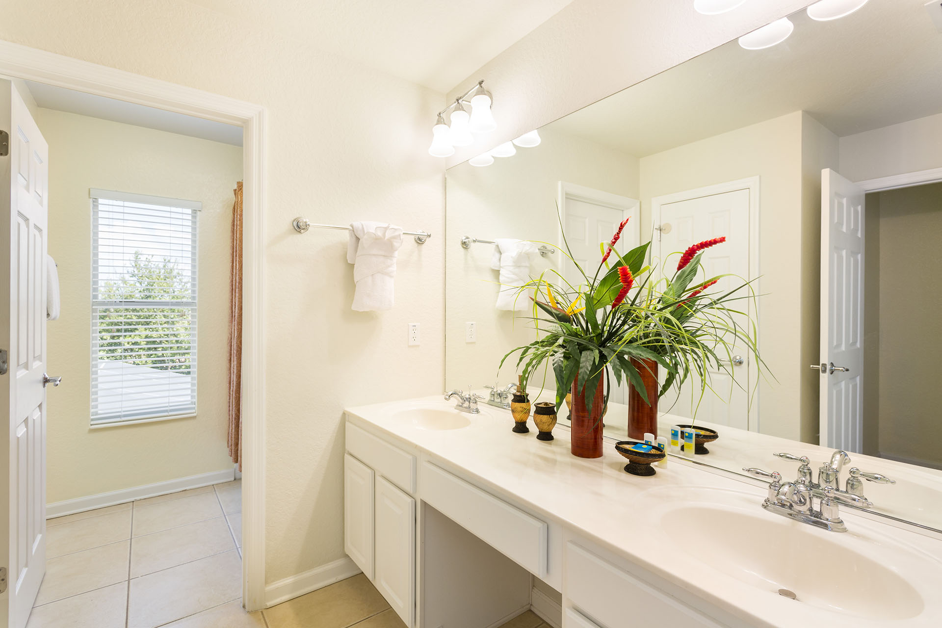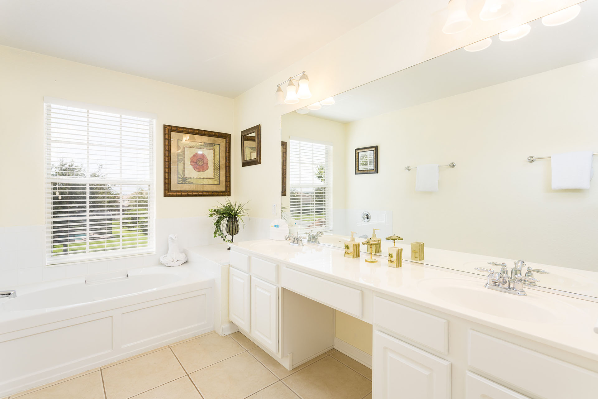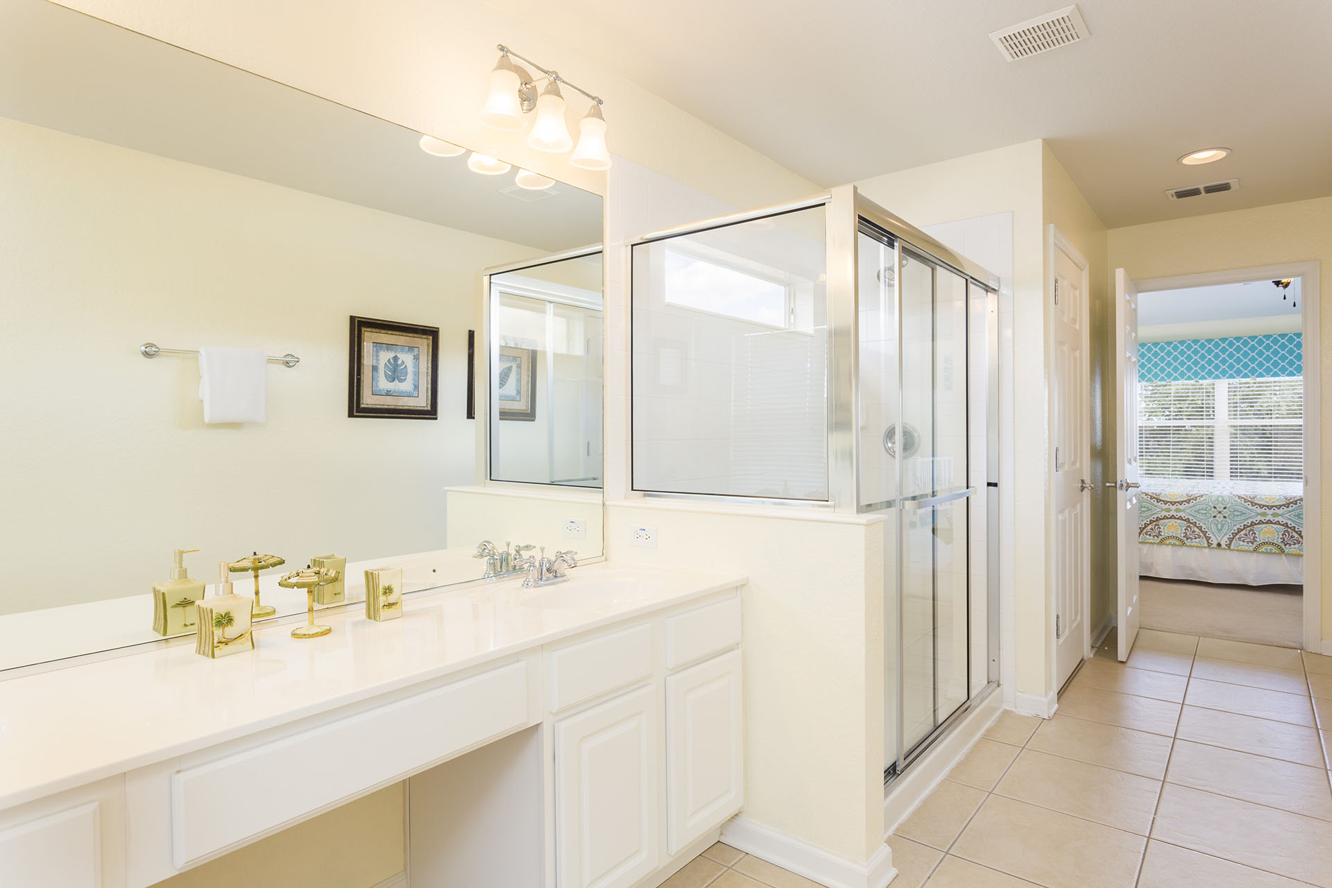 Family bathroom (shower/bath combo, twin vanities)
