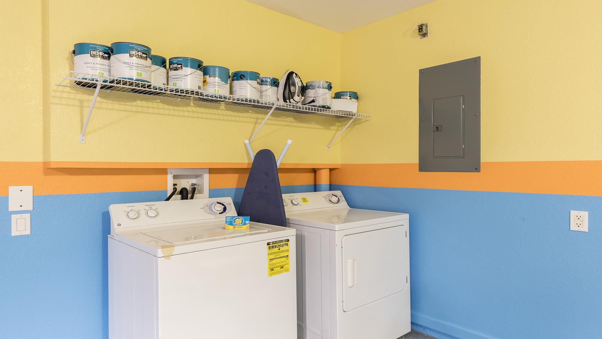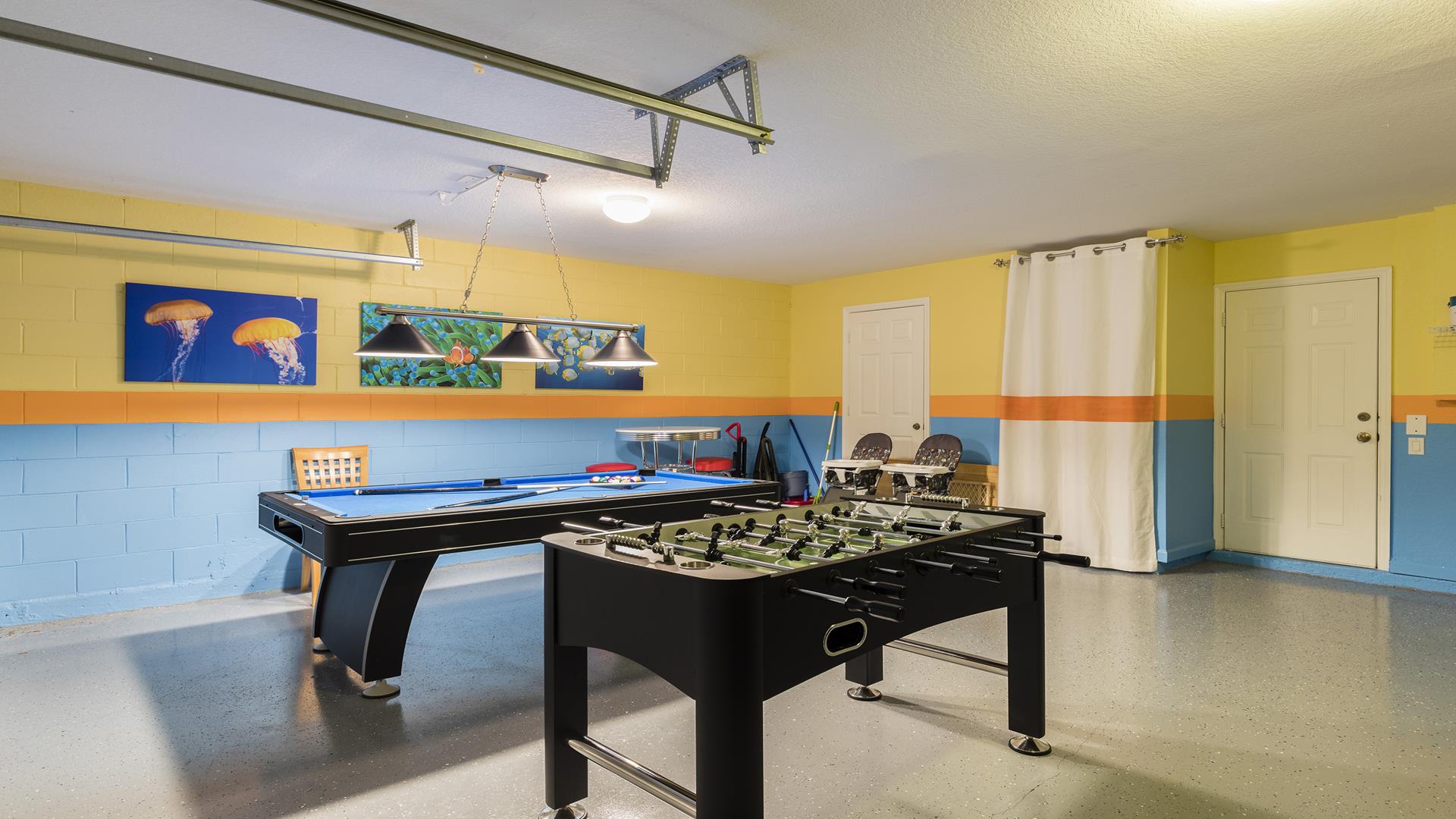 Games room has an air hockey, foosball, and pool table, 2 seat high top table, and laundry is located in there as well