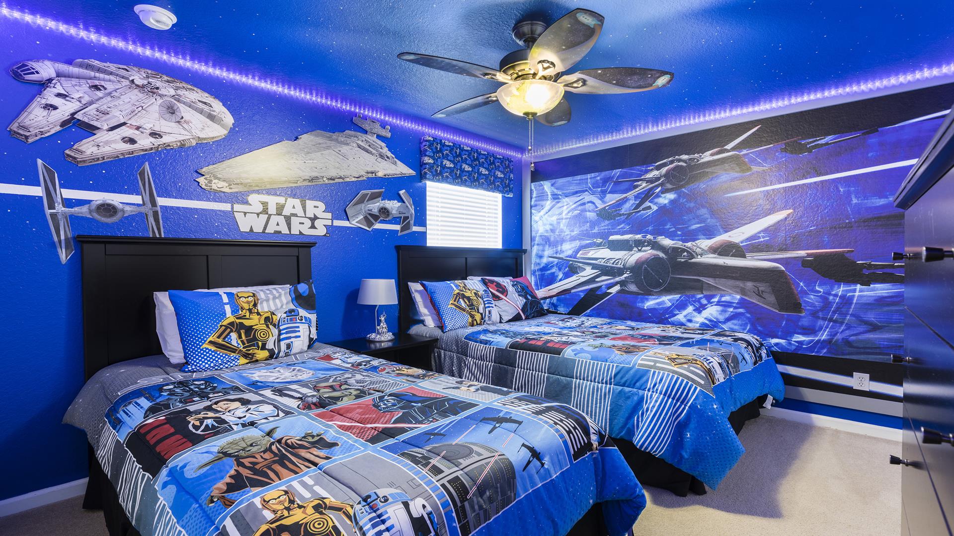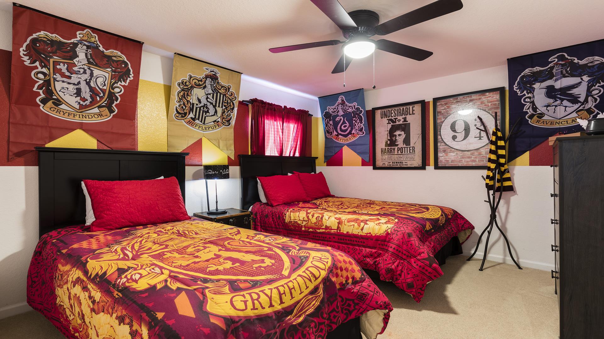 Themed bedroom with a Twin and Full sized bed as well as an en suite (shower/bath combo)