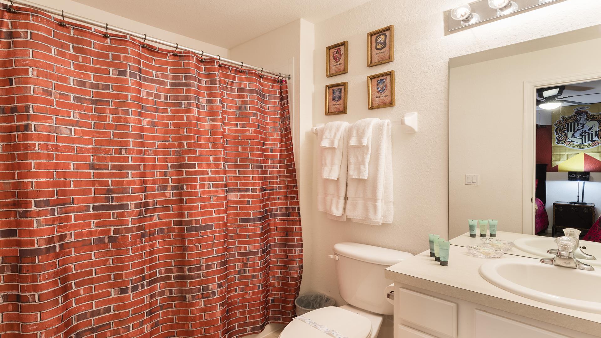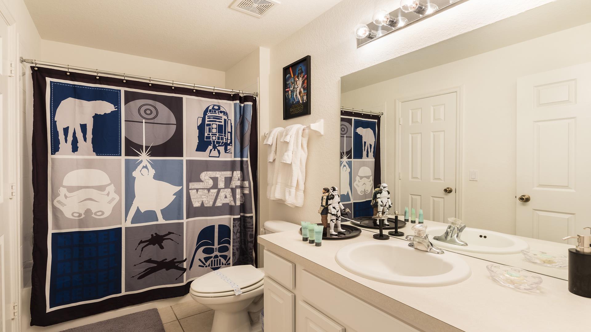 Themed bedroom with a Twin and Full sized bed as well as an en suite/family bathroom (shower/bath combo)
