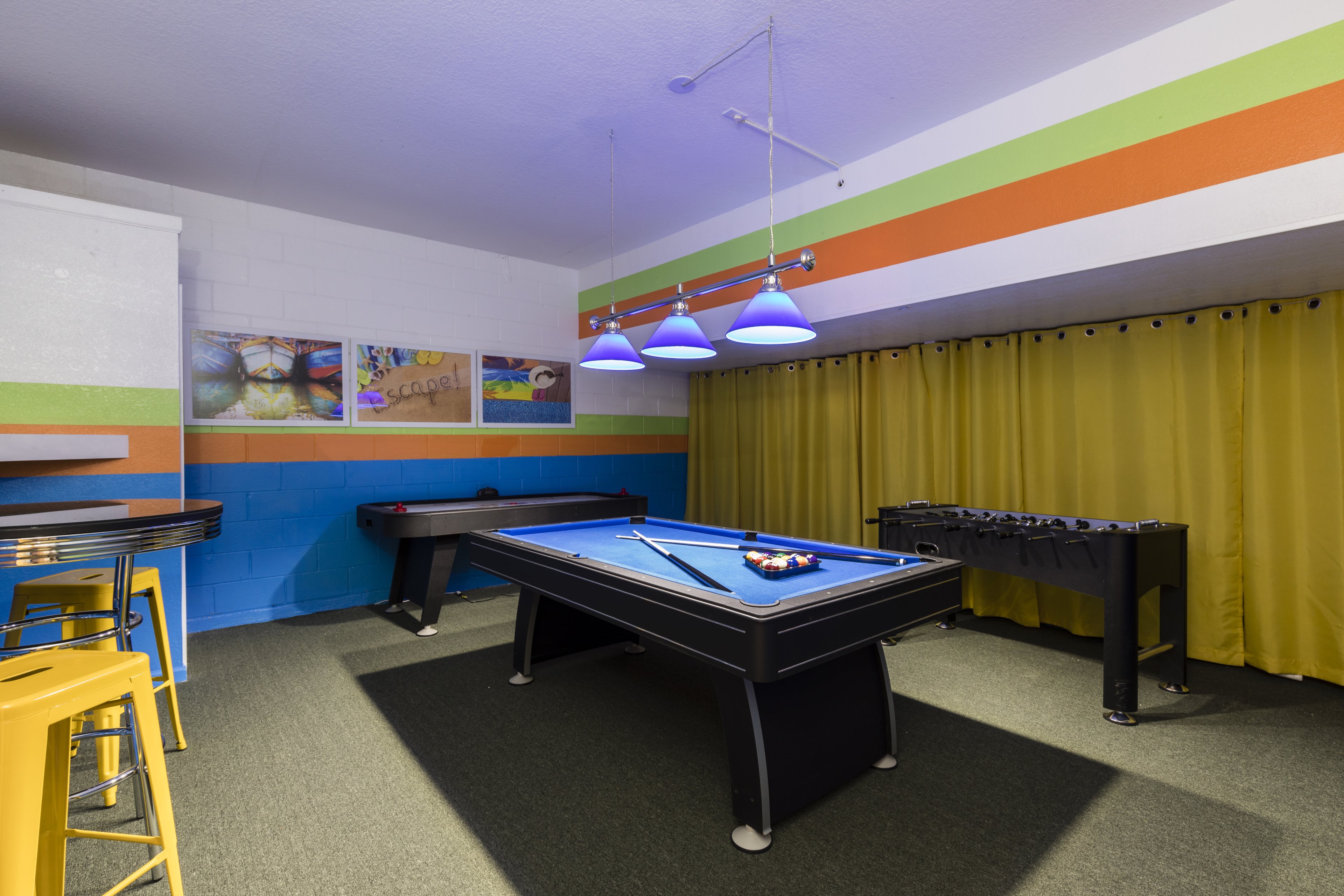Games room has a pool, air hockey, and foosball table as well as 2 seat high top table