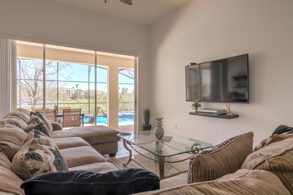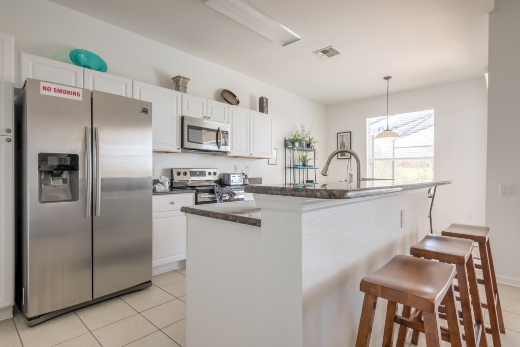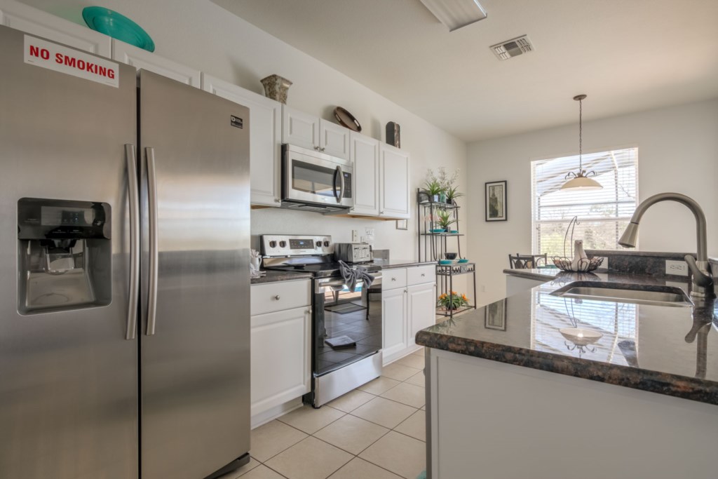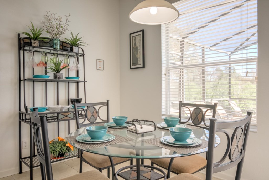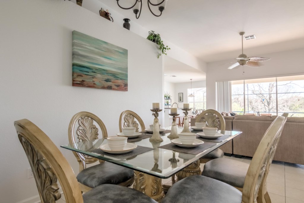 Let’s start with the living room. This room is modern and has a large sectional sofa with a large flat screen TV mounted on the wall. This is a great place for everyone to get together and watch a movie on the TV after a long day out at the parks. Immediately behind the living room is the large kitchen. It is fully-equipped with everything you may need to cook during your stay, has granite countertops, modern appliances, and has a large island that doubles as a breakfast bar. Just off the kitchen is a breakfast nook with seating for four. It also has patio doors that lead to the pool (we’ll go over this a little later on). If you need a little more seating, there’s a formal dining room with ornate furniture that seats up to six people.