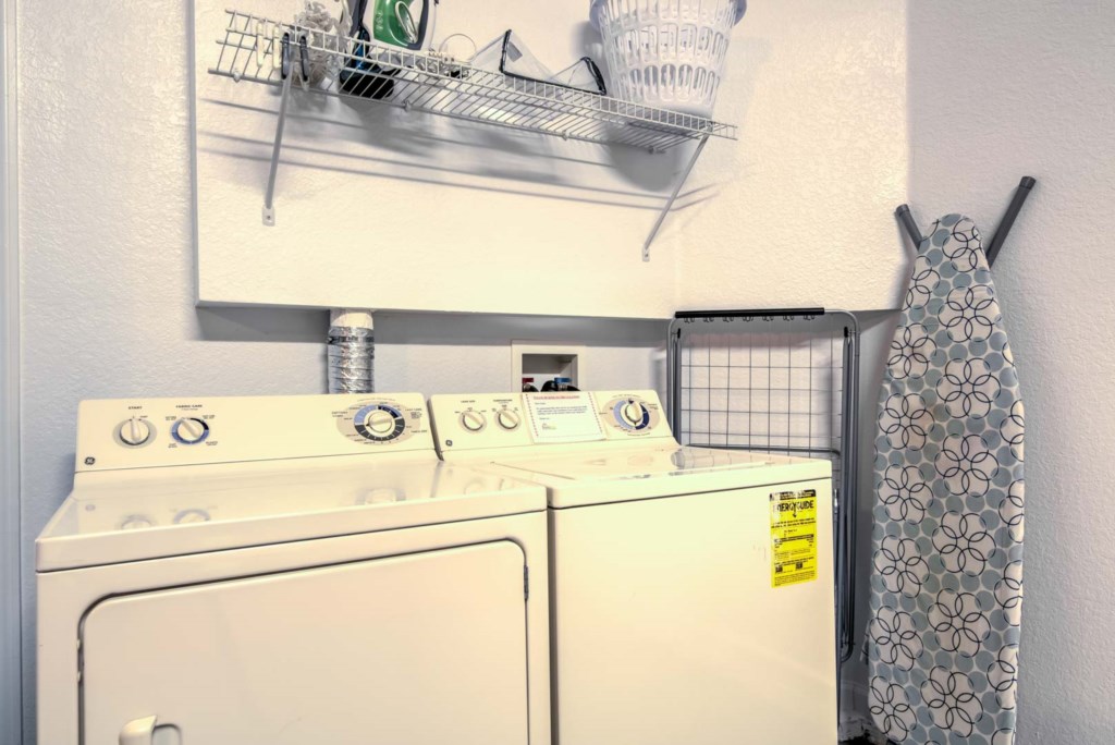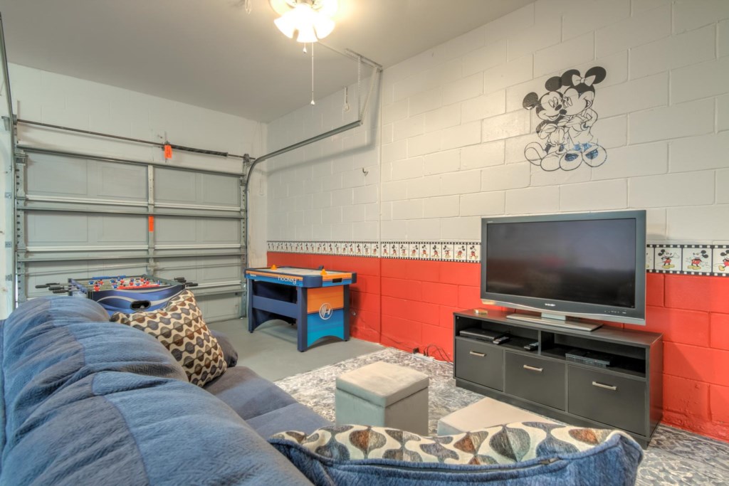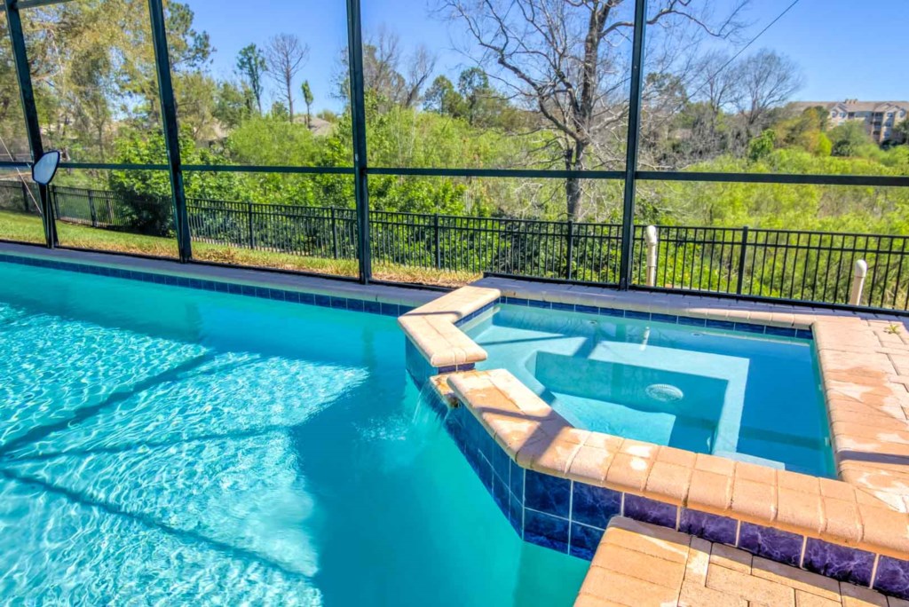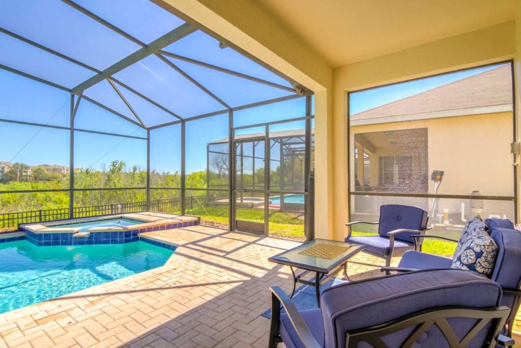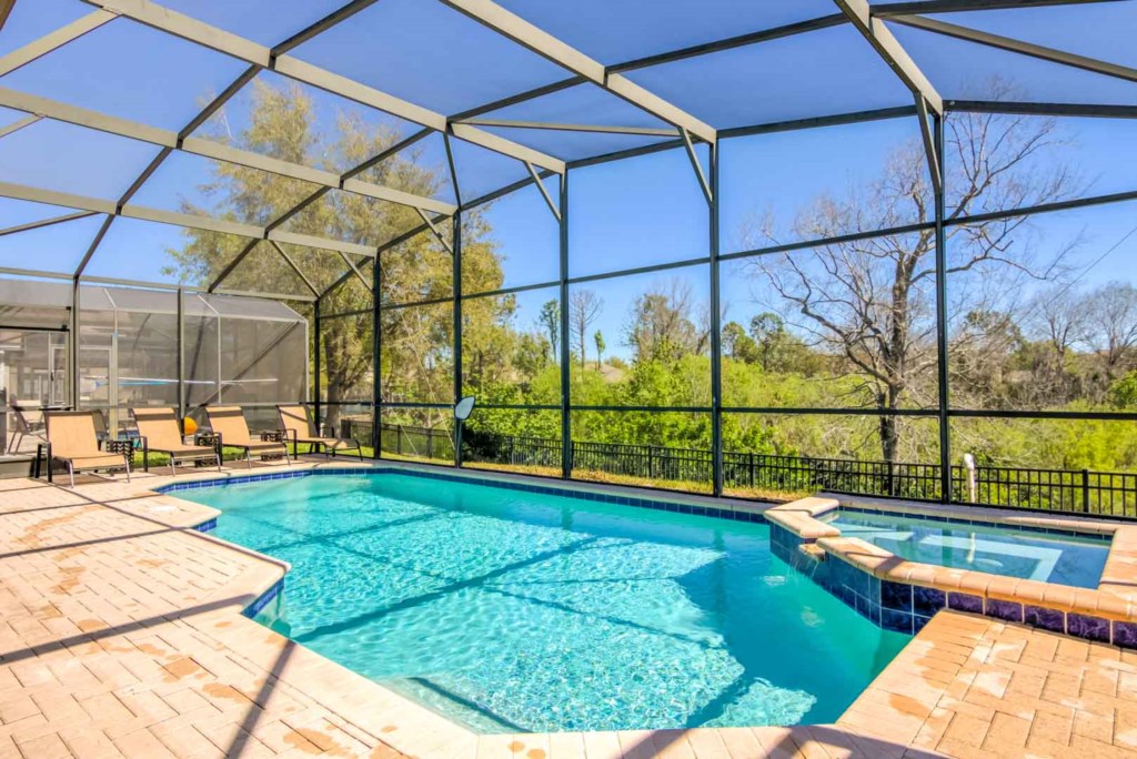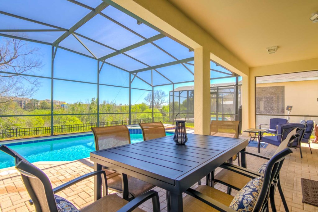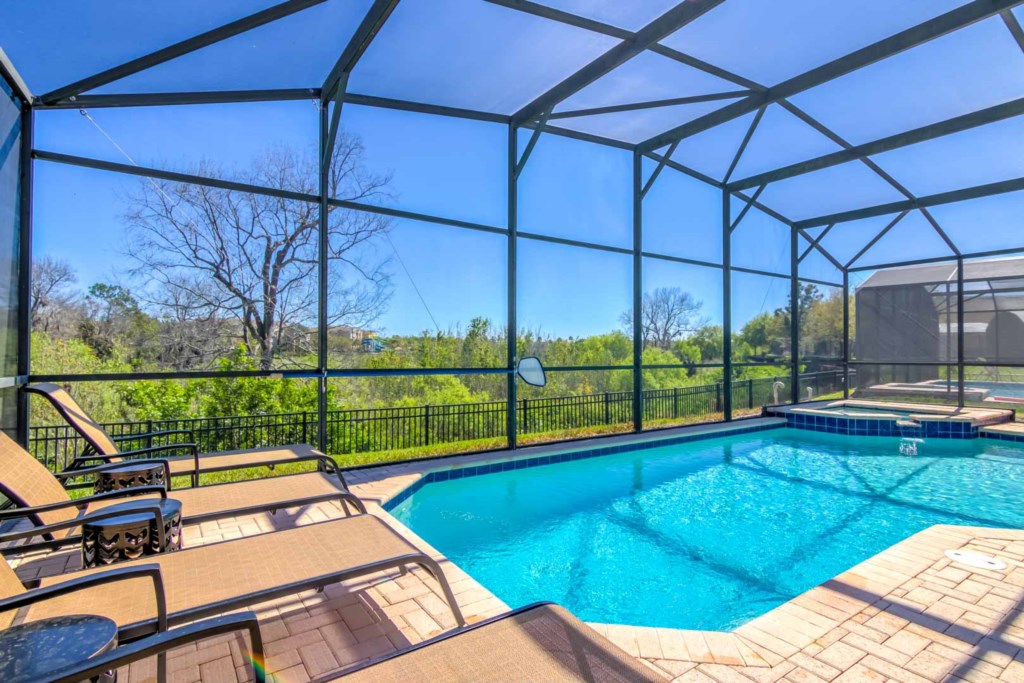Head to the garage, and you’ll enter a games room, which comes with a basketball hoop game and a pool table. If you’d rather be outside, there’s a large pool and spa. The pool area is screened in and has plenty of sun loungers for sunbathing and a large table and 6 chairs under the covered lanai for everyone to gather around and enjoy the Florida weather. There are no rear neighbors. Instead, you get to enjoy a view of trees and greenery.