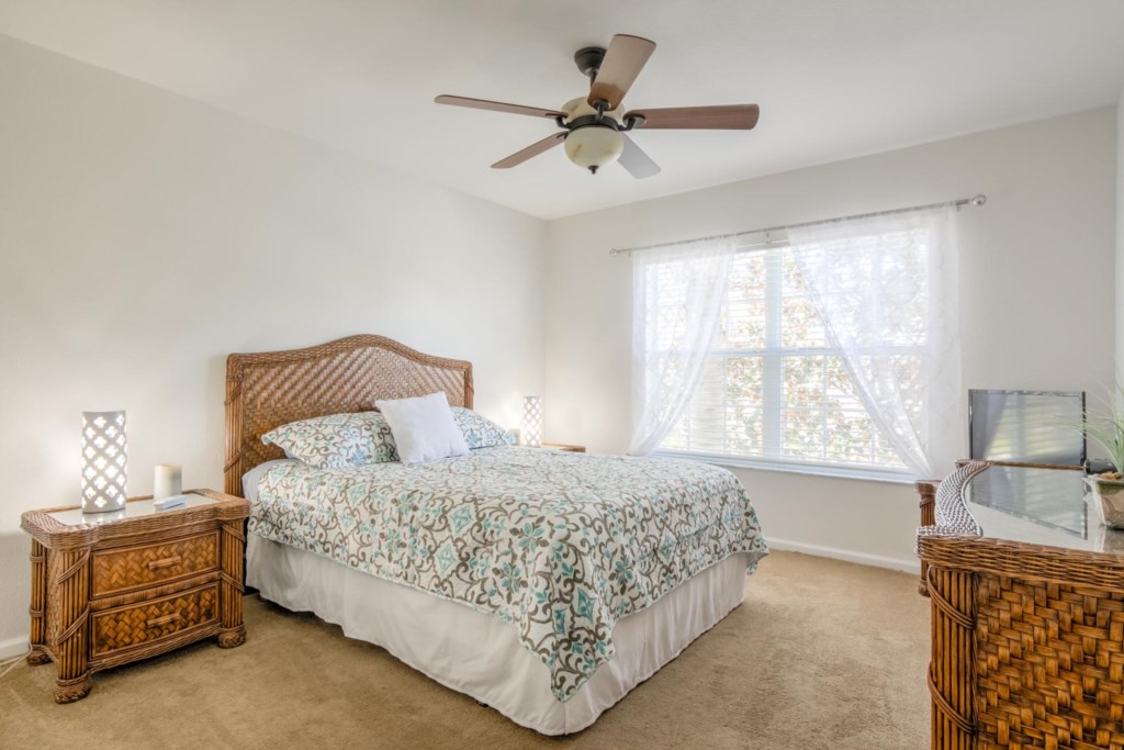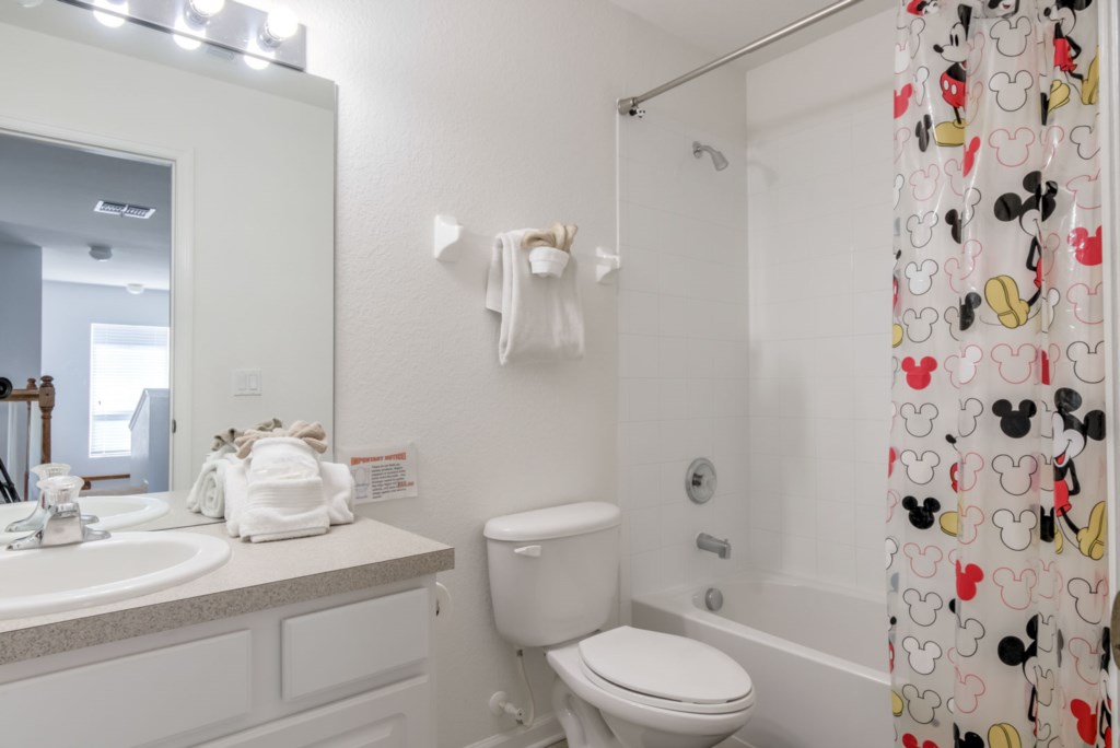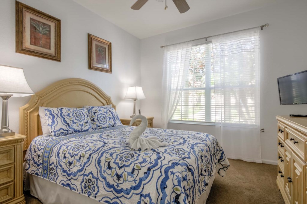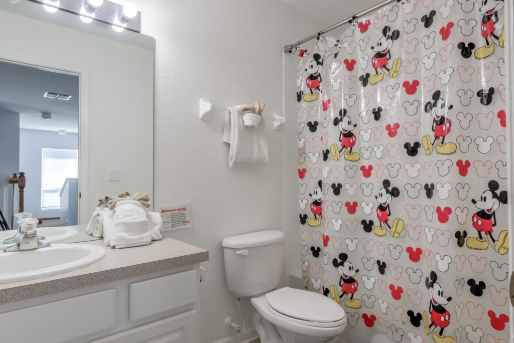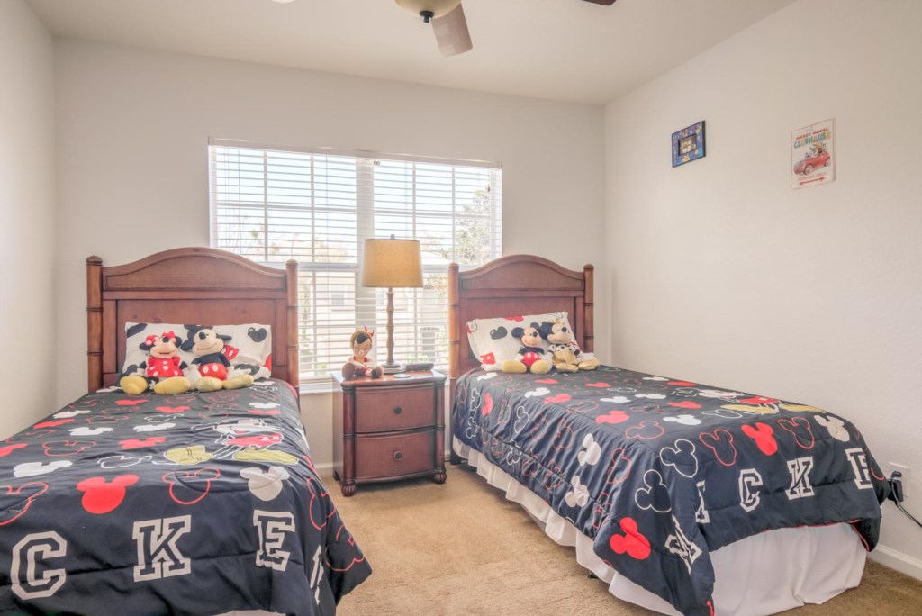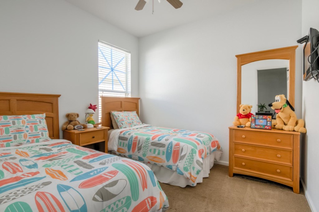 There are 5 bedrooms. The first bedroom, the master bedroom, has a king-size bed, flat screen TV mounted to the wall, and an en-suite bathroom with dual vanities. The second bedroom has a queen-size bed. The third bedroom is Disney themed and has two single beds. This room is perfect for kids. The fourth bedroom is large and has a queen-size bed, and the fifth bedroom is also Disney themed and is perfect for kids. All rooms come with their own TV.