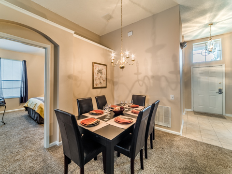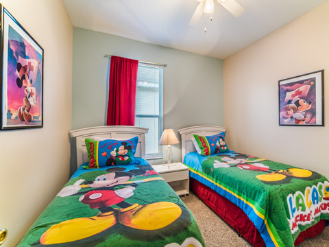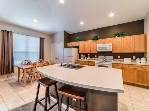 The bedrooms consists of 1 king bedroom, 1 queen bedrooms and 2 twin bedrooms – flatscreens compliment each room and the kids will love the Mickey themed bedroom. A large kitchen and dining room are a perfect place to gather for family dinners after a day spent at the parks. With plenty of seating at the kitchen bar and dining room table, everyone has a spot for dining together.