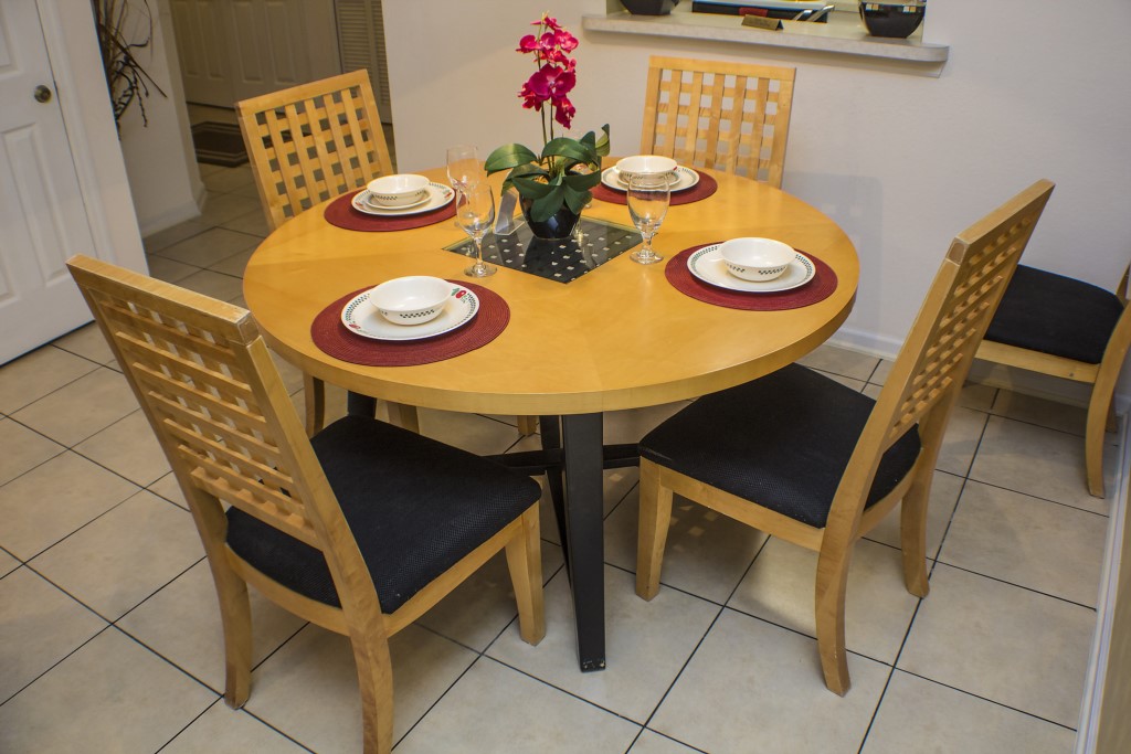 The kitchen has more than enough space to cook for a family. It is beautifully done up and includes a stove, oven, microwave, fridge and even has a dishwasher. The tiled floor and granite tops make the room easy to clean and maintain. Next to the kitchen through an arched door is the dining room. It has a cozy warm feel to it, and its round wooden table can seat 4.